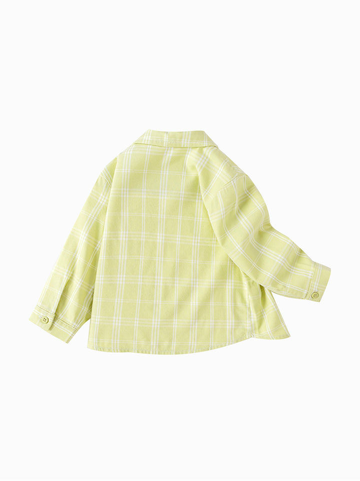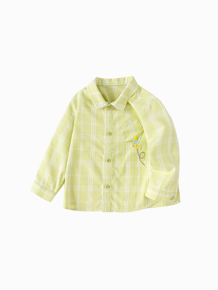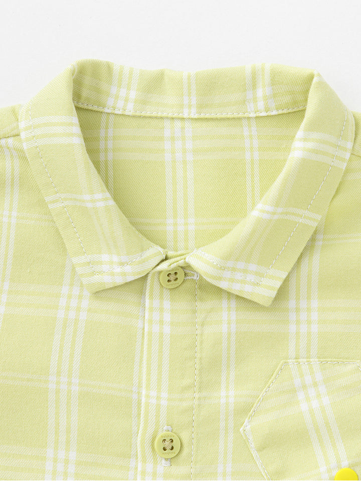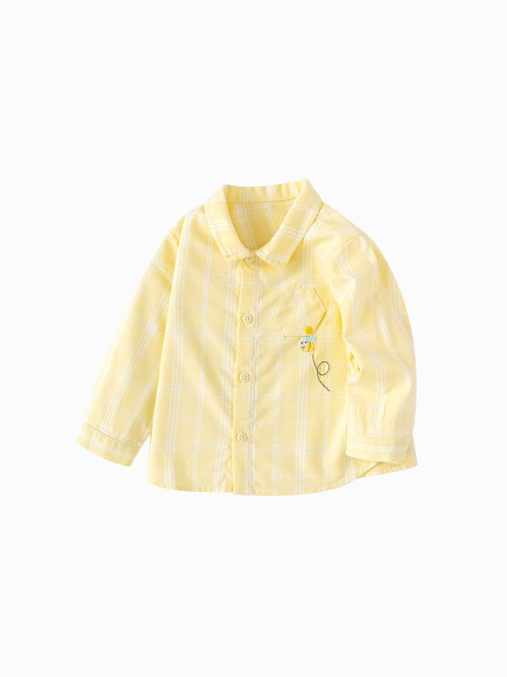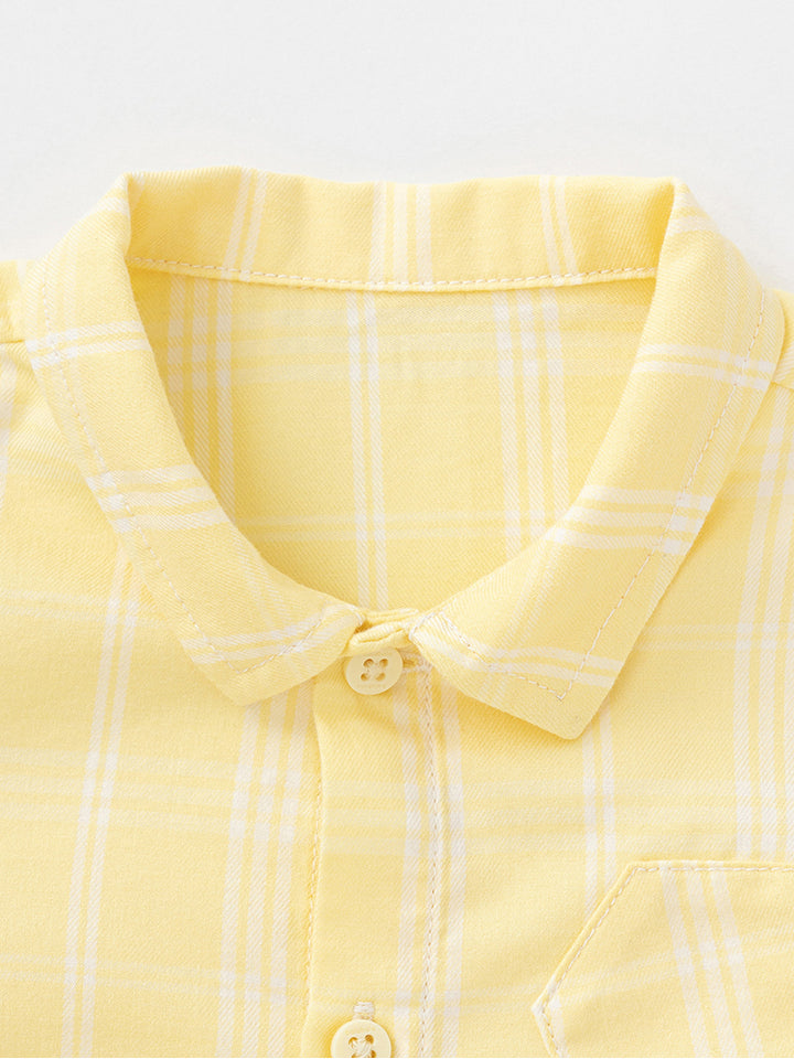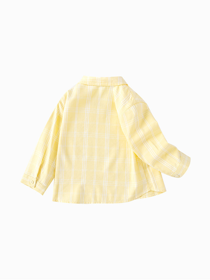 قميص ولادي بأكمام طويلة، مزين بنمط مخطط على كامل التصميم، يأتي بأزرار للإغلاق وبياقة كلاسيكية عادية
