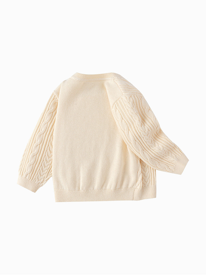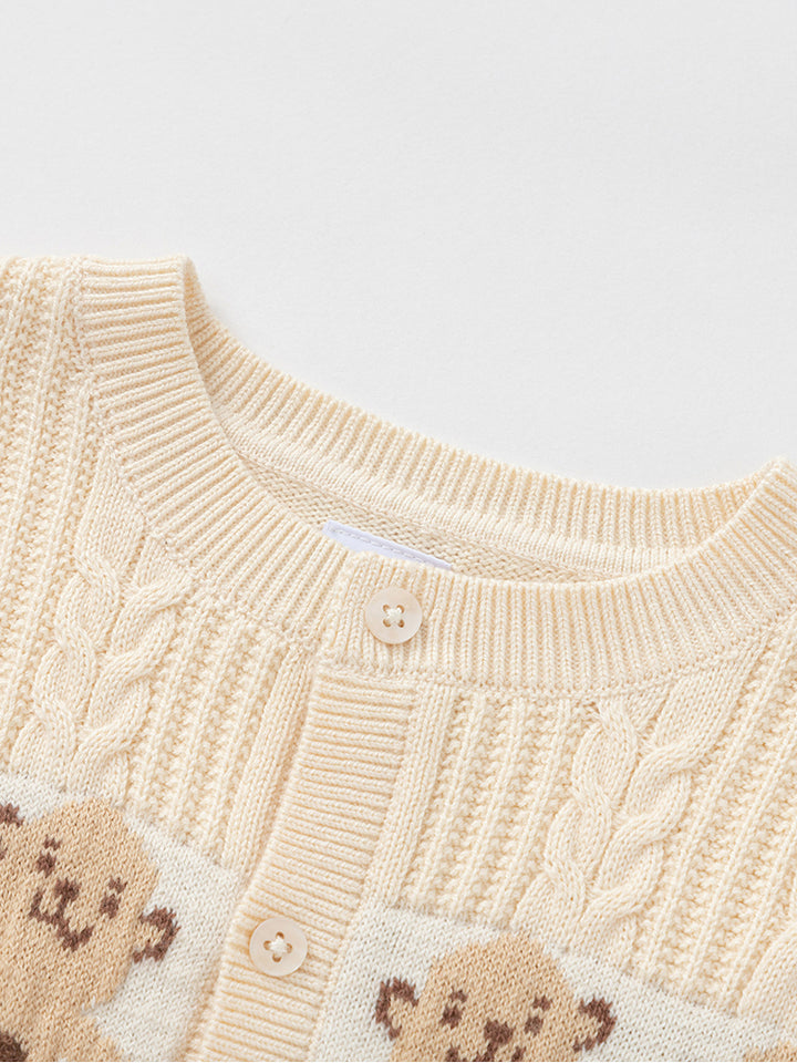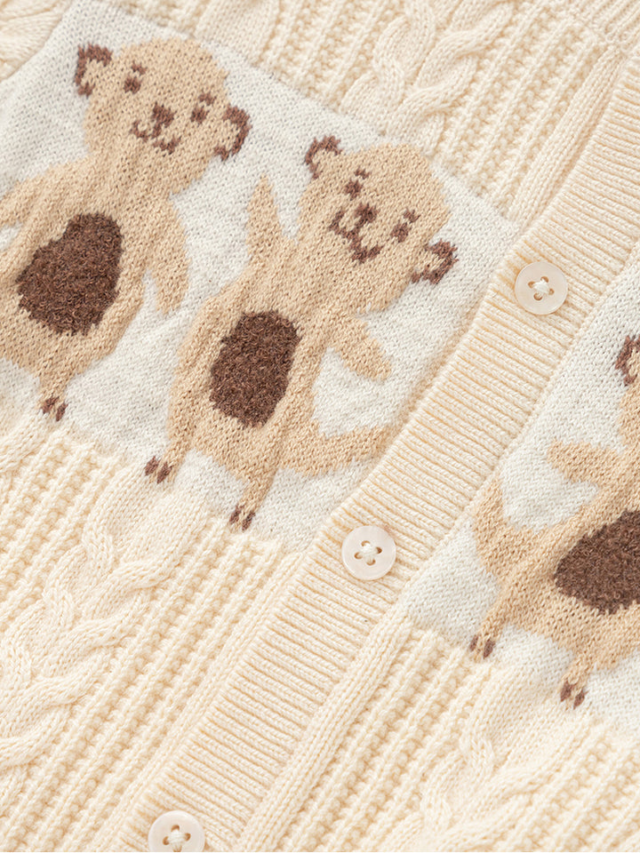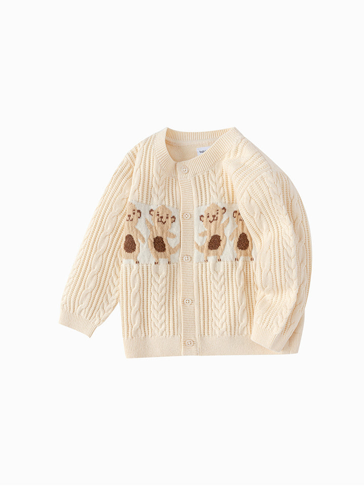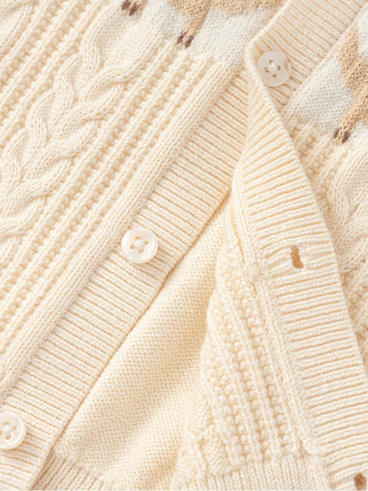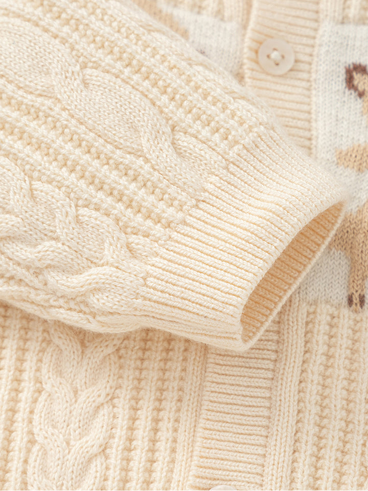كارديغان ولادي باكمام طويلة وبخامة نسيج محبوك مزين بتفاصيل طبع، ياتي بأزرار للإغلاق من الجهة الأمامية