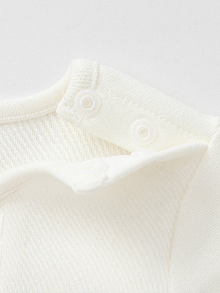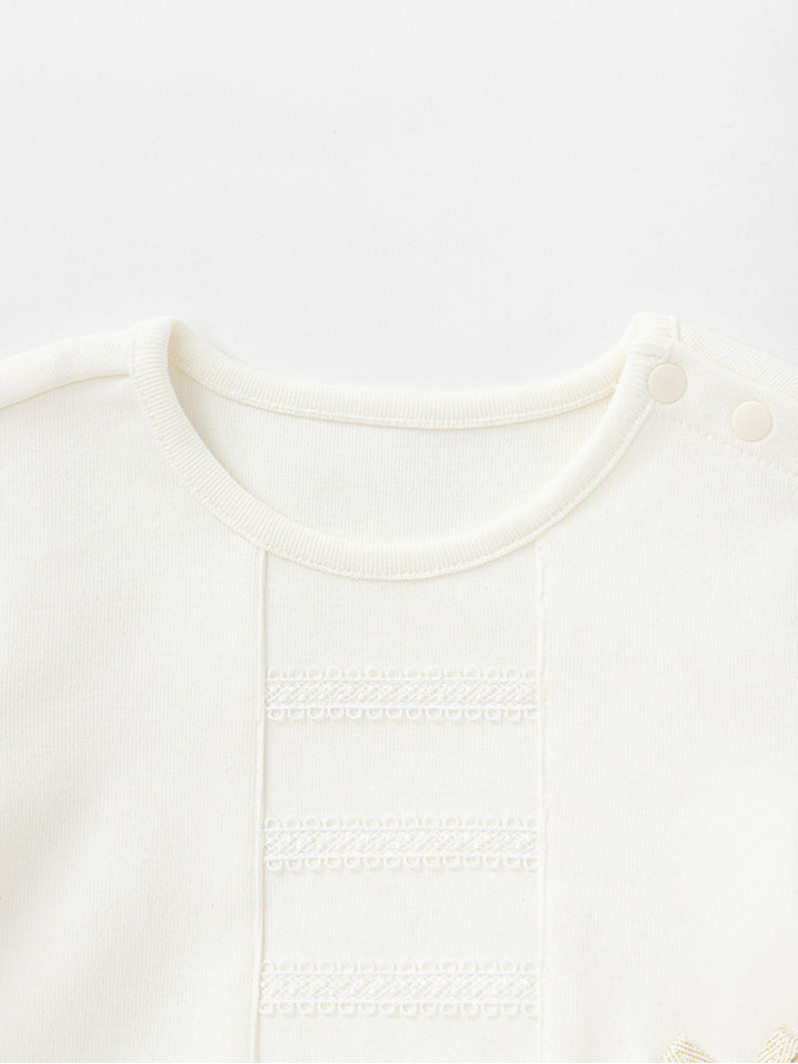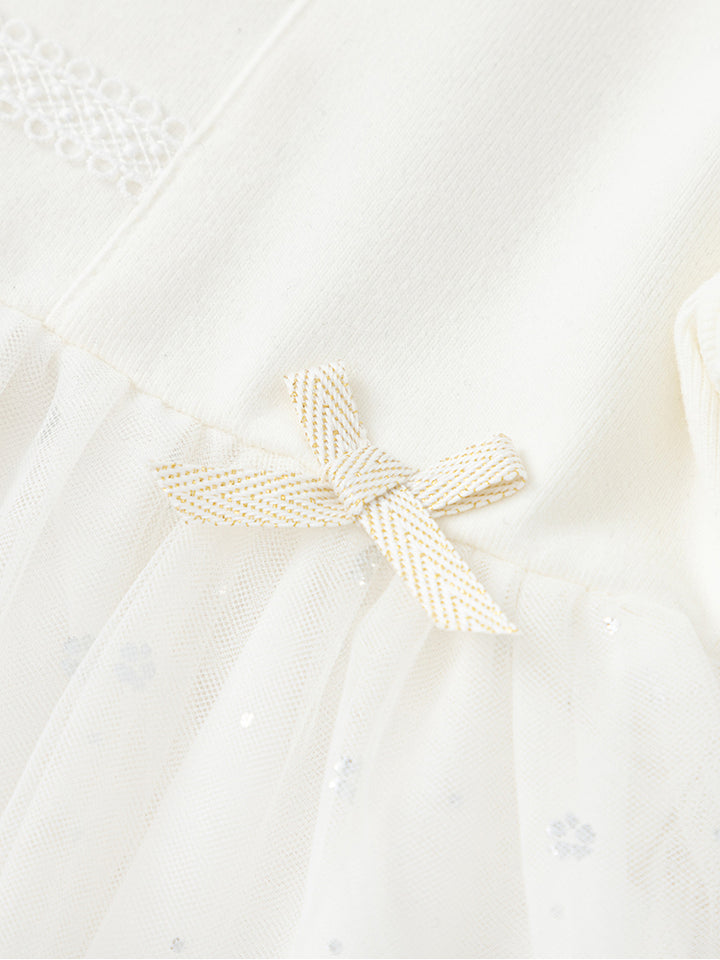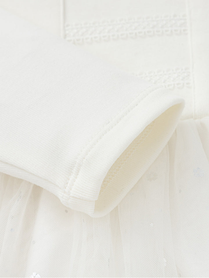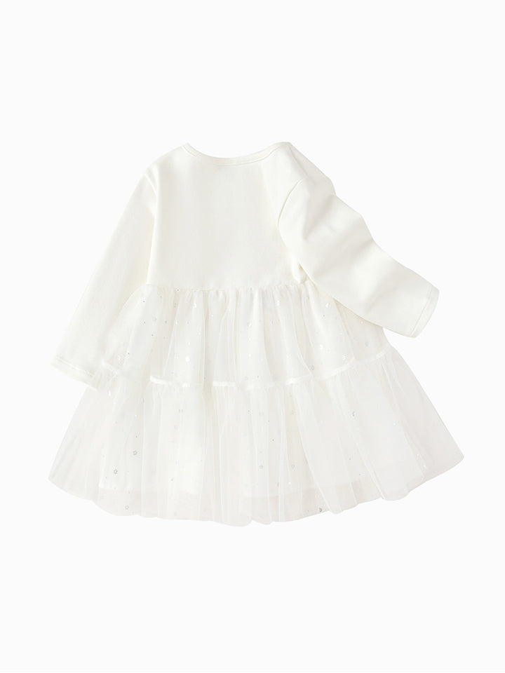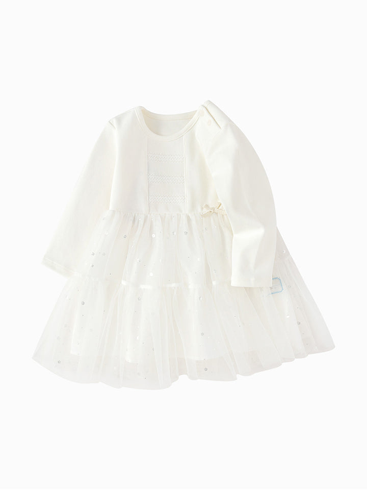 فستان بناتي بأكمام طويلة ذو لون موحد، مزين بطبقة كشكش وتفاصيل تطريز، ياتي بأزرار للإغلاق