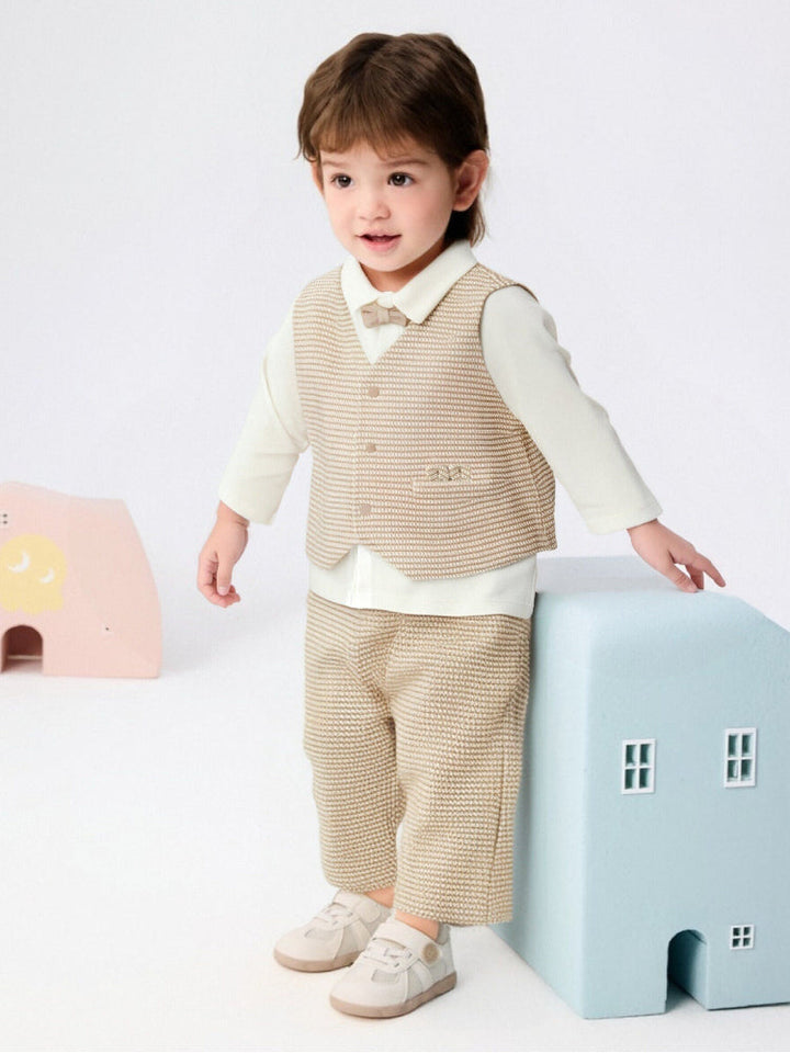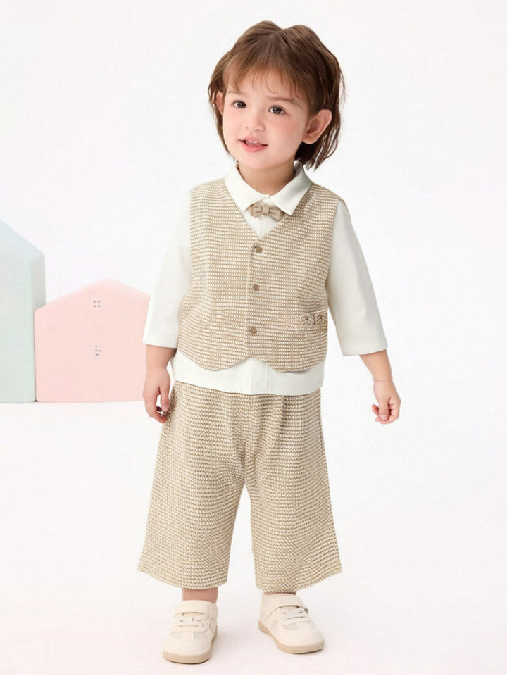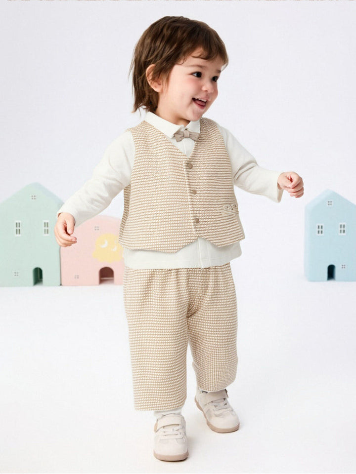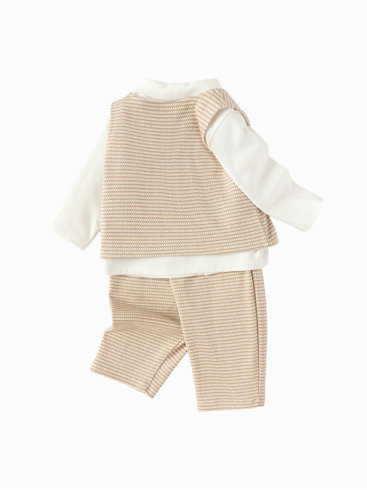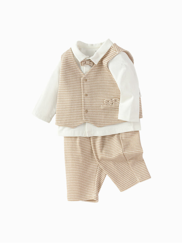 طقم أنيق مكون من سترة محبوكة بنقشة ناعمة مع ربطة متناسقة وبنطلون واسع الساقين يتميز ببطانة مريحة وقماش ناعم يمنح إحساسًا بالراحة مع مظهر أنيق يضفي لمسة راقية تناسب الإطلالات المتنوعة.