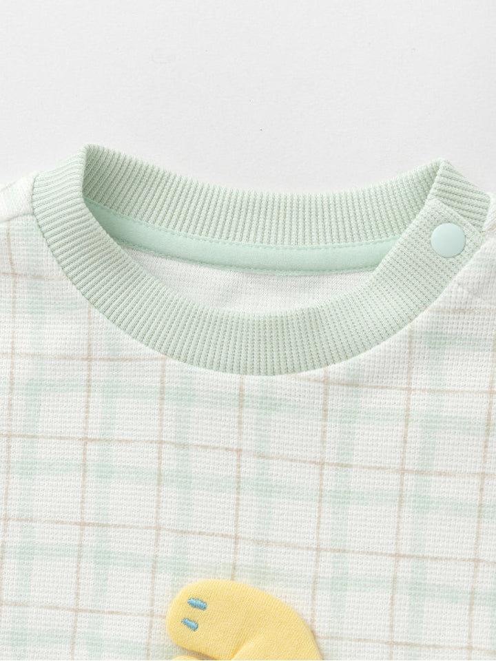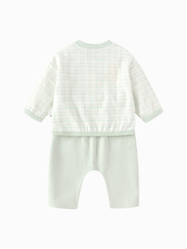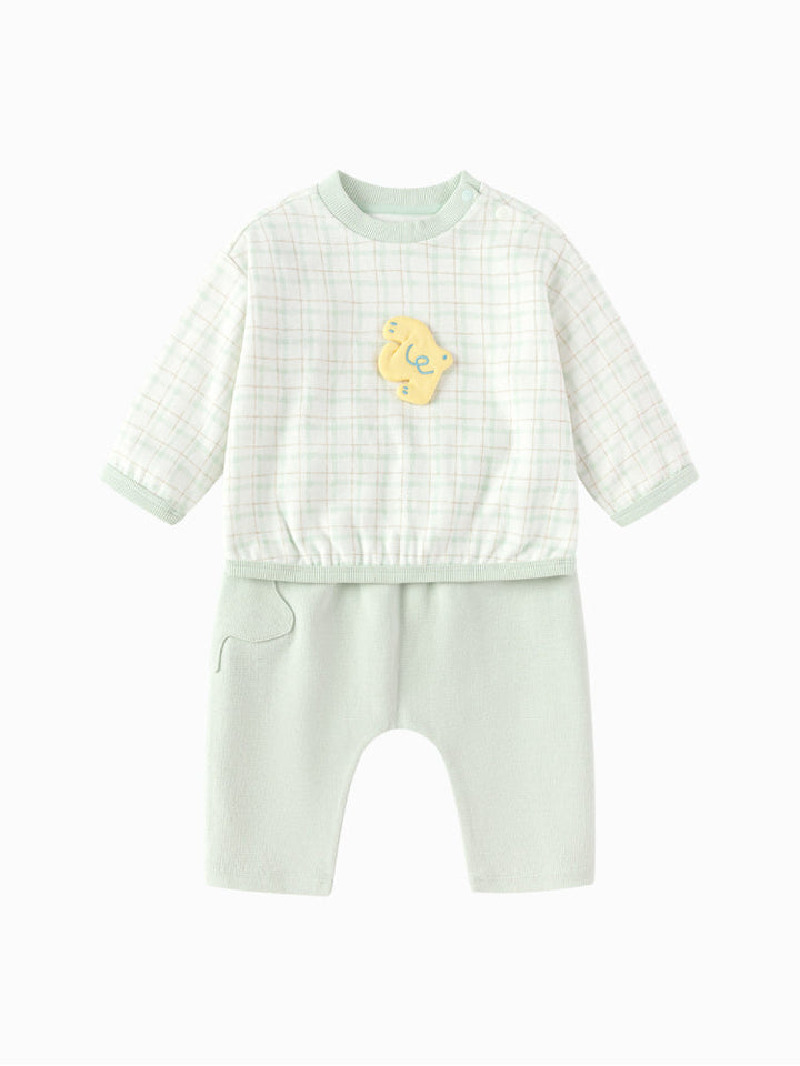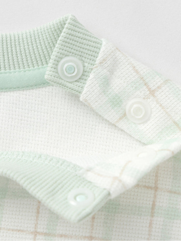 قطعة مريحة تتميز بنقشة مربعات ناعمة في الجزء العلوي مع تطريز بارز وبنطلون بلون موحد مصممة بخامة لطيفة على البشرة لراحة تدوم طوال اليوم تجمع بين التفاصيل المرحة والتصميم الكلاسيكي البسيط لإطلالة عفوية وأنيقة.