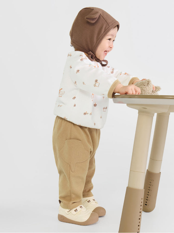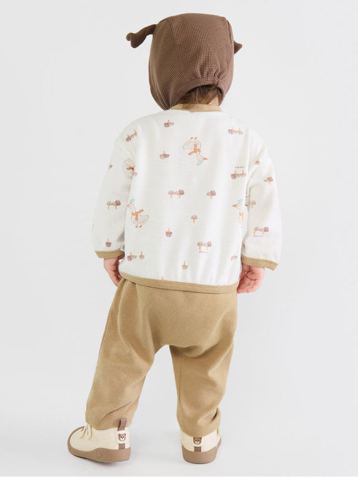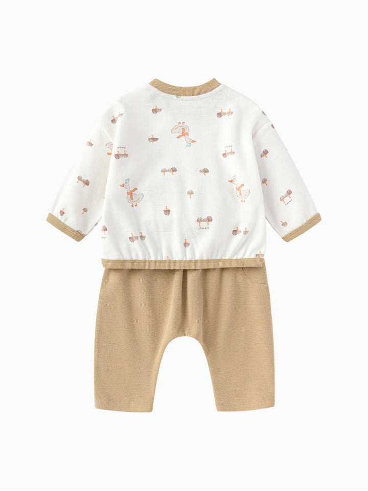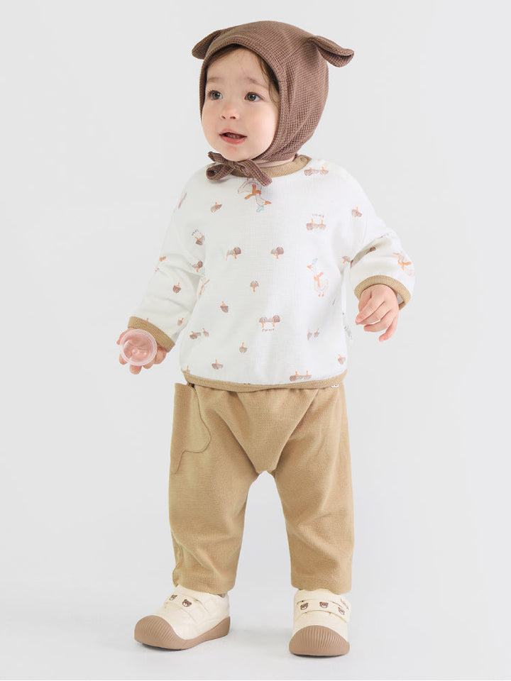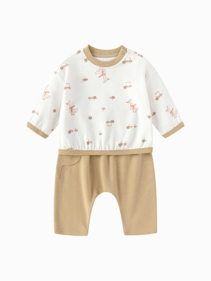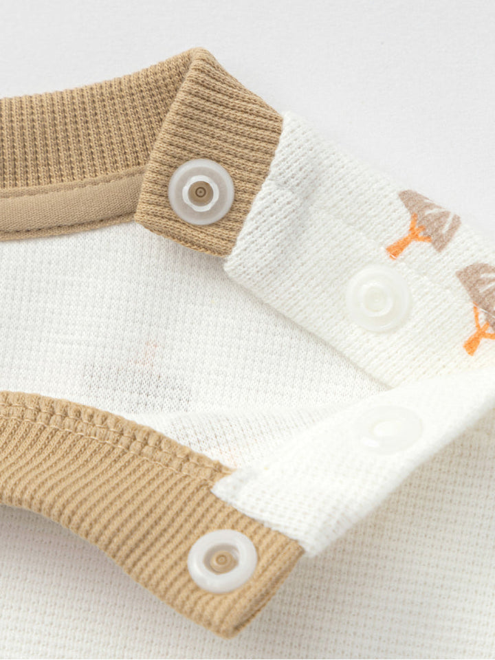قطعة ناعمة تتميز بطبعات مرحة في الجزء العلوي مع ياقة وحواف بلون متباين وبنطلون بلون موحد مصممة بخامة لطيفة لراحة تدوم طوال اليوم تجمع بين الأسلوب البسيط واللمسة المبهجة لإطلالة مريحة وعفوية.