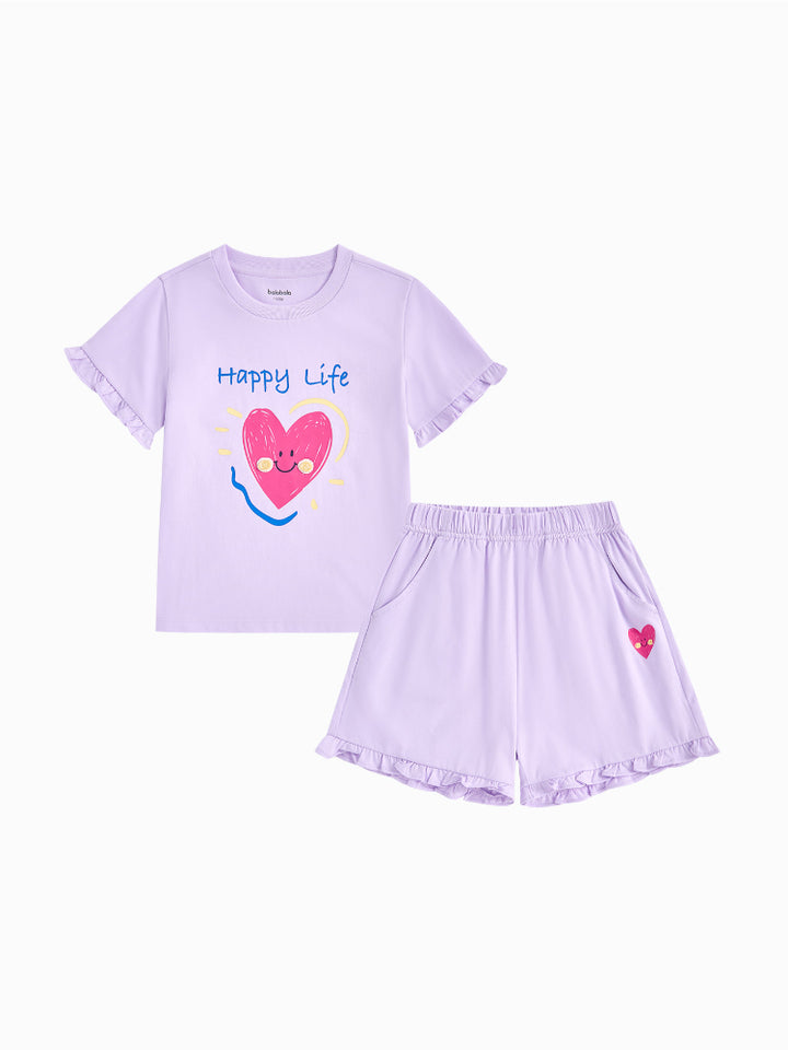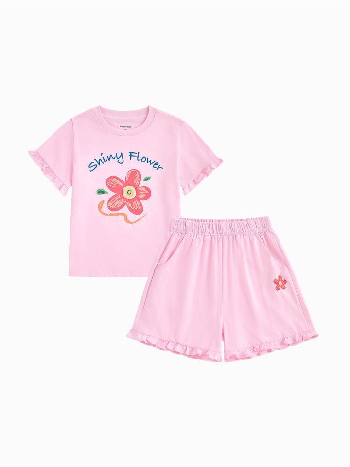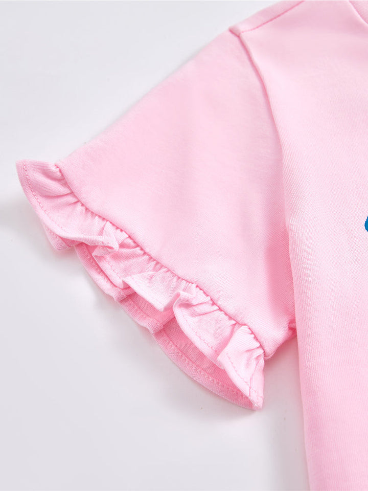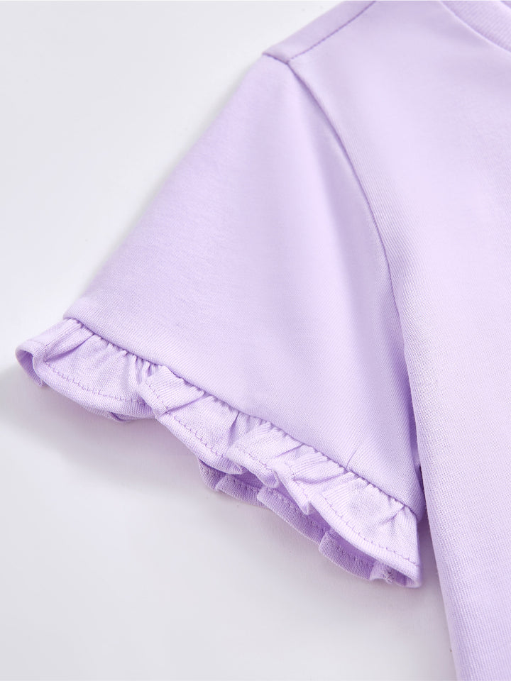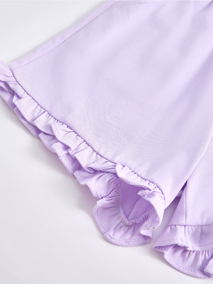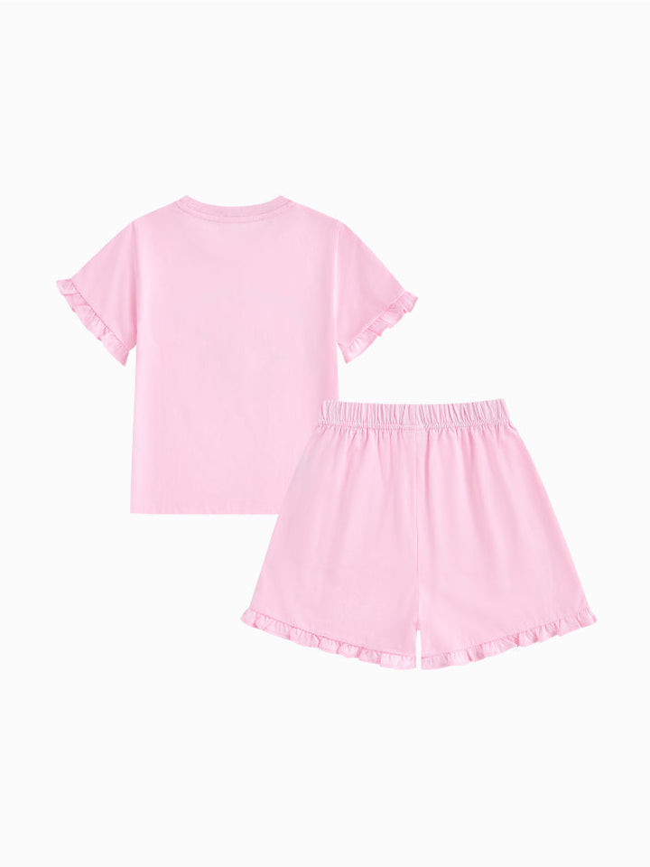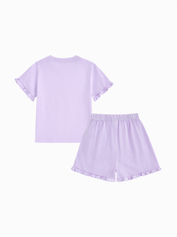 طقم من قطعتين - تيشيرت وشورت مزين بكشكش وطبعات للبنات