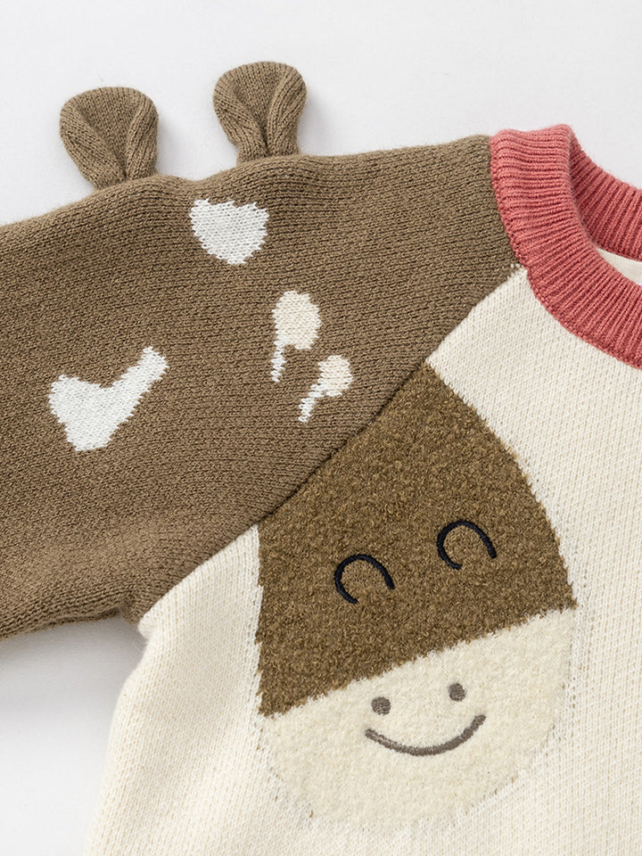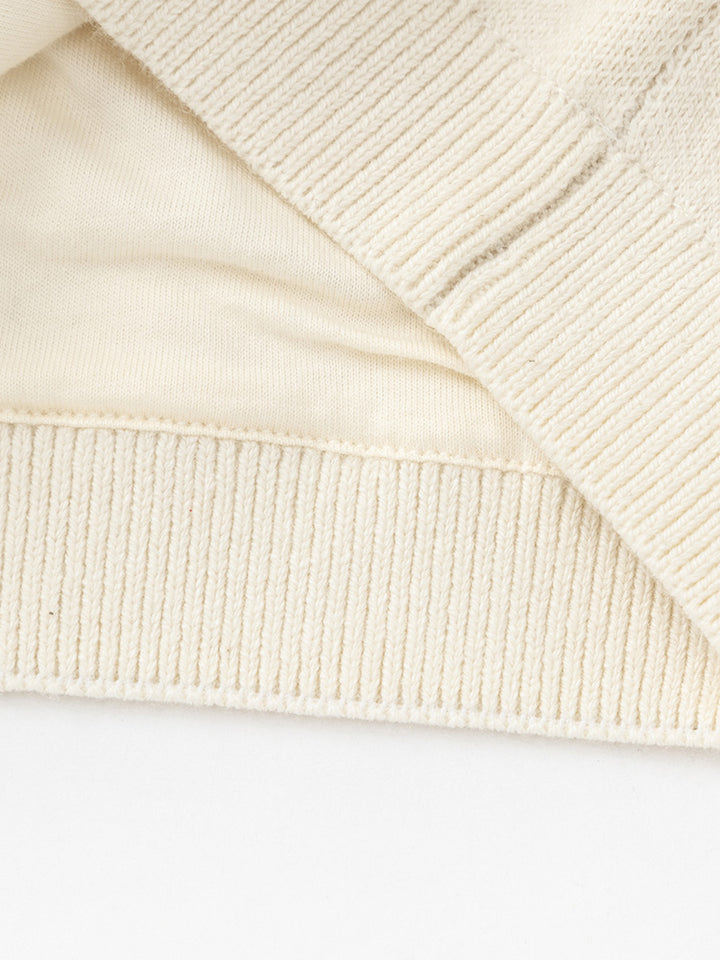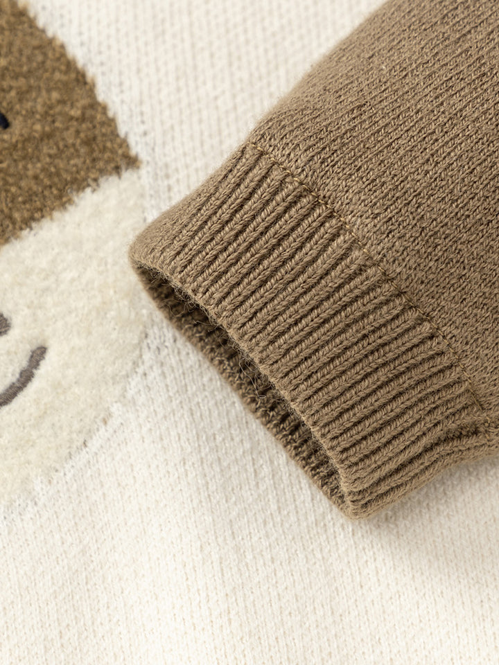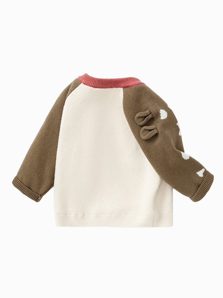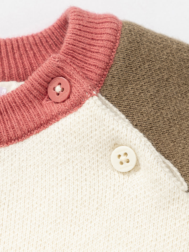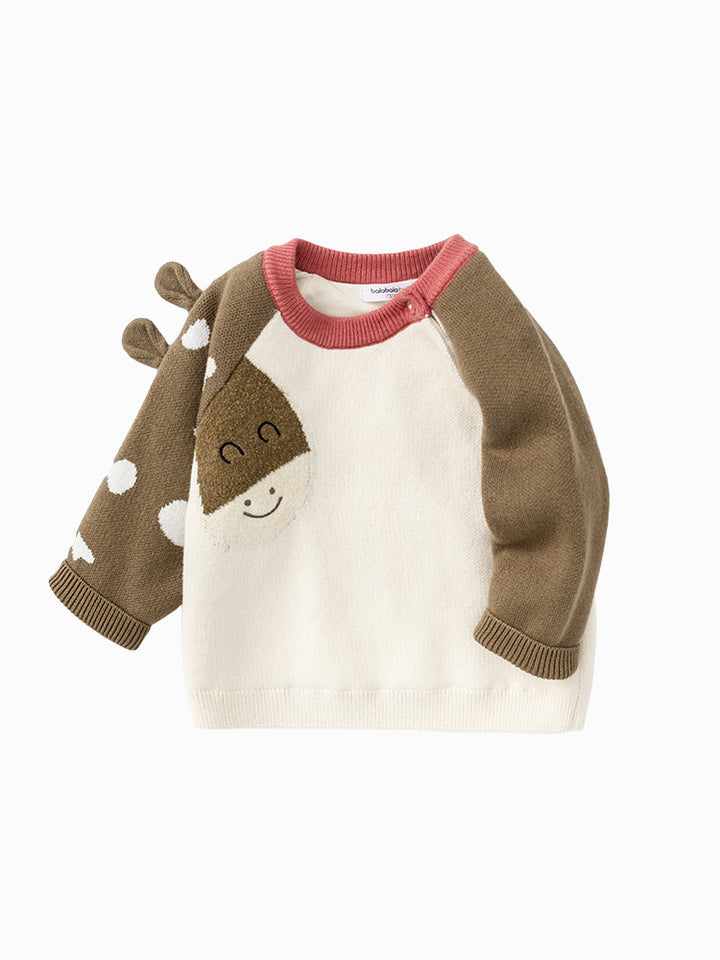 سترة بيبي ولادي بأكمام طويلة، خامة نسيج صوف محبوكة، مزينة بتفاصيل طبعة منسوجة من الجهة الأمامية وأكمام متباينة اللون، تأتي بأزرار للإغلاق على أحد الأكتاف وبياقة مدورة الشكل