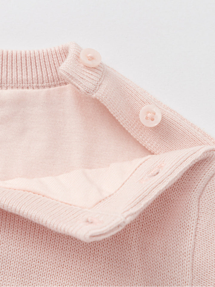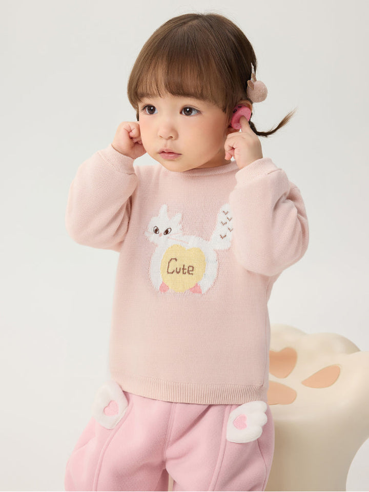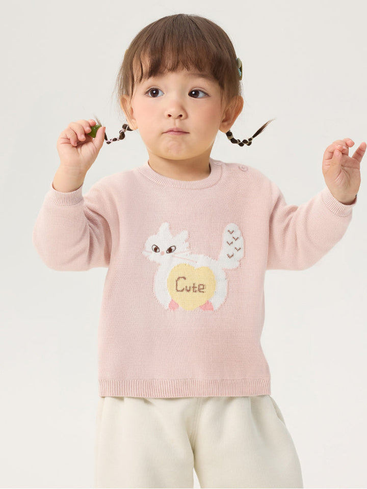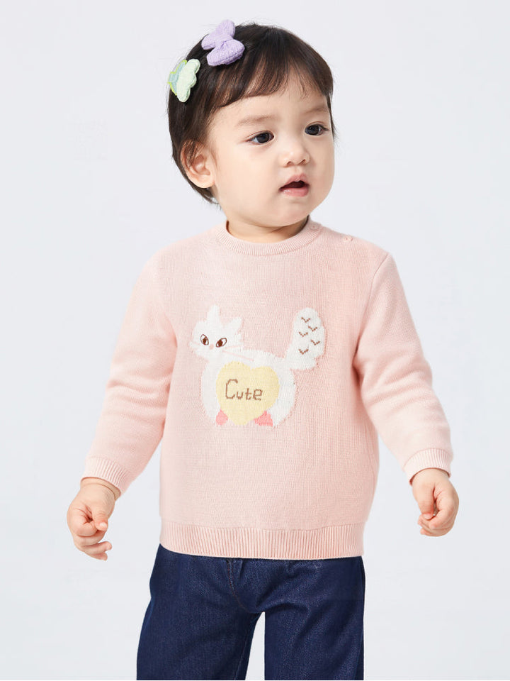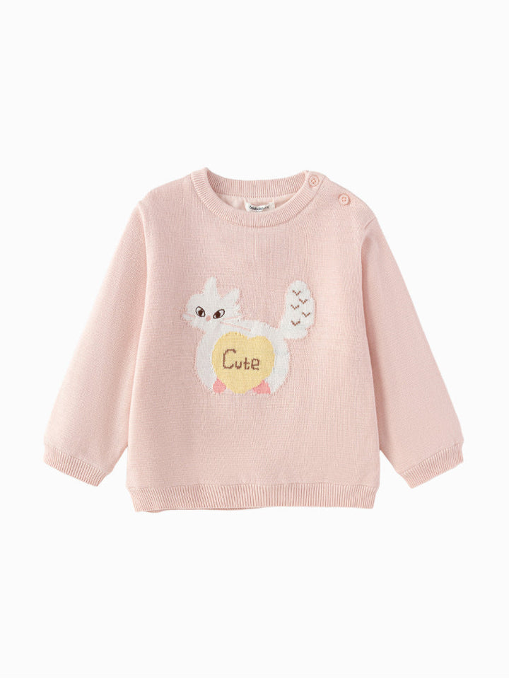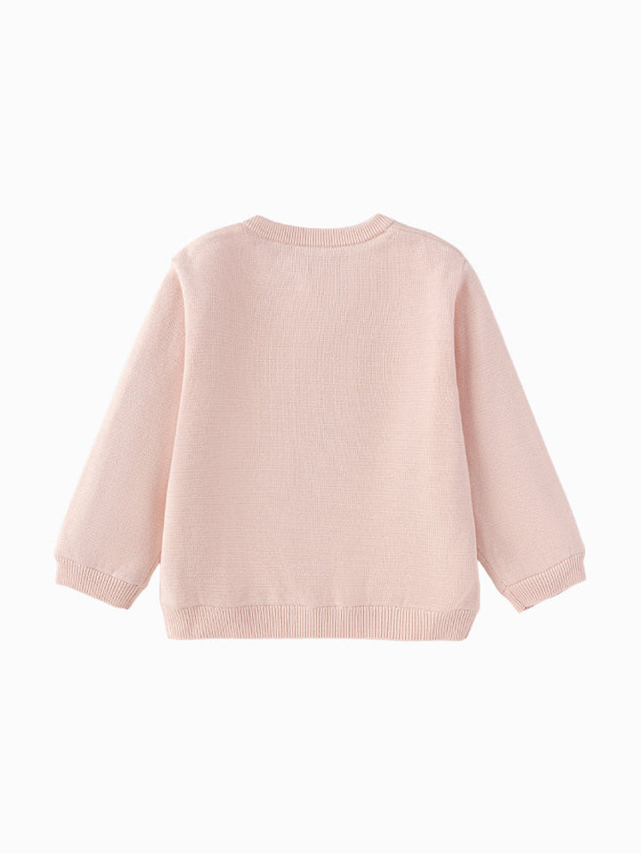 كنزة أطفال بتصميم تريكو ناعم، بأكمام طويلة وياقة دائرية، مزودة بأزرار عند الكتف لتسهيل اللبس. مزينة برسمة أمامية مرحة، وتمنح الدفء والراحة المثالية للاستخدام اليومي في الأجواء الباردة.