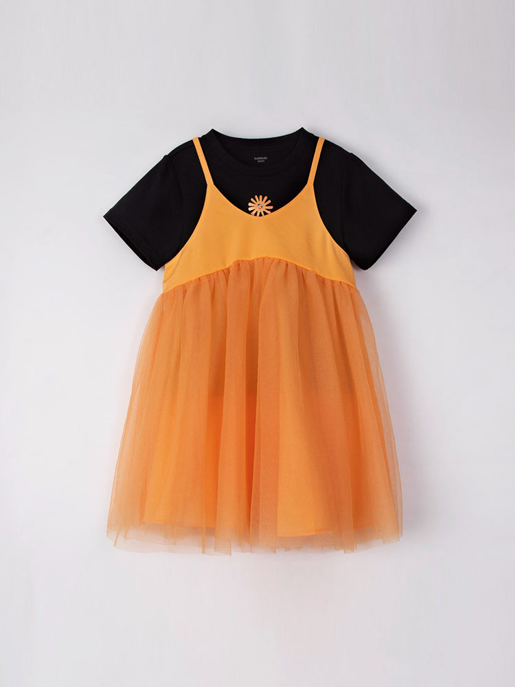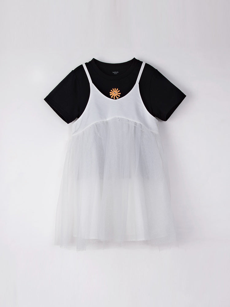 طقم فستان وتيشيرت من قطعتين، تيشيرت بأكمام قصيرة مزينة بطبعة على الصدر من الجهة الأمامية ويأتي بقبة مدورة الشكل، وفستان بدون أكمام وحمالات كتف مزين بطبقة قماش شبك منفوش من الجهة السفلية
