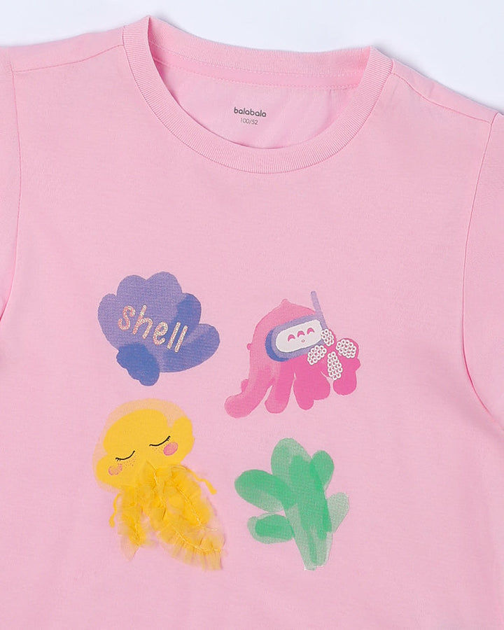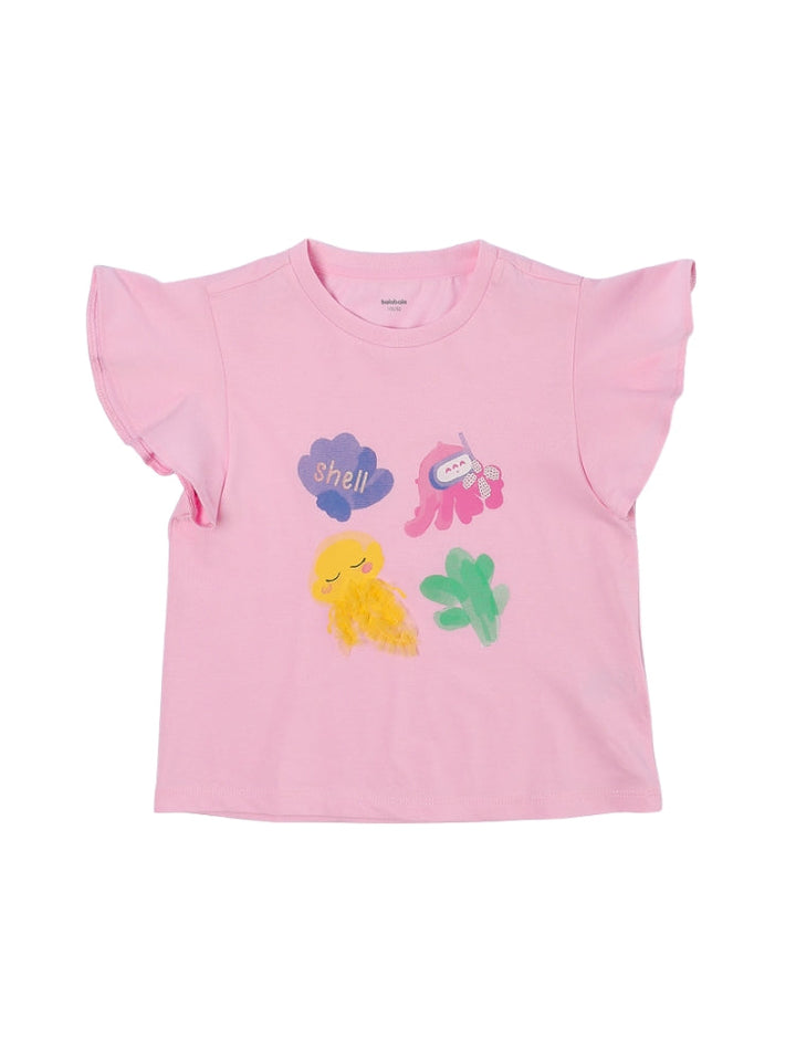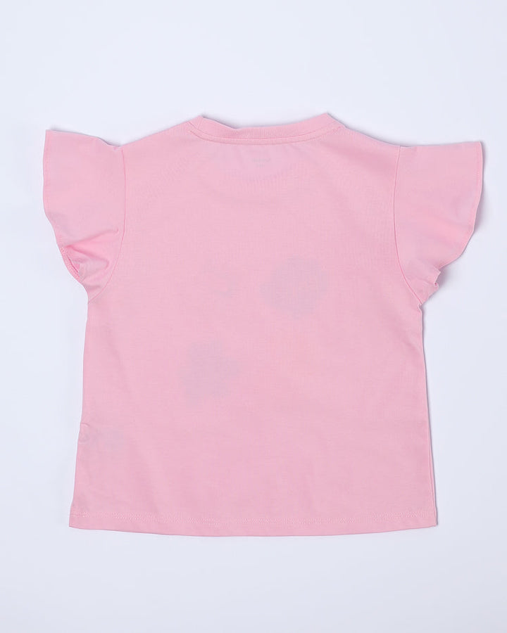 تيشيرت بناتي بأكمام كشكش أنثوية مزين بطبعة مرحة في الأمام. خفيف ومثالي للإطلالات اليومية.