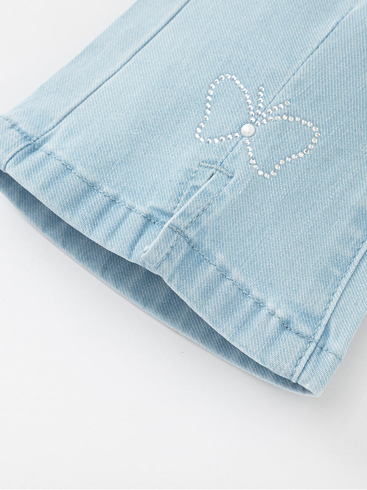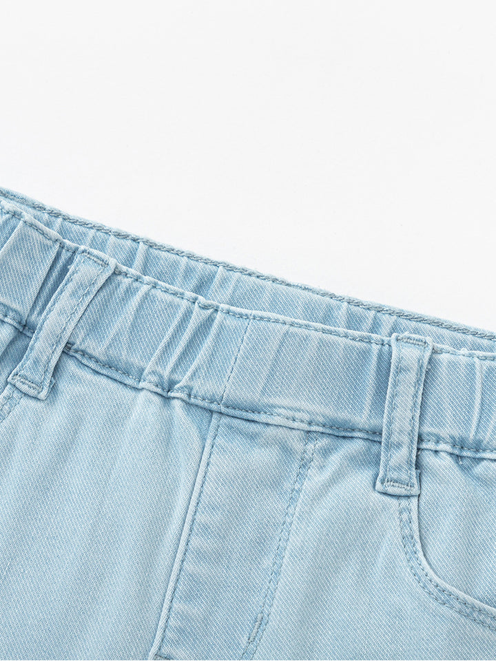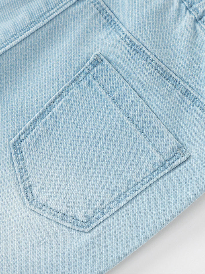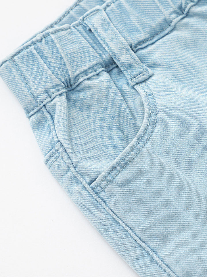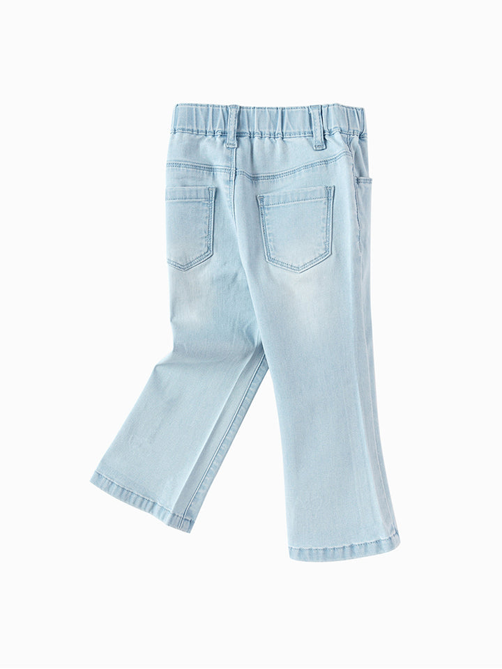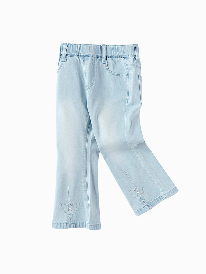 بنطلون جينز بناتي، نمط ذو لون موحد سادة ومزين بتفاصيل صغيرة على شكل فراشة أسفل الساقين، جيوب من الجهتين الأمامية والخلفية، ويأتي بخصر مطاطي مرن ومريح