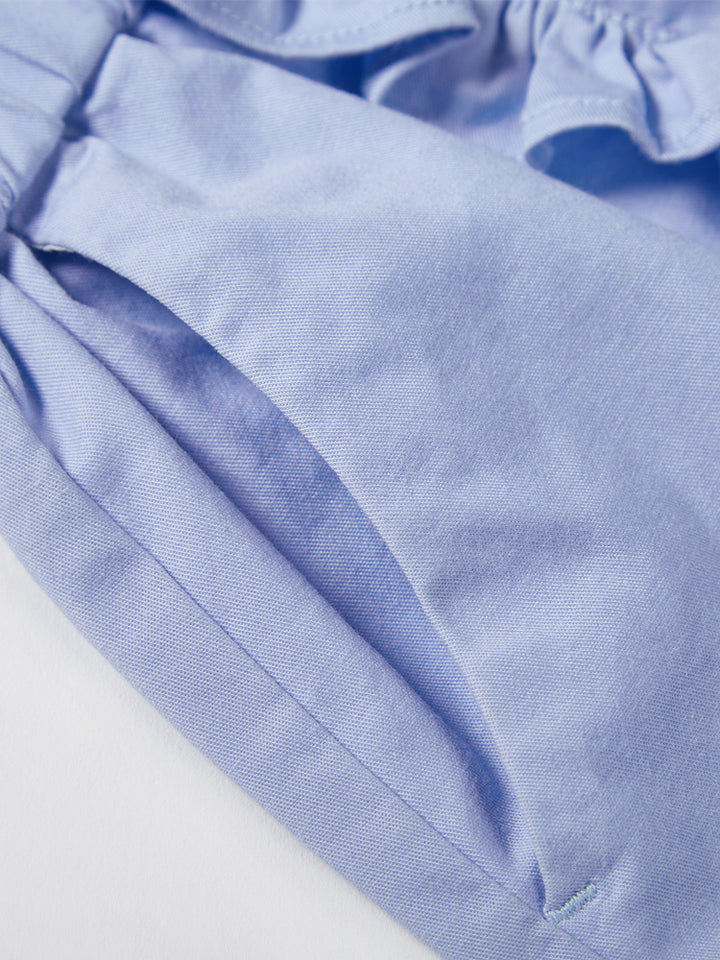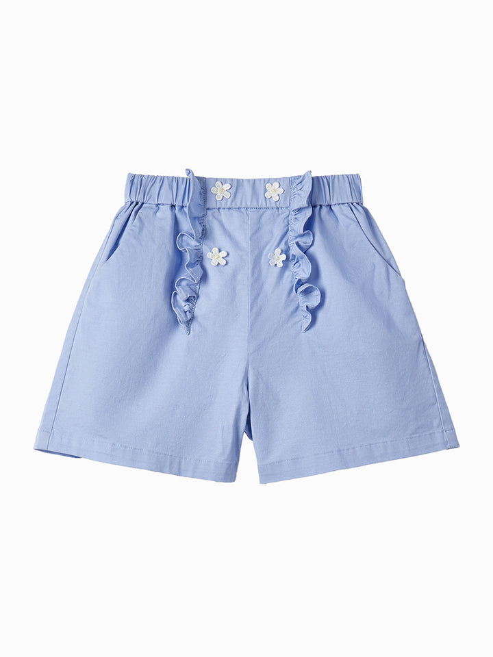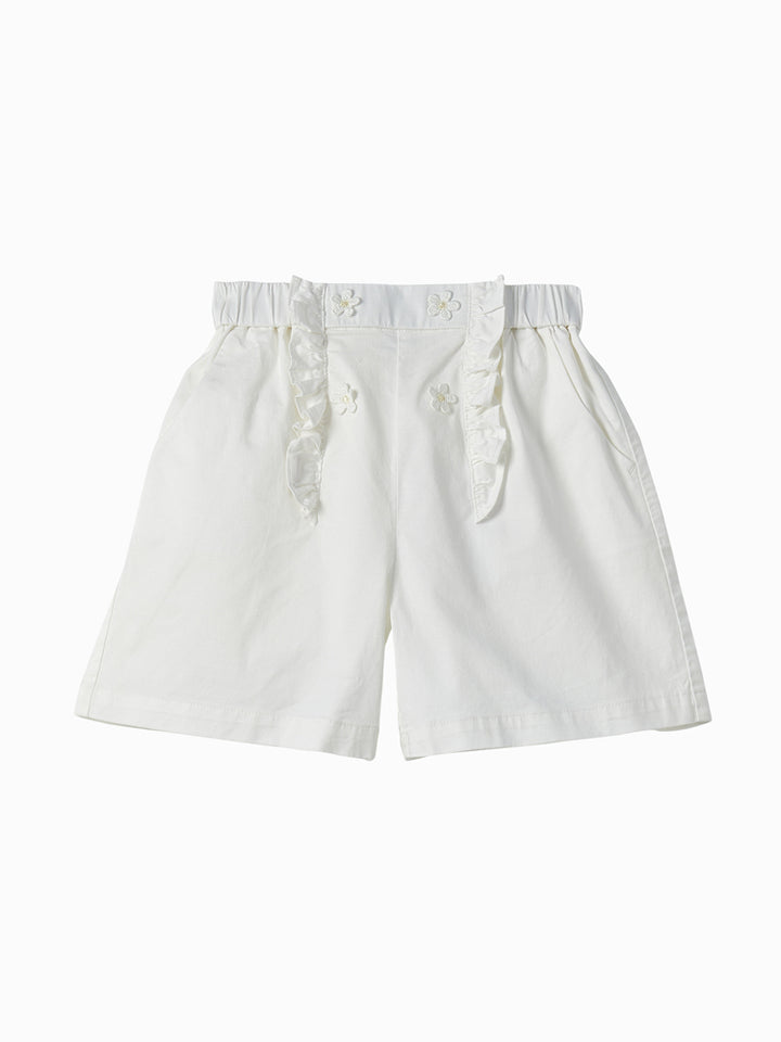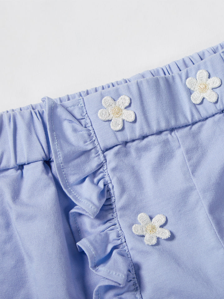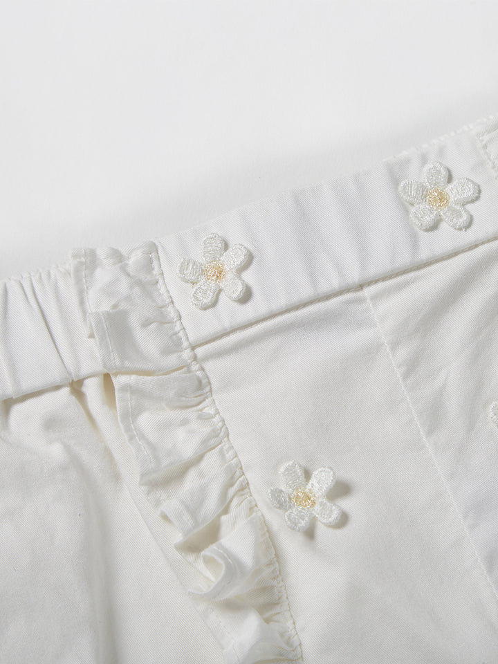 بنطلون فضفاض كاجوال، مزين بتفاصيل زينة ورود وتفاصيل مكشكشة من الجهة الأمامية، يأتي بجيوب من الجهة الأمامية وبخصر مطاطي مرن ومريح