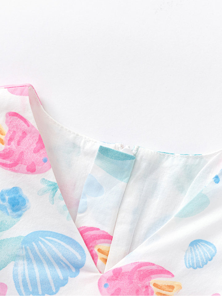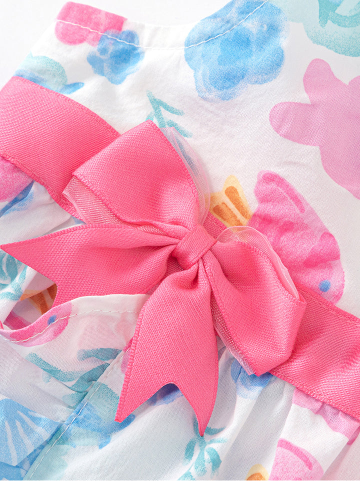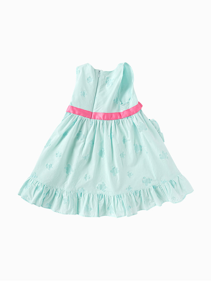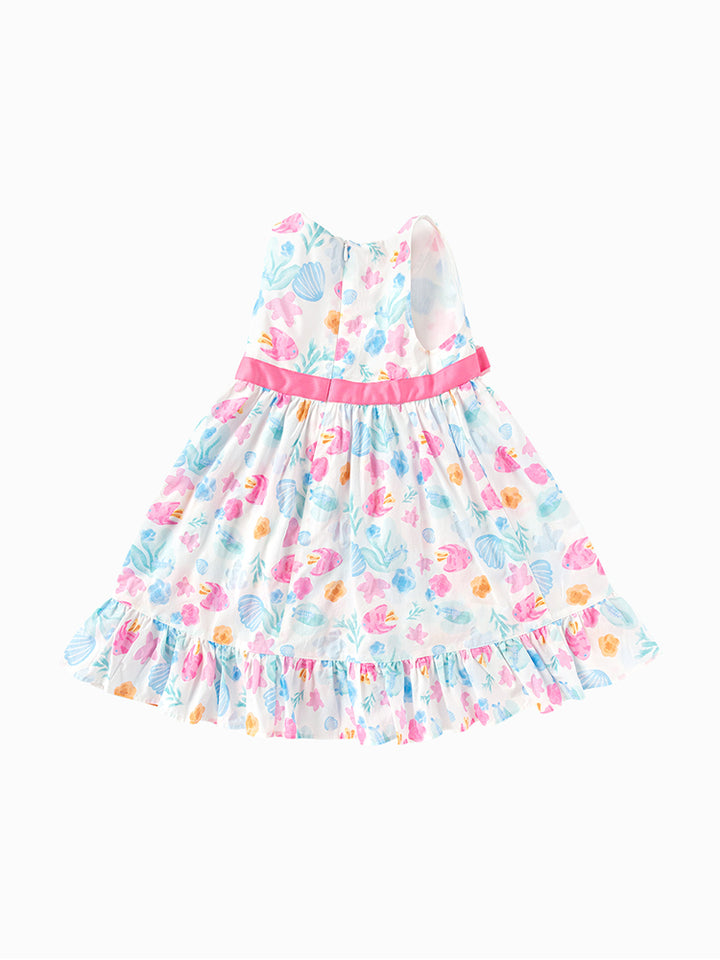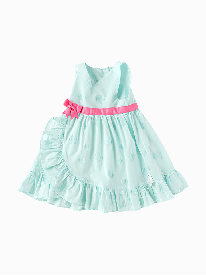فستاني بناتي بجون أكمام، مزين بنمط نقشة موردة على كامل التصمي وتفاصيل كشكش من الجهة الأمامية وعلى الحاشية من الجهة السفلية ورباط على الخصر، يأتي بسحاب للإغلاق من الجهة الخلفية وبياقة على شكل V