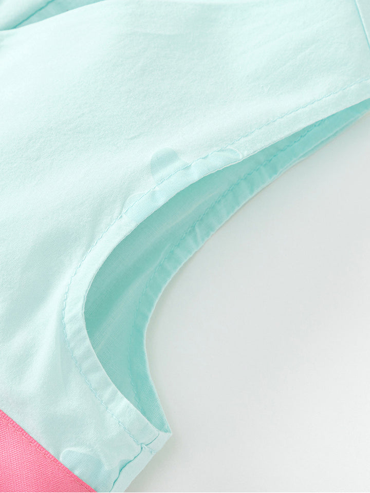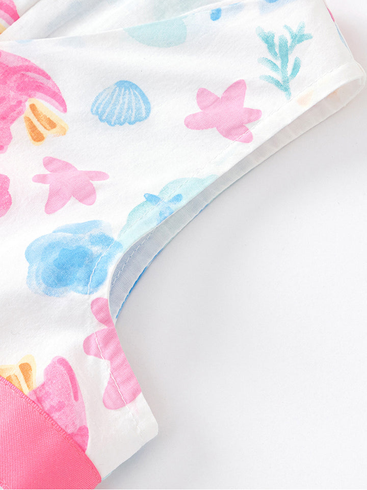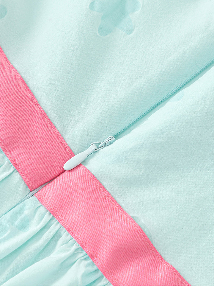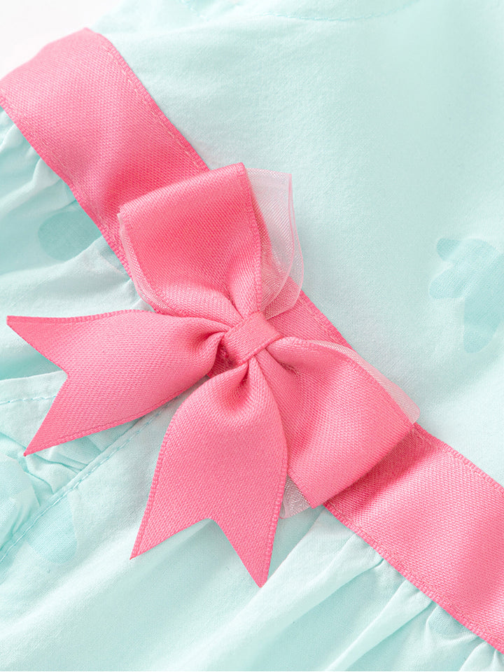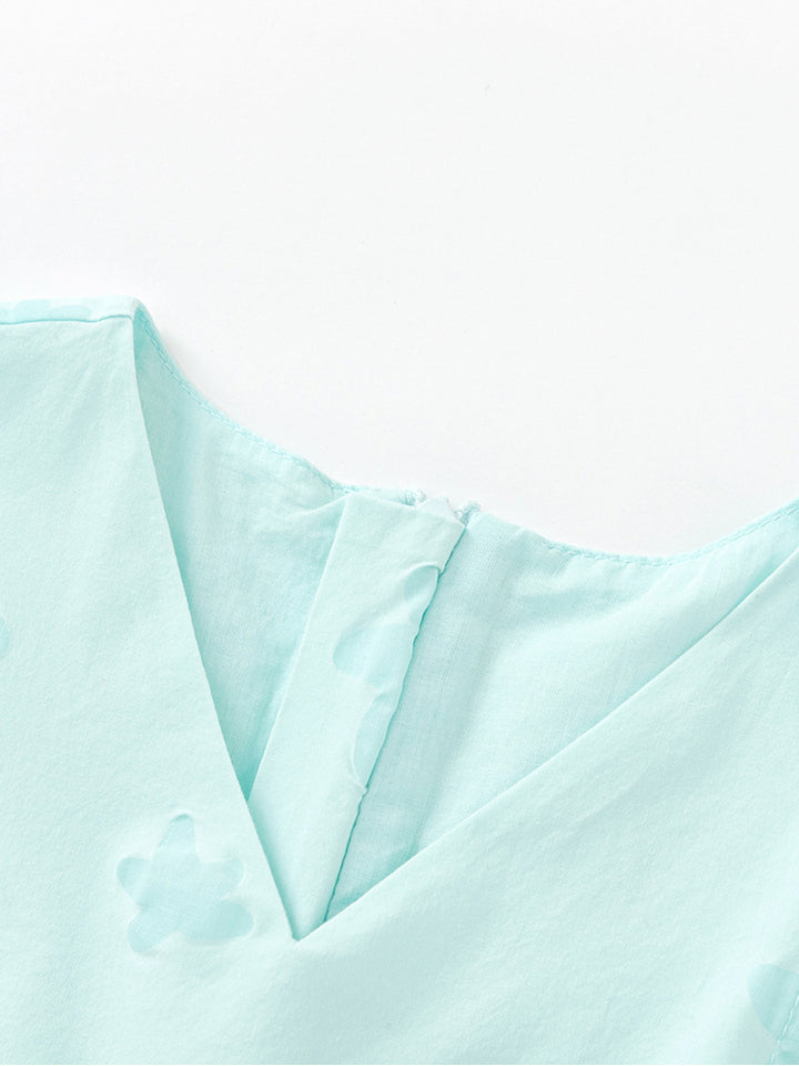 فستاني بناتي بجون أكمام، مزين بنمط نقشة موردة على كامل التصمي وتفاصيل كشكش من الجهة الأمامية وعلى الحاشية من الجهة السفلية ورباط على الخصر، يأتي بسحاب للإغلاق من الجهة الخلفية وبياقة على شكل V