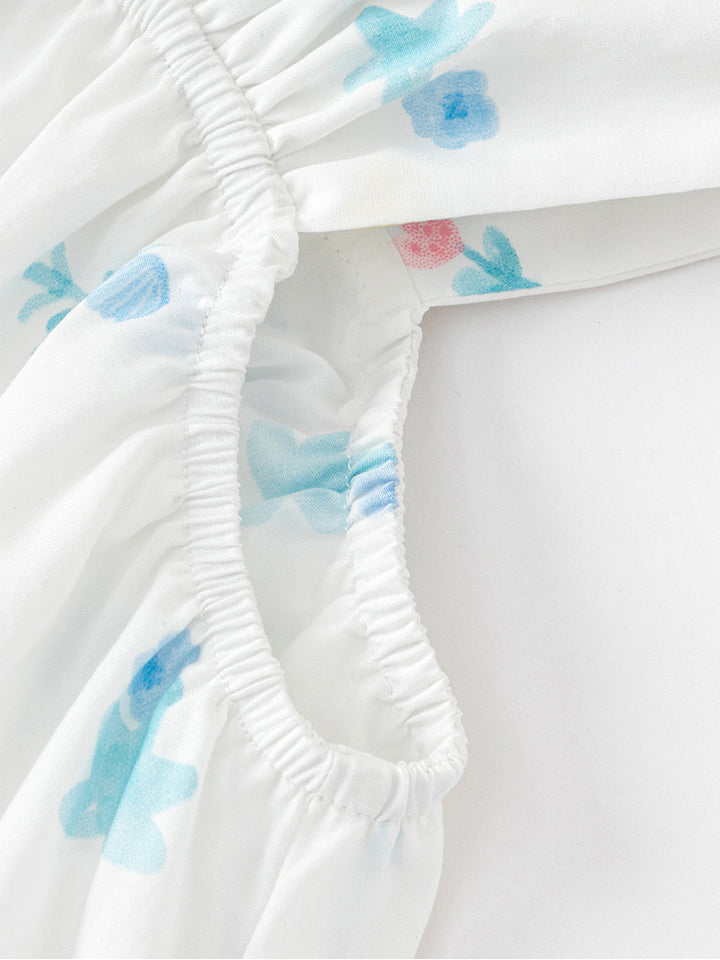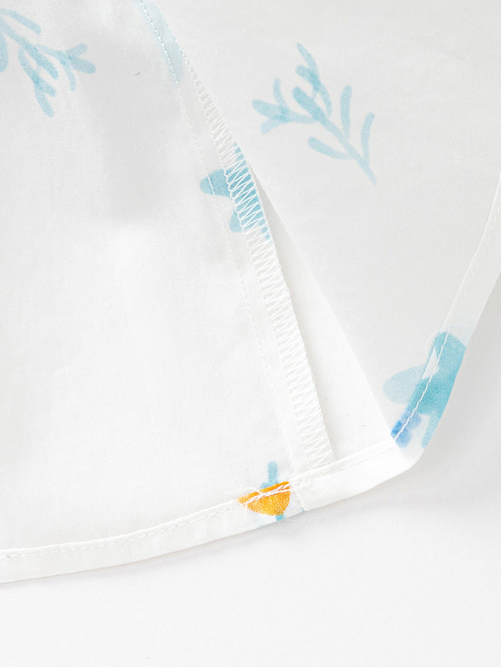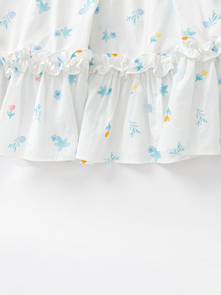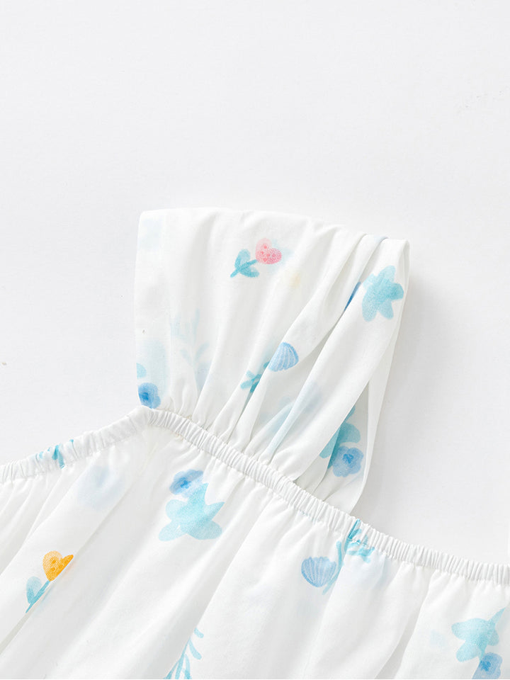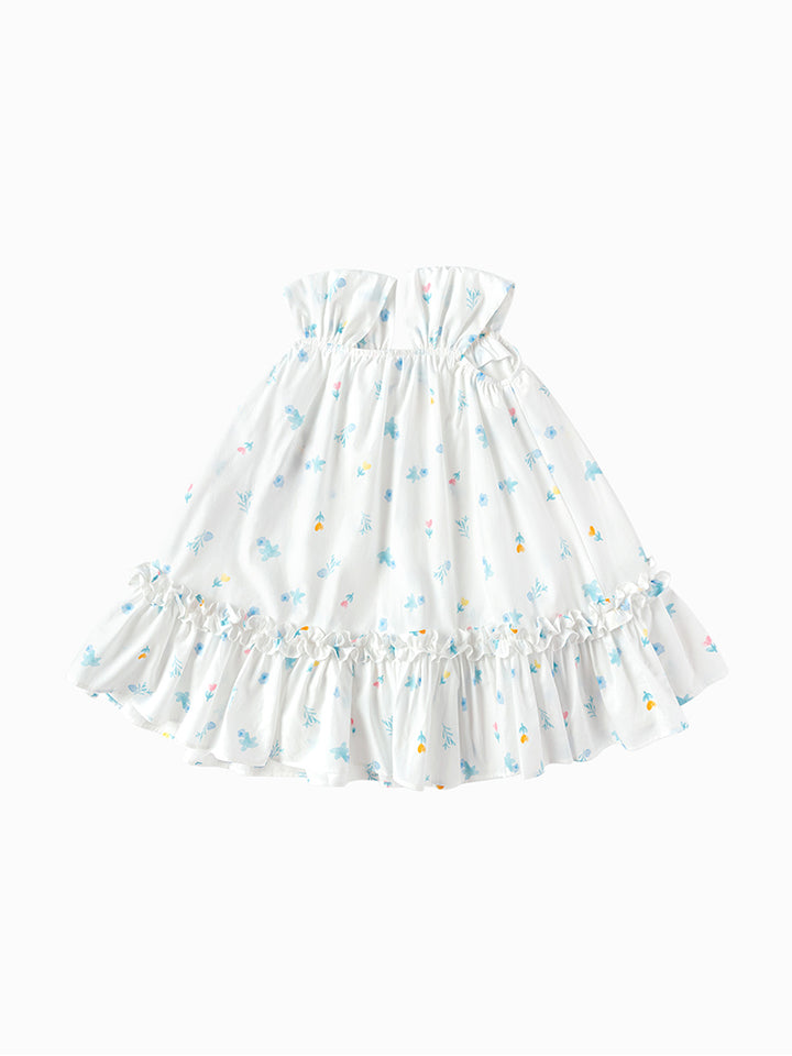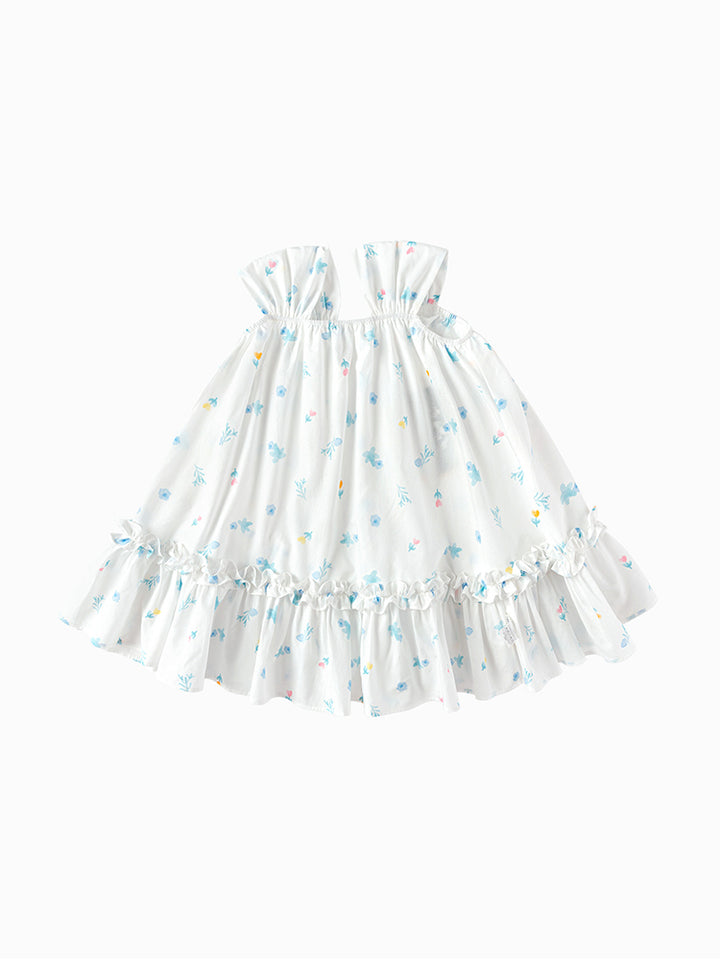 فستان بناتي بدون أكمام، مزين بنمط طبعات ملونة على كامل التصميم وكشكش من الجهة اسلفية، يأتي بأزرار للإغلاق على الجانب وبياقة مستقيمة الشكل