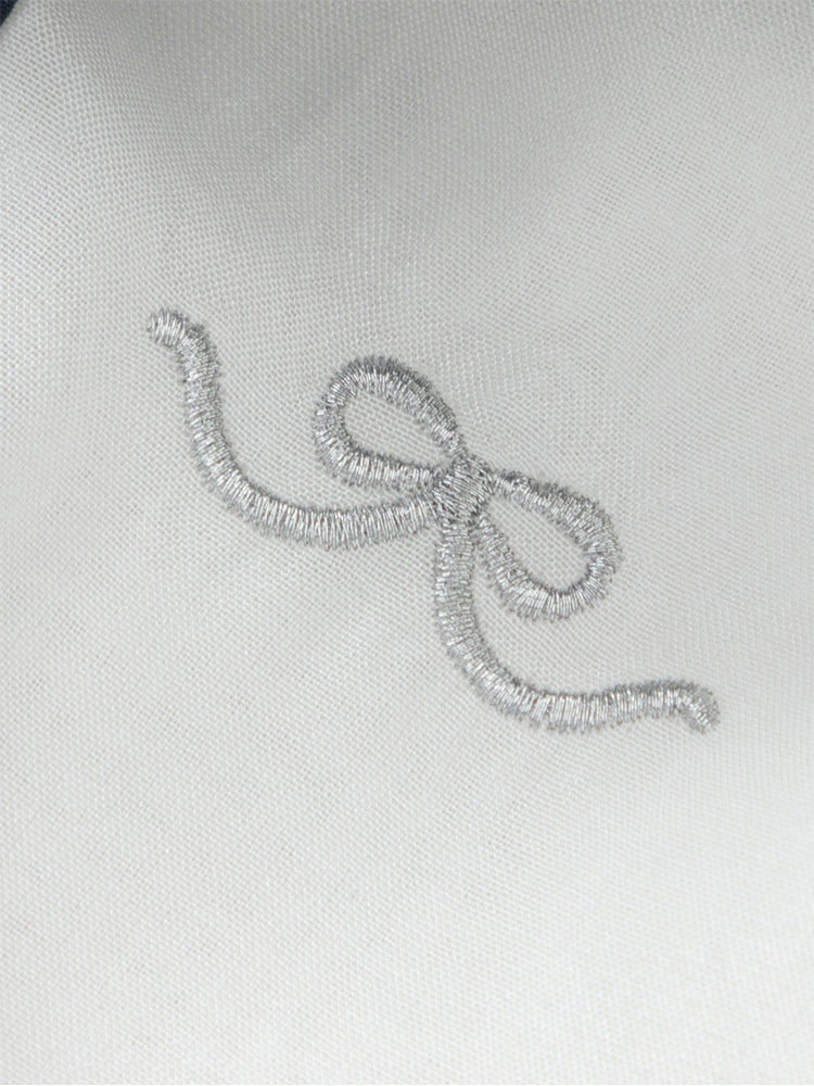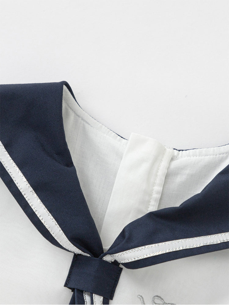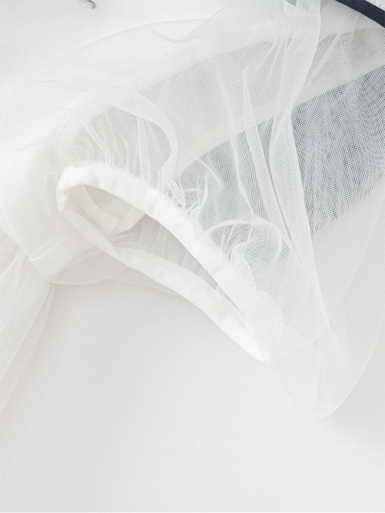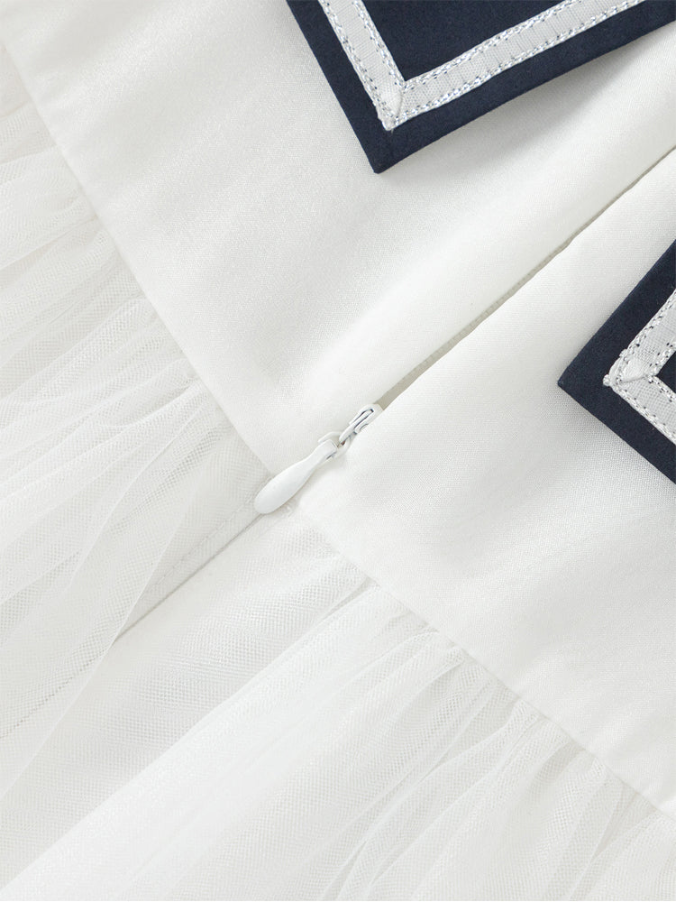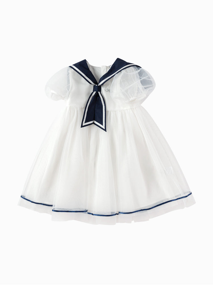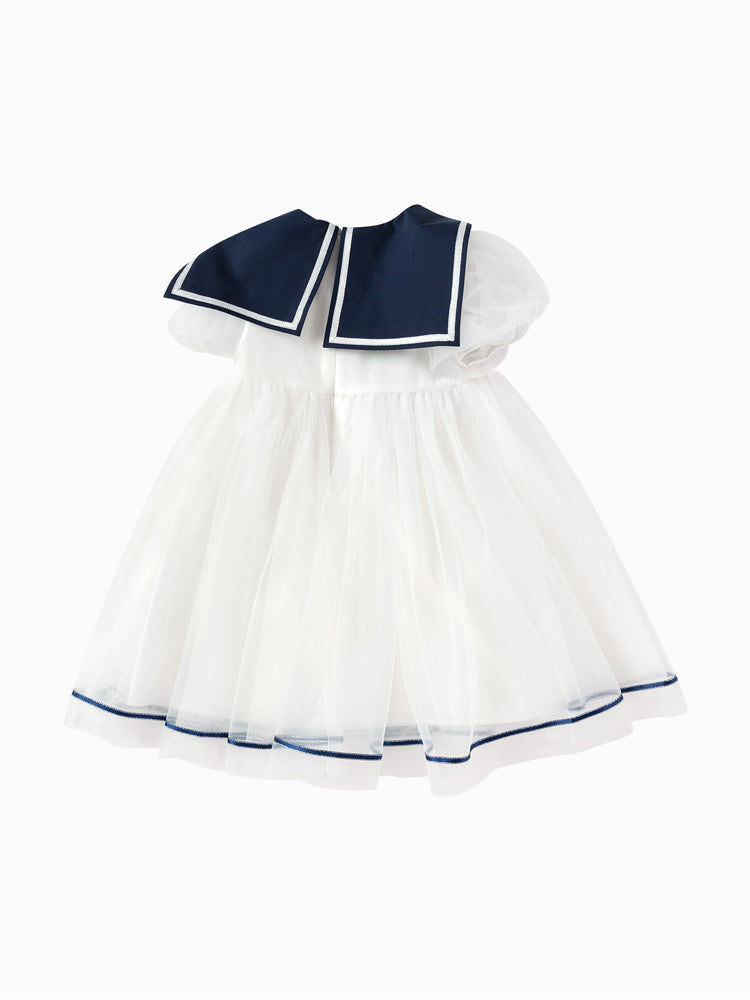 فستان بناتي بأكمام قصيرة، تصميم فضفاض بنمط متباين اللون، مزين بتفاصيل خط من الجهة السفلية وياقة مريلة عريضة منسدلة إلى الخلف مع ربطة من الجهة الأمامية، من الجهة السفلية يأتي على شكل تنورة توتو بخامة تل منفوشة، يأتي بسحاب للإغلاق من الجهة الخلفية وبياقة على شكل V