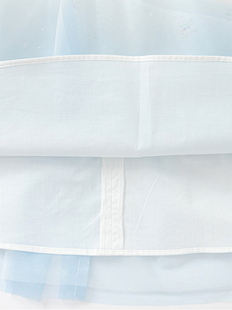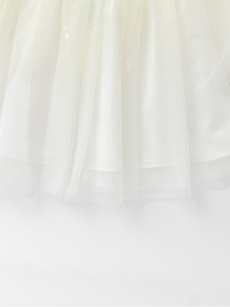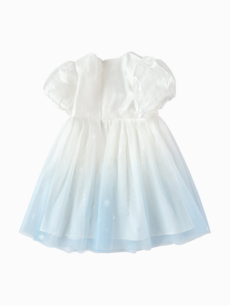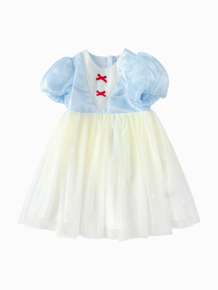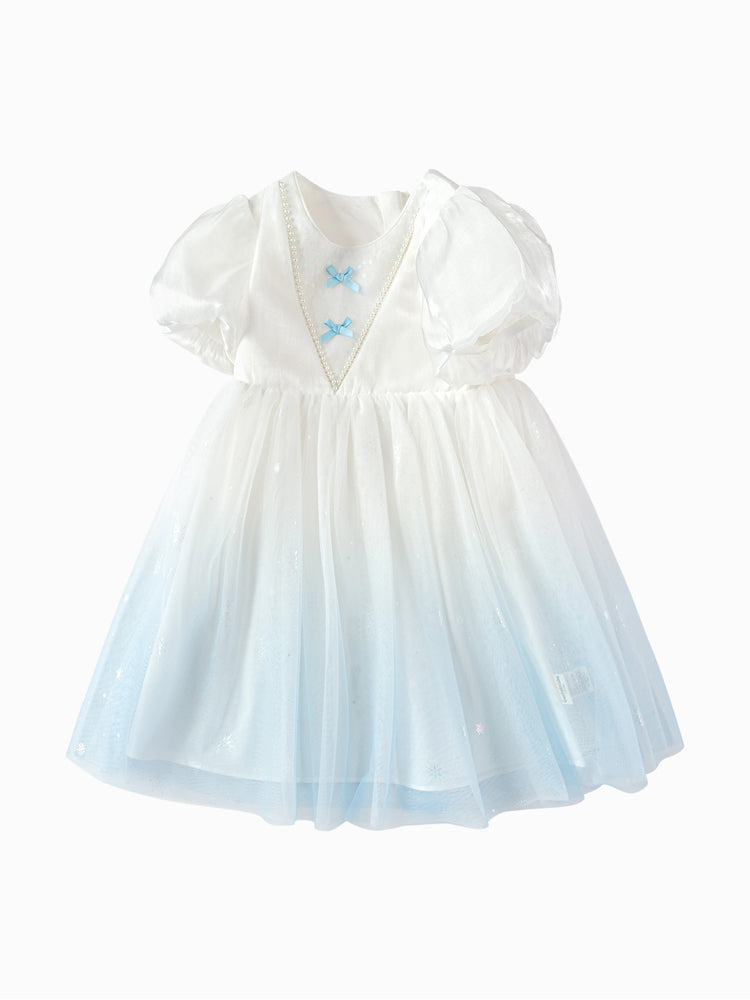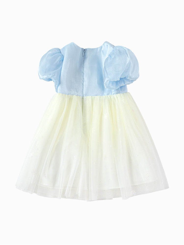 فستان بناتي بأكمام قصيرة، تصميم فضفاض بنمط متباين اللون والخامة، الجزء العلوي مزين بتفاصيل ترتر وخرز مع أكمام بستايل منفوخ، ومن الجهة السفلية يأتي على شكل تنورة توتو بخامة تل منفوشة مزينة بنمط نقشات مطبوعة صغيرة على كامل التصميم، يأتي بسحاب للإغلاق من الجهة الخلفية وبياقة مدورة الشكل