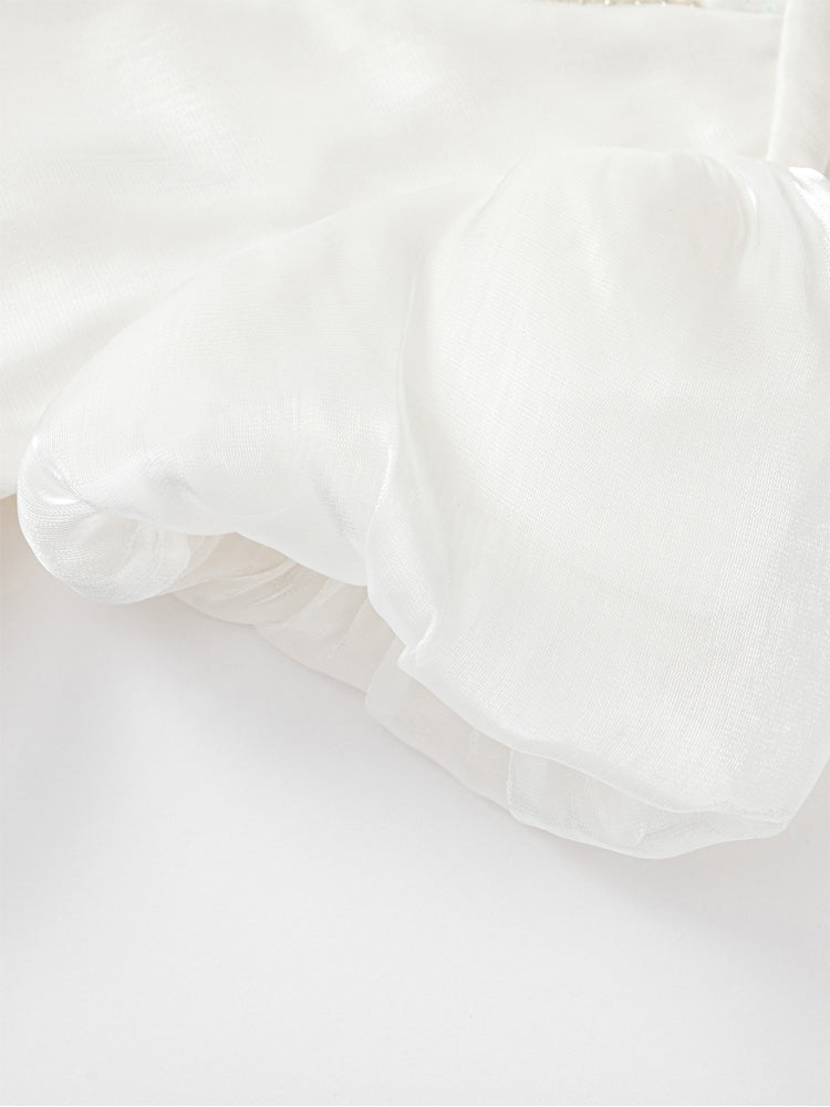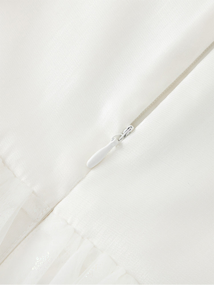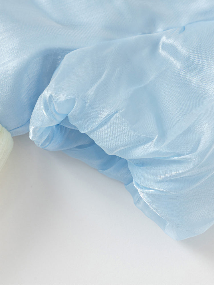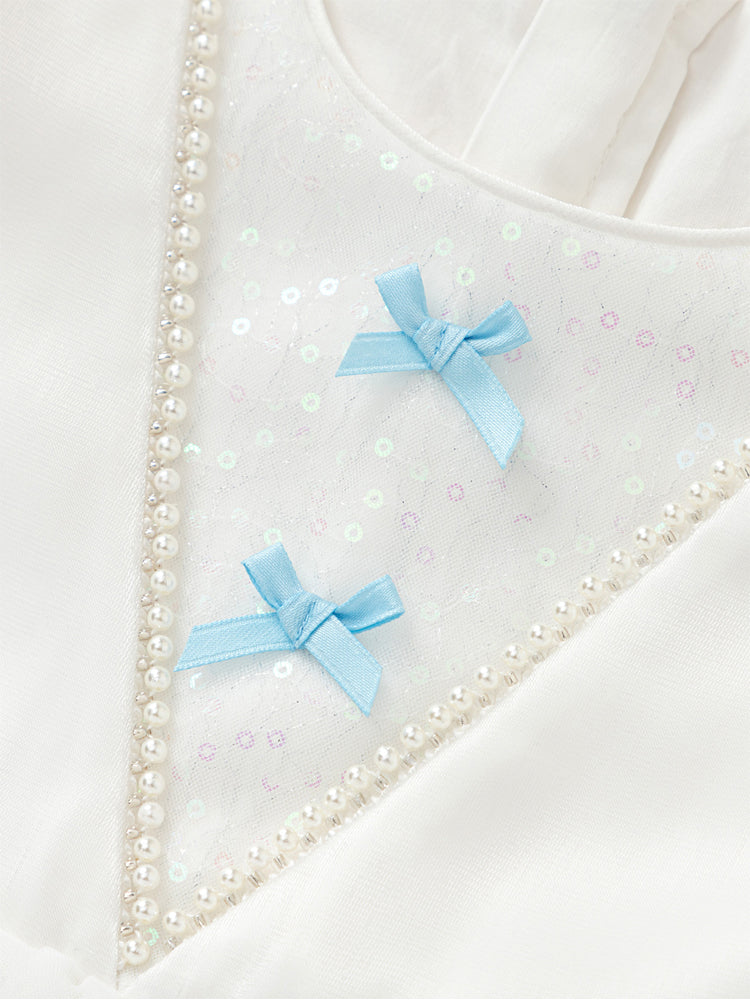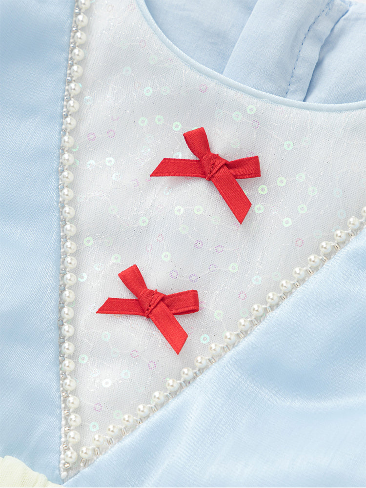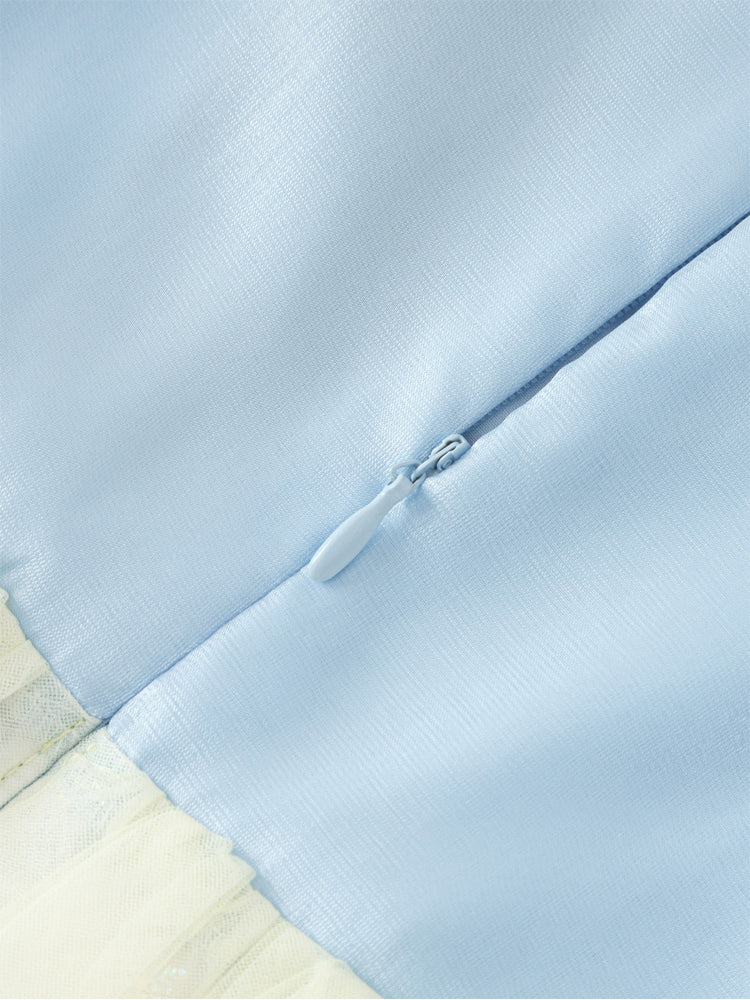 فستان بناتي بأكمام قصيرة، تصميم فضفاض بنمط متباين اللون والخامة، الجزء العلوي مزين بتفاصيل ترتر وخرز مع أكمام بستايل منفوخ، ومن الجهة السفلية يأتي على شكل تنورة توتو بخامة تل منفوشة مزينة بنمط نقشات مطبوعة صغيرة على كامل التصميم، يأتي بسحاب للإغلاق من الجهة الخلفية وبياقة مدورة الشكل