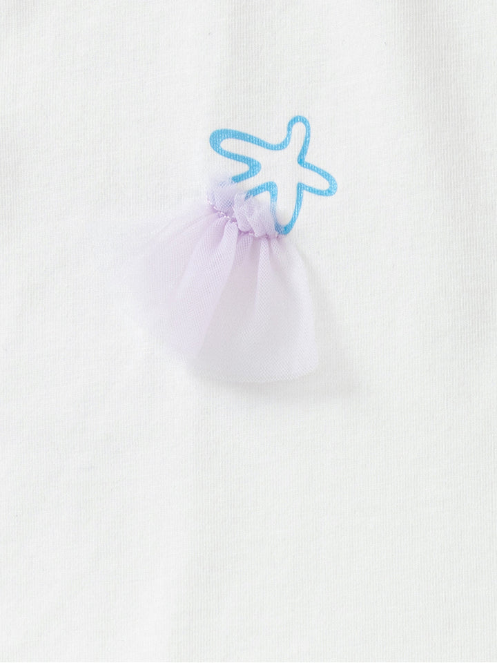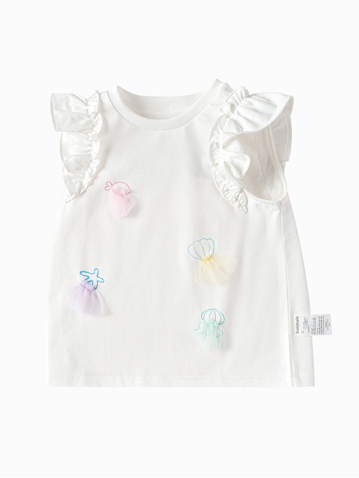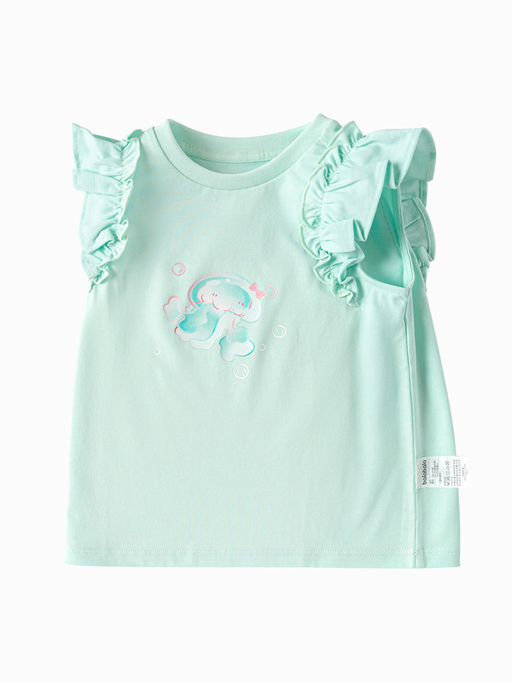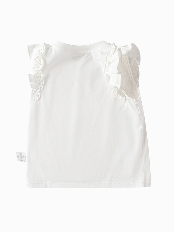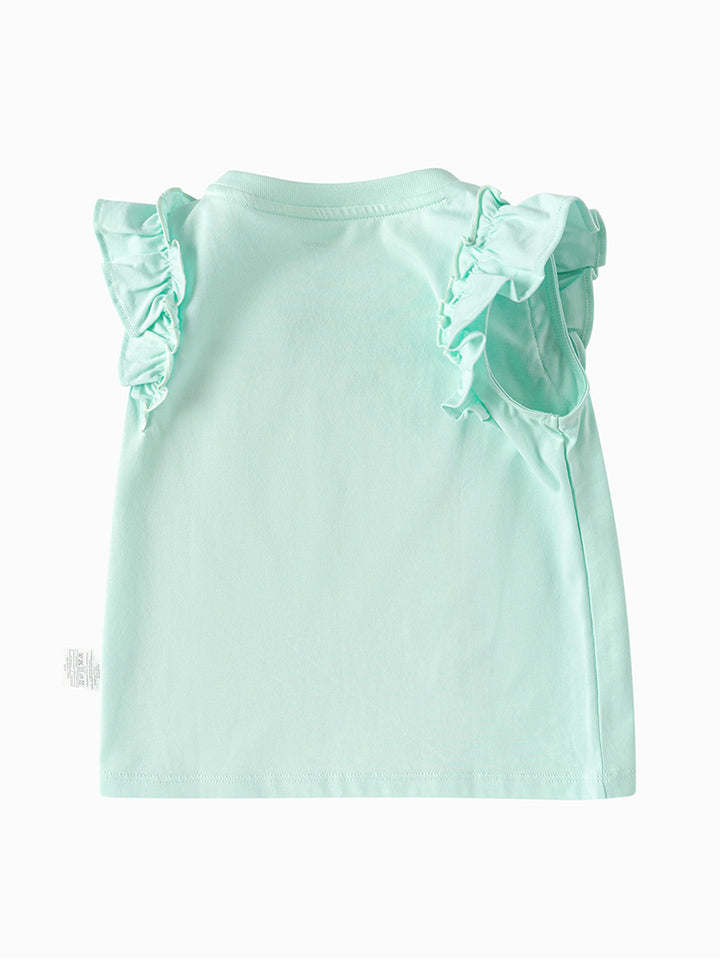 تيشيرت بناتي بدون أكمام، مزينة بطبعة من الجهة الأمامية وتفاصيل كشكش على الأكمام، تأتي بياقة مدورة الشكل