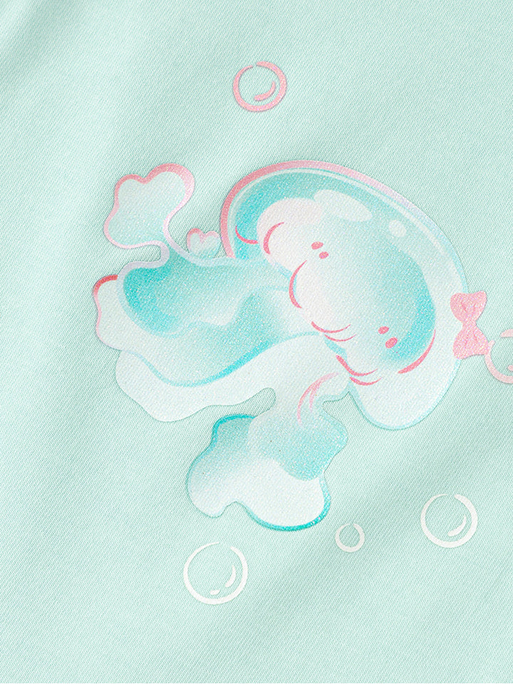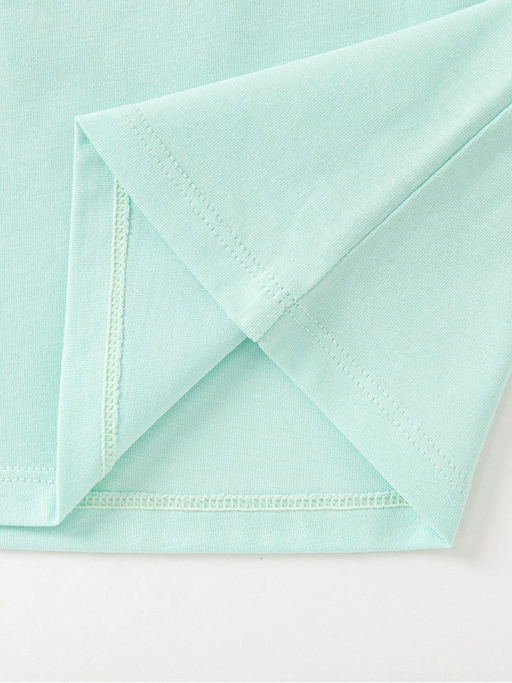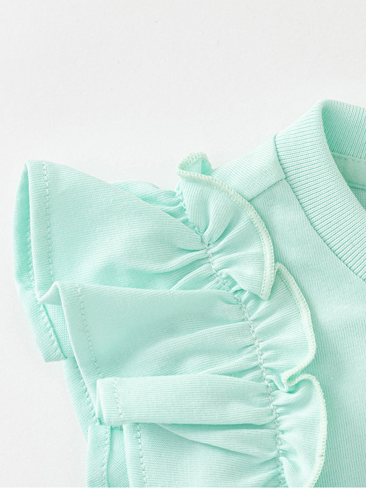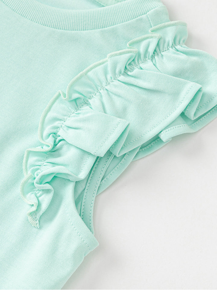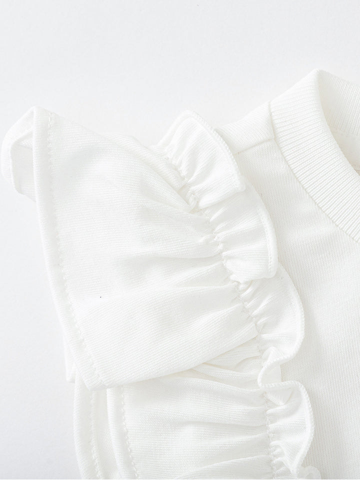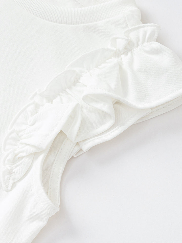 تيشيرت بناتي بدون أكمام، مزينة بطبعة من الجهة الأمامية وتفاصيل كشكش على الأكمام، تأتي بياقة مدورة الشكل