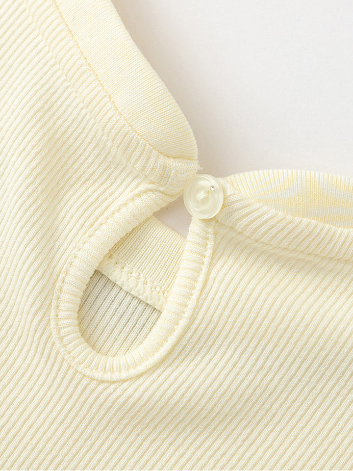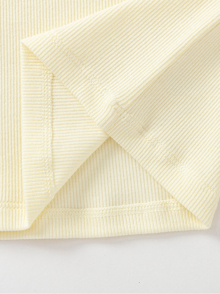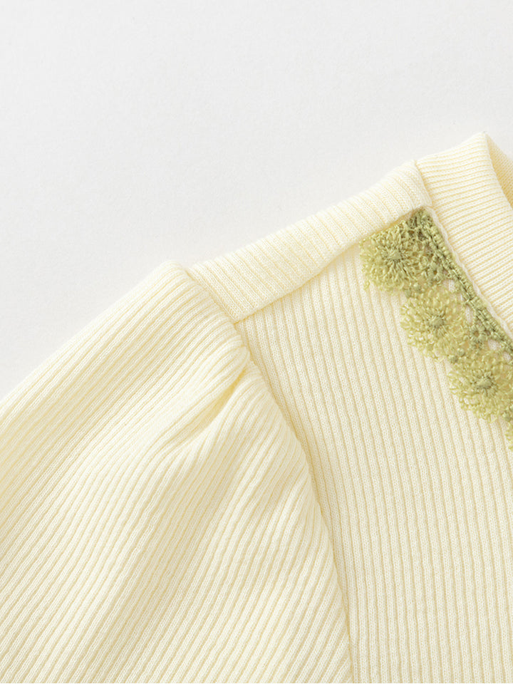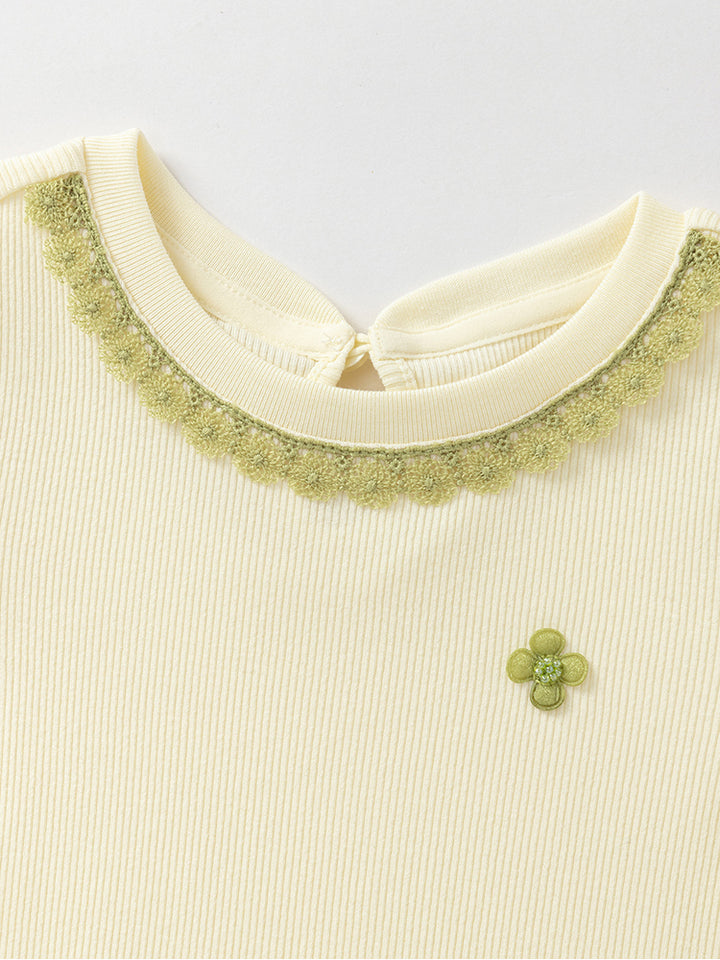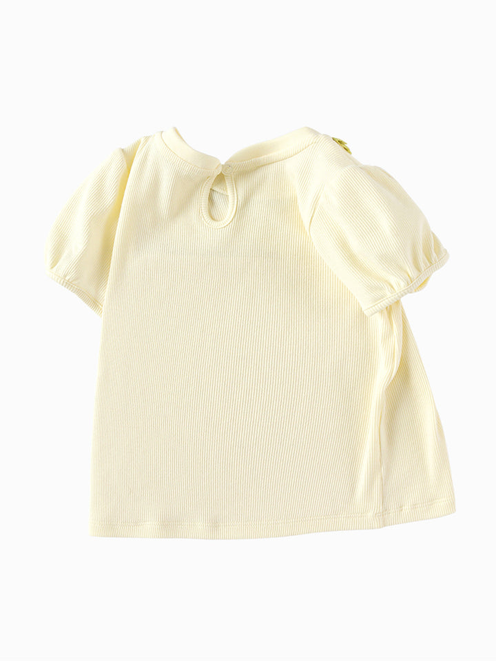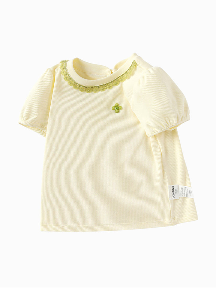 تيشيرت بناتي كاجوال بأكمام قصيرة، مزين بخامة نسيج منقوشة وتفاصيل كروشيه على الياقة، يأتي بزر للإغلاق من الجهة الخلفية وبياقة مدورة الشكل