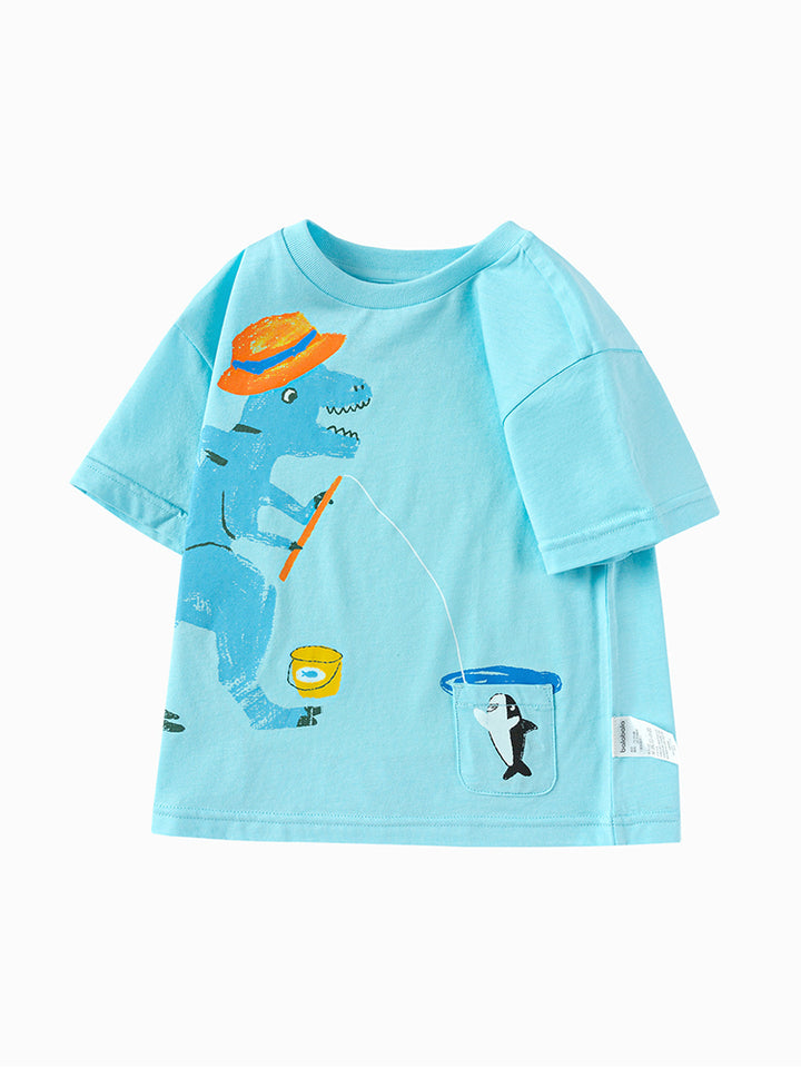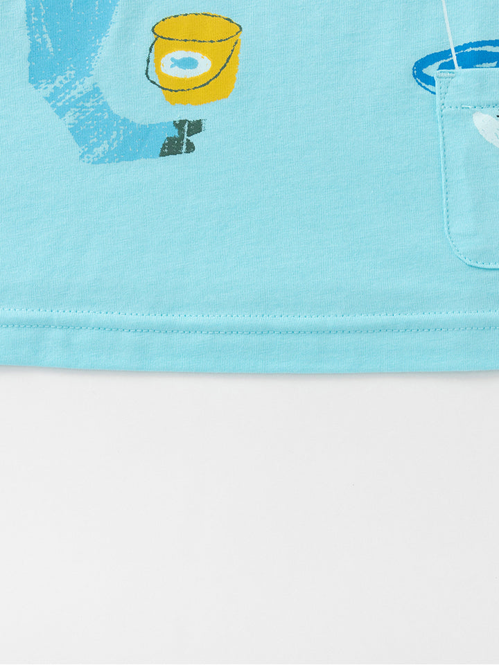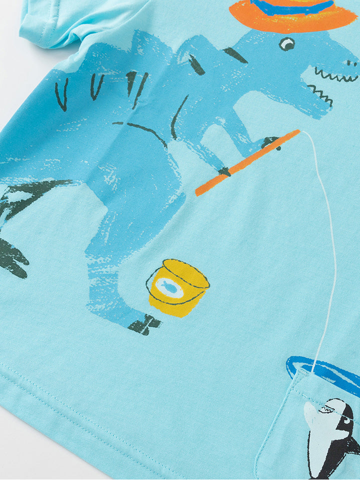 تيشيرت ولادي كاجوال بأكمام قصيرة، مزين بطبعة من الجهة الأمامية، يأتي بجيب من الجهة الأمامية وياقة مدورة الشكل