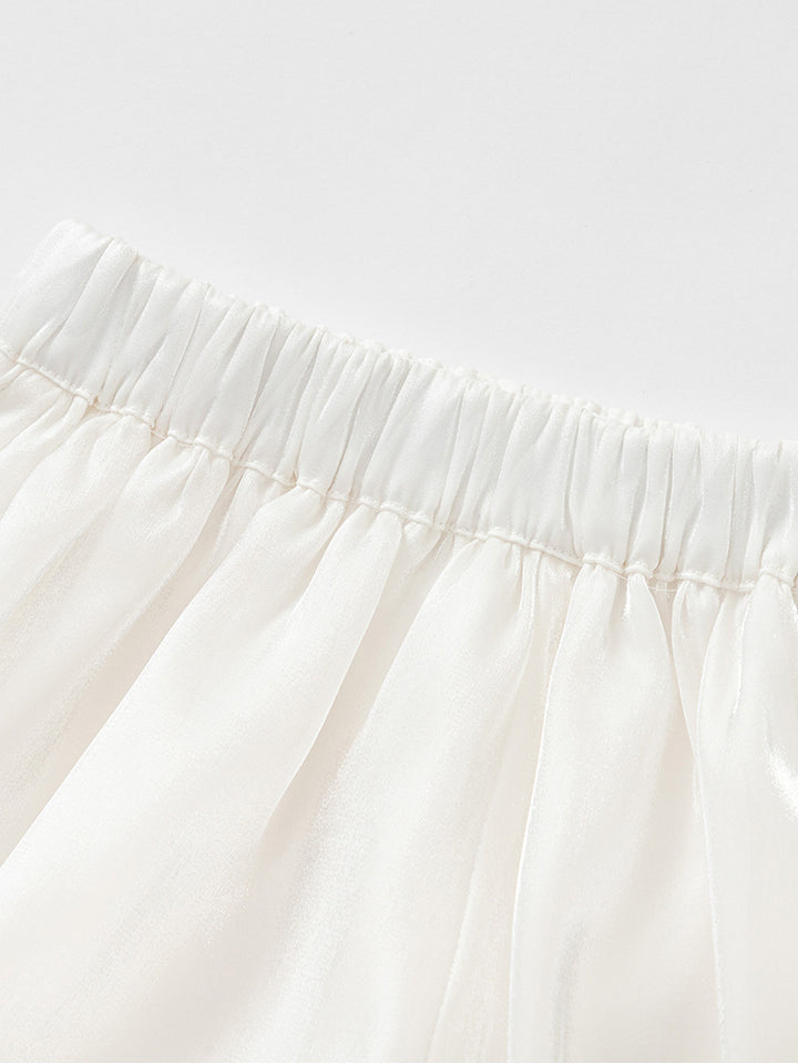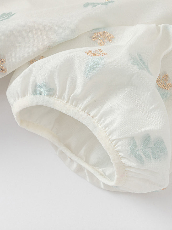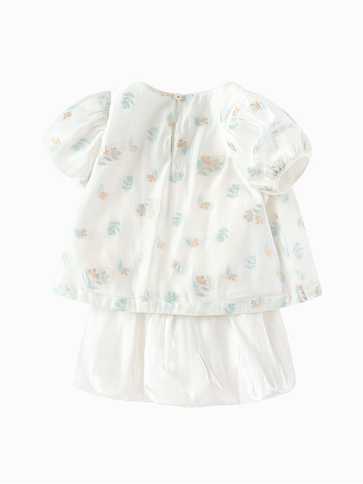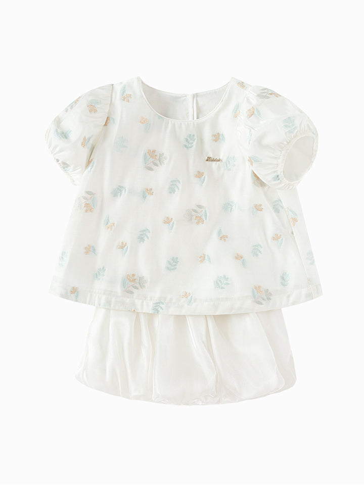 طقم بناتي مكون من قطعتين، تيشيرت بأكمام قصيرة مزينة بنمط تطريز على كامل التصميم، تأتي بزر للإغلاق من الجهة الخلفية وبياقة مدورة الشكل، وشورت كاجوال ذو لون موحد سادة، يأتي بخصر مطاطي مريح