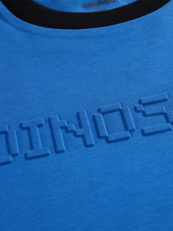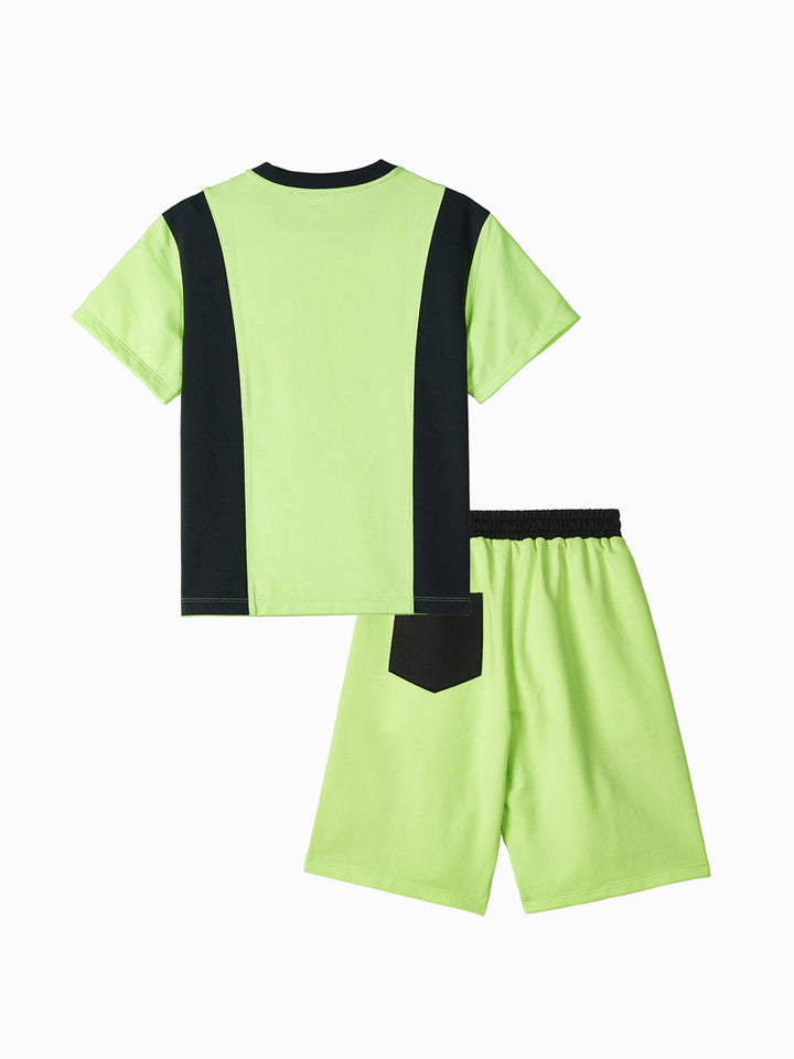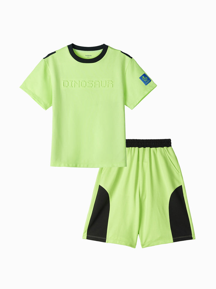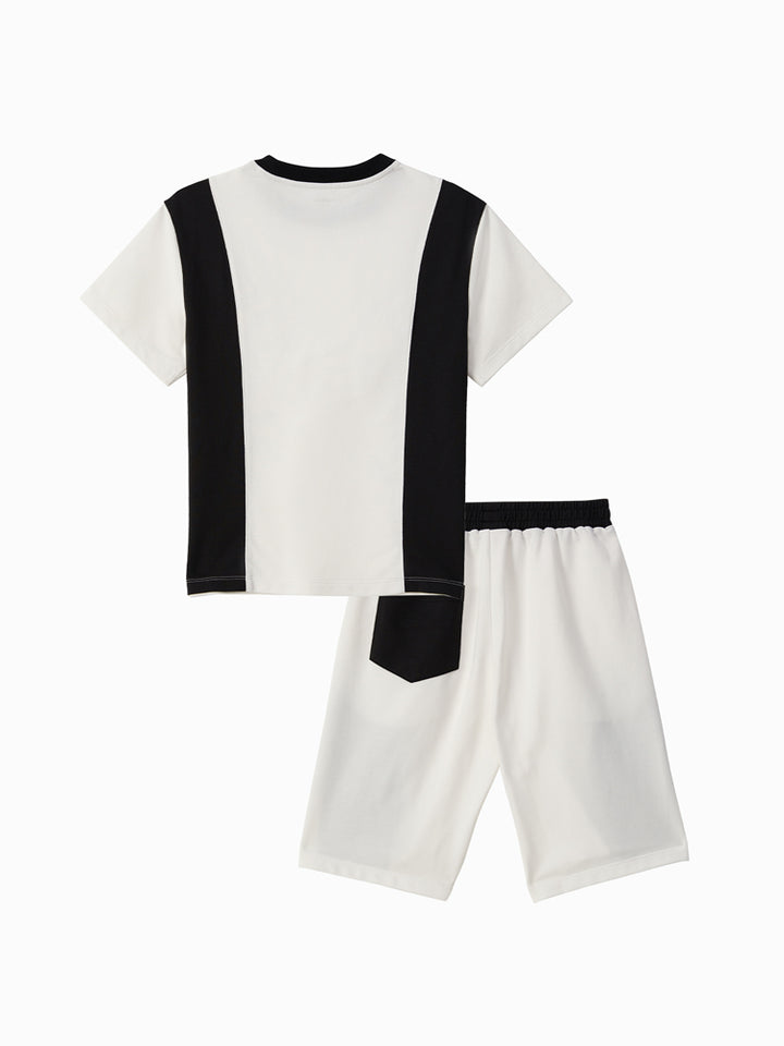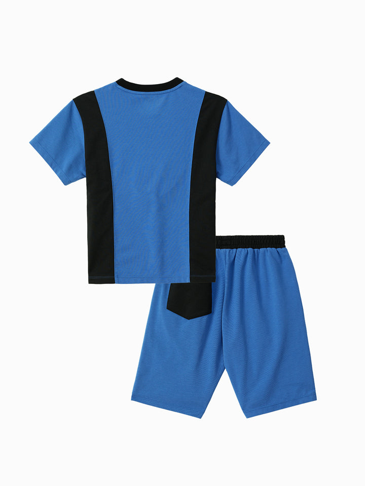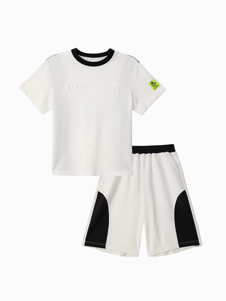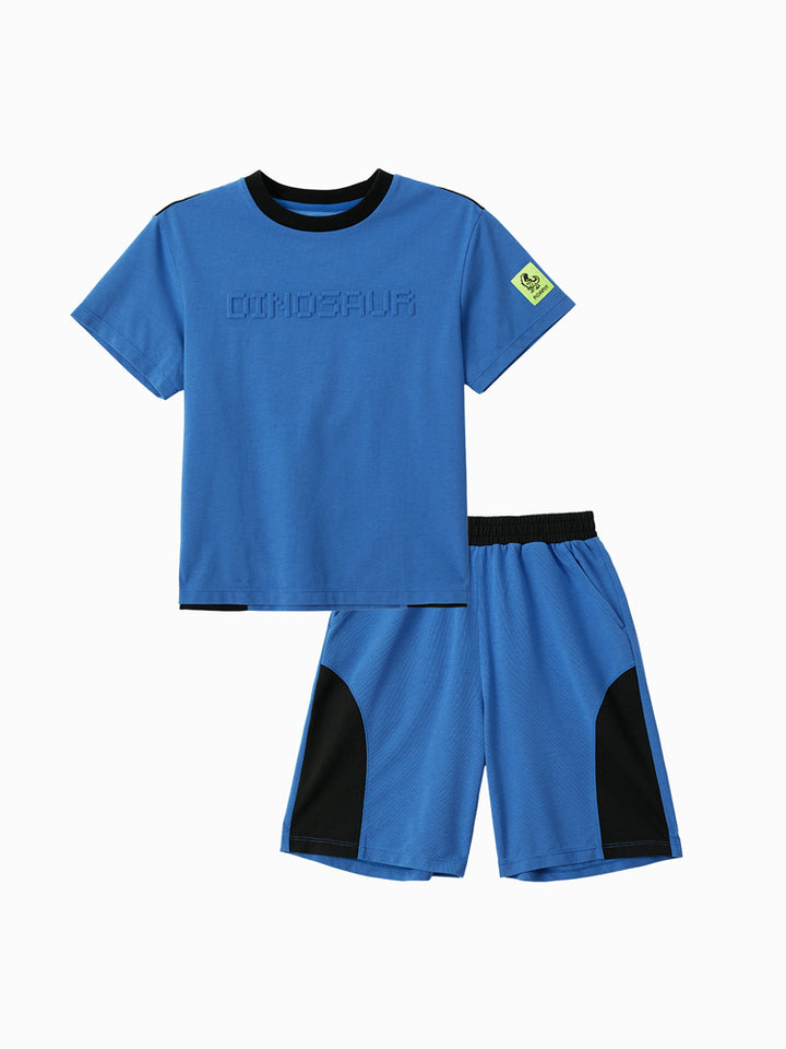 طقم ولادي مكون من قطعتين، تيشيرت كاجوال بأكمام قصيرة، مزين بتفاصيل متباينة اللون وطبعة كتابة بارزة من نفس اللون من الجهة الأمامية وتأتي بياقة مدورة الشكل، وشورت كاجوال مزين بتفاصيل متباينة اللون، يأتي بجيوب من الجهة الأمامية وجيب واحد من الجهة الخلفية، خصر مطاطي مرن ومريح ورباط قابل للتعديل على الخصر