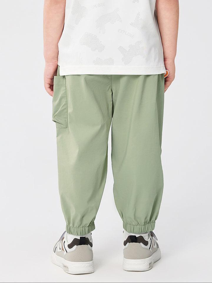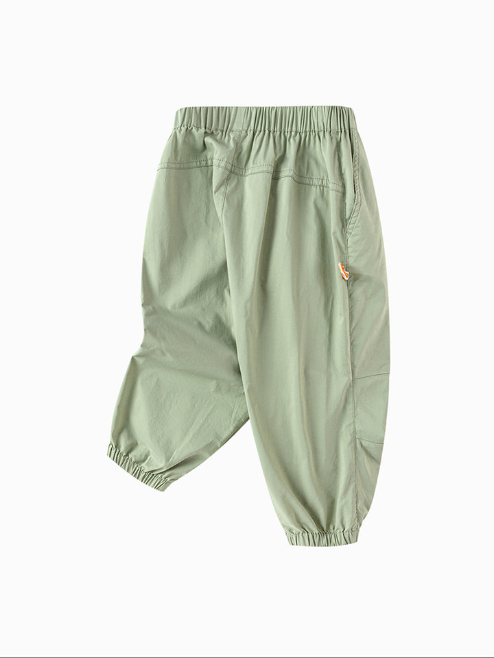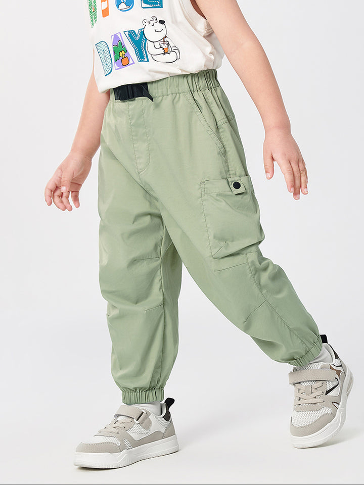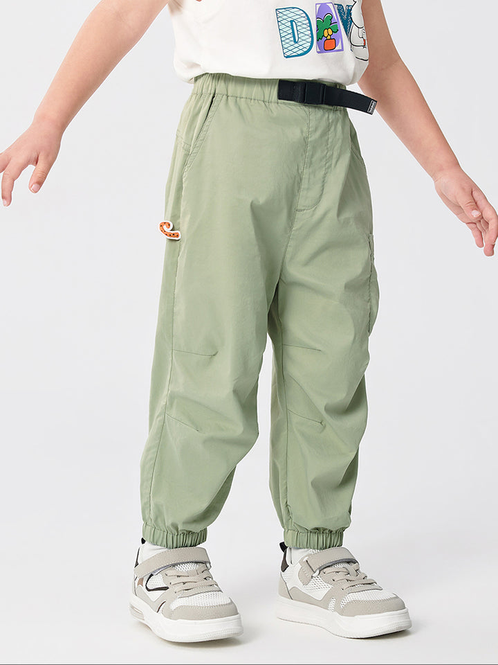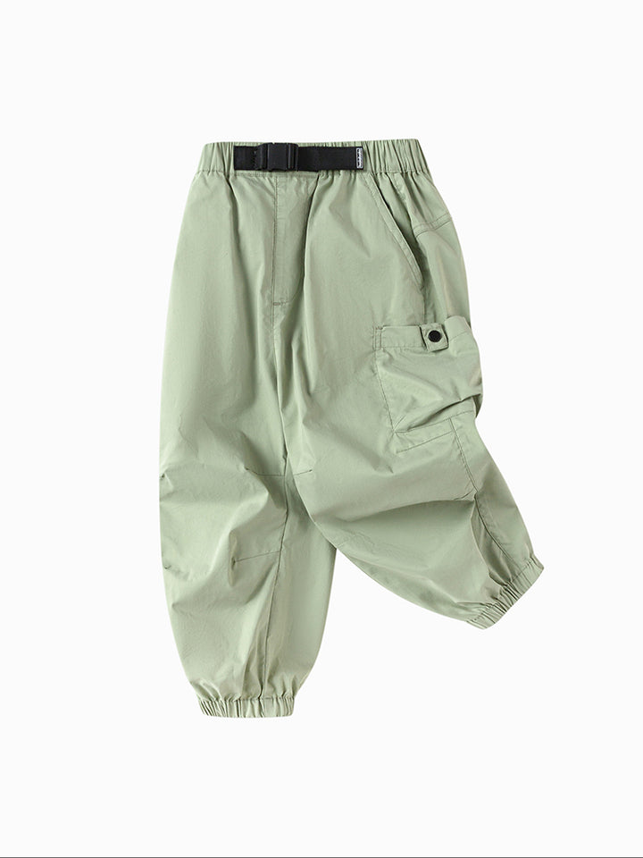سروال أنيق للأطفال الصغار بلون ثابت، مزود بجيوب أمامية وخصر مرن لراحة مثالية. مع أربطة حول الكاحلين وحزام مزود بقفل، ليجمع بين الراحة والأناقة لطفلك