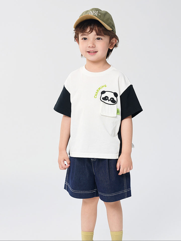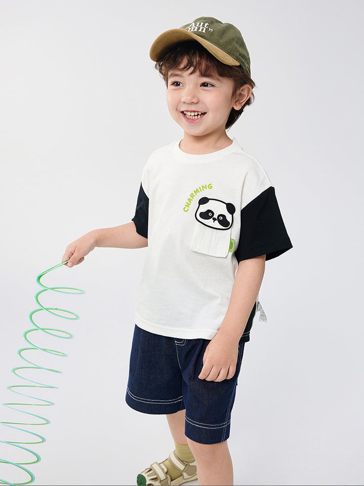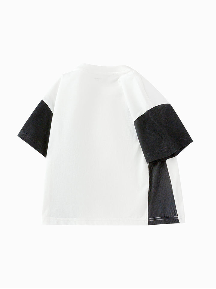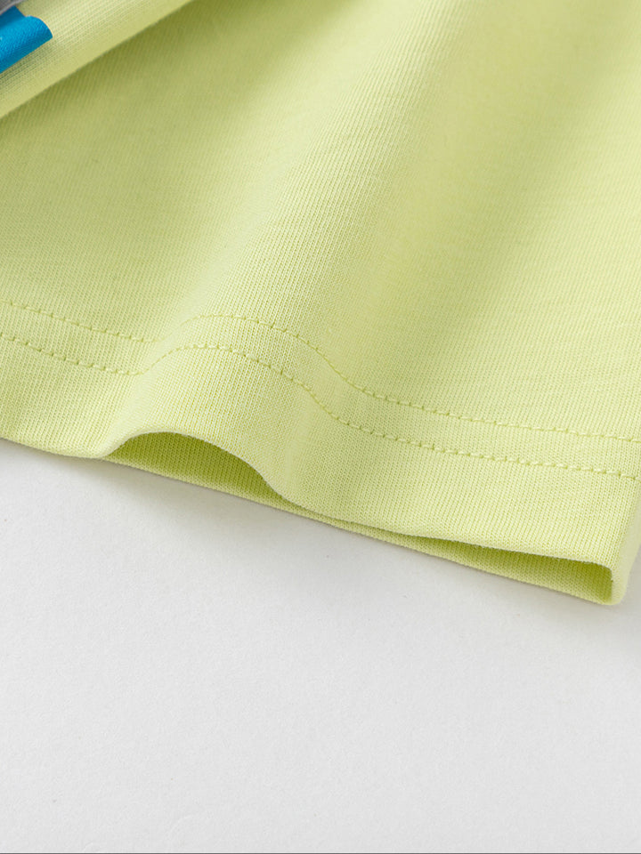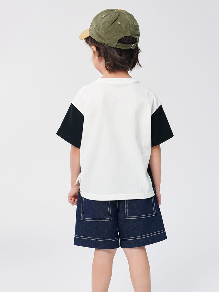 تيشيرت أنيق للأطفال الصغار مزود بطباعة على الجهة الأمامية مع رقعة تطريز، أكمام بتصميم بلون مغاير، وياقة مدورة. مثالي لإضافة لمسة من الأناقة والراحة لخزانة ملابس طفلك