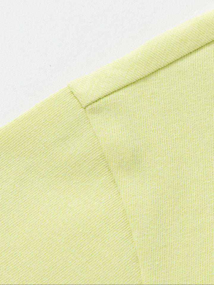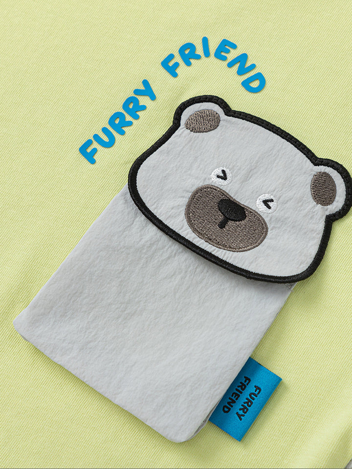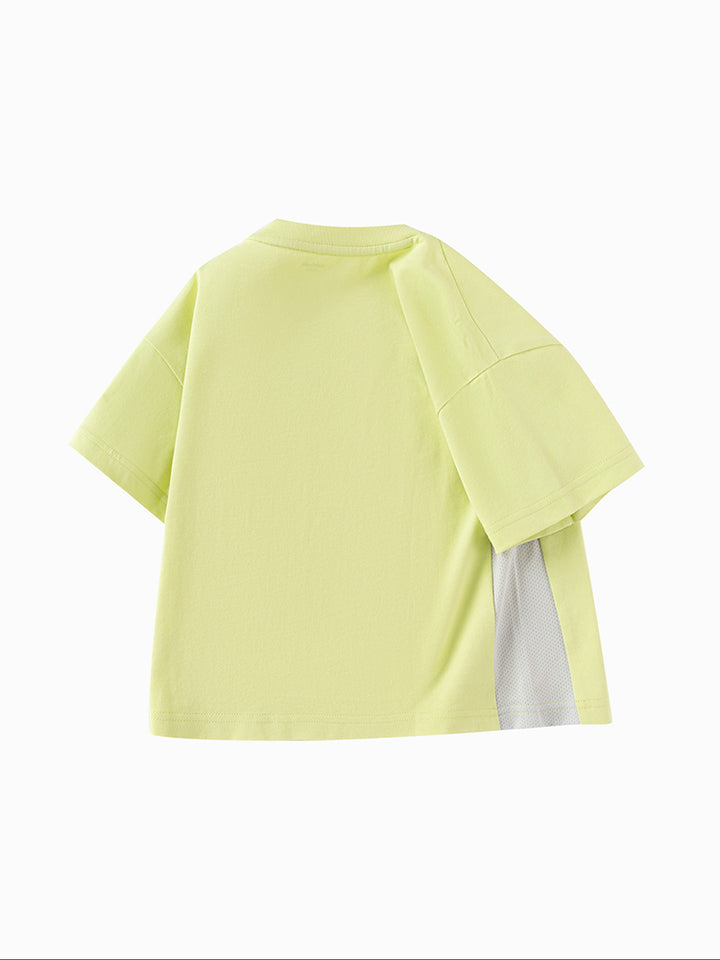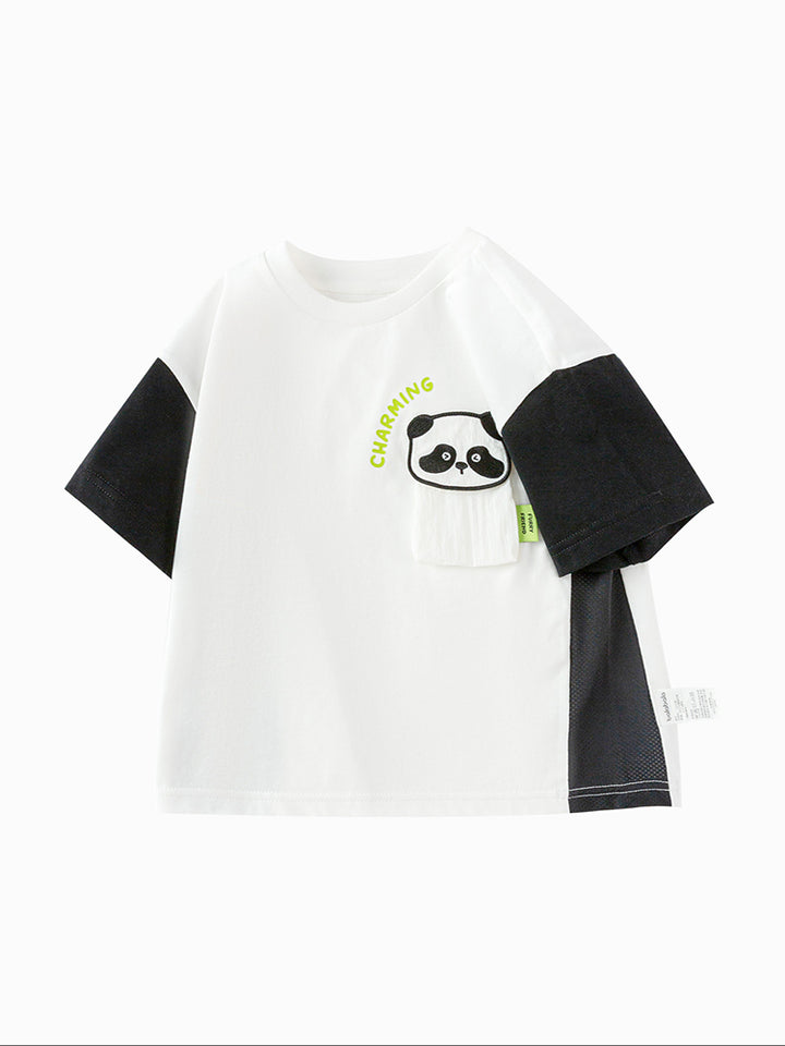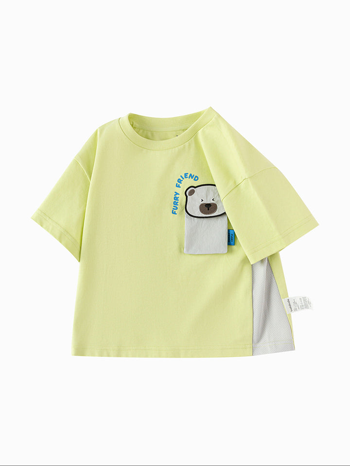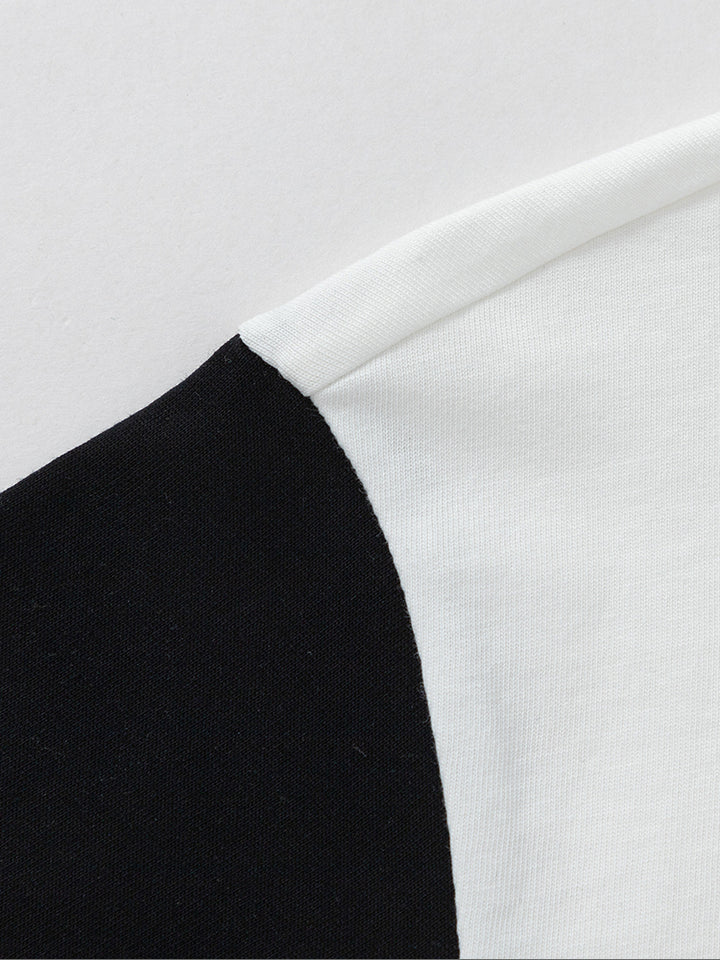 تيشيرت أنيق للأطفال الصغار مزود بطباعة على الجهة الأمامية مع رقعة تطريز، أكمام بتصميم بلون مغاير، وياقة مدورة. مثالي لإضافة لمسة من الأناقة والراحة لخزانة ملابس طفلك