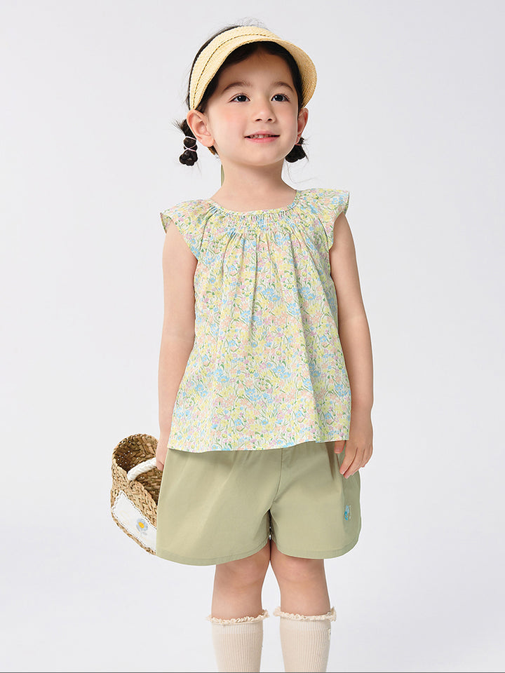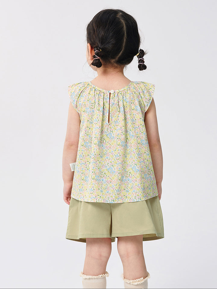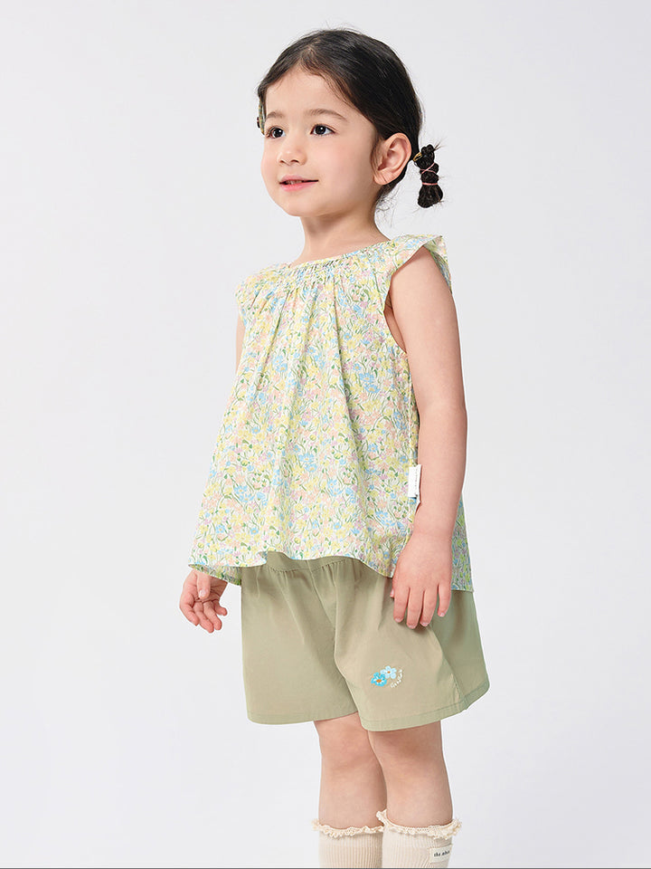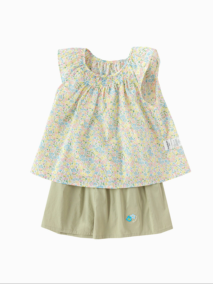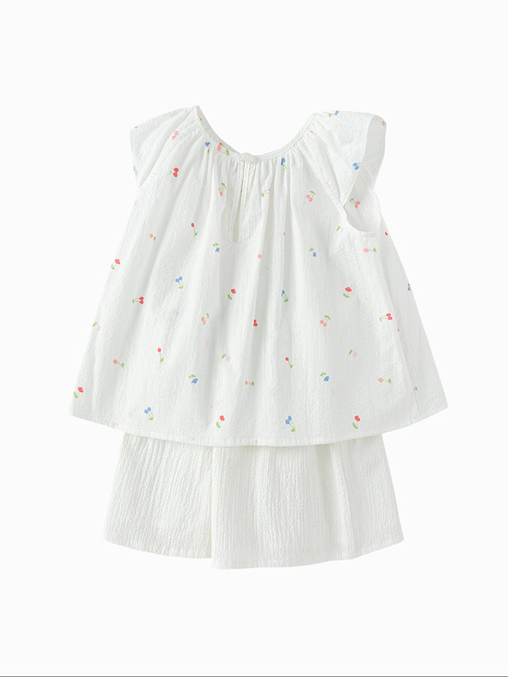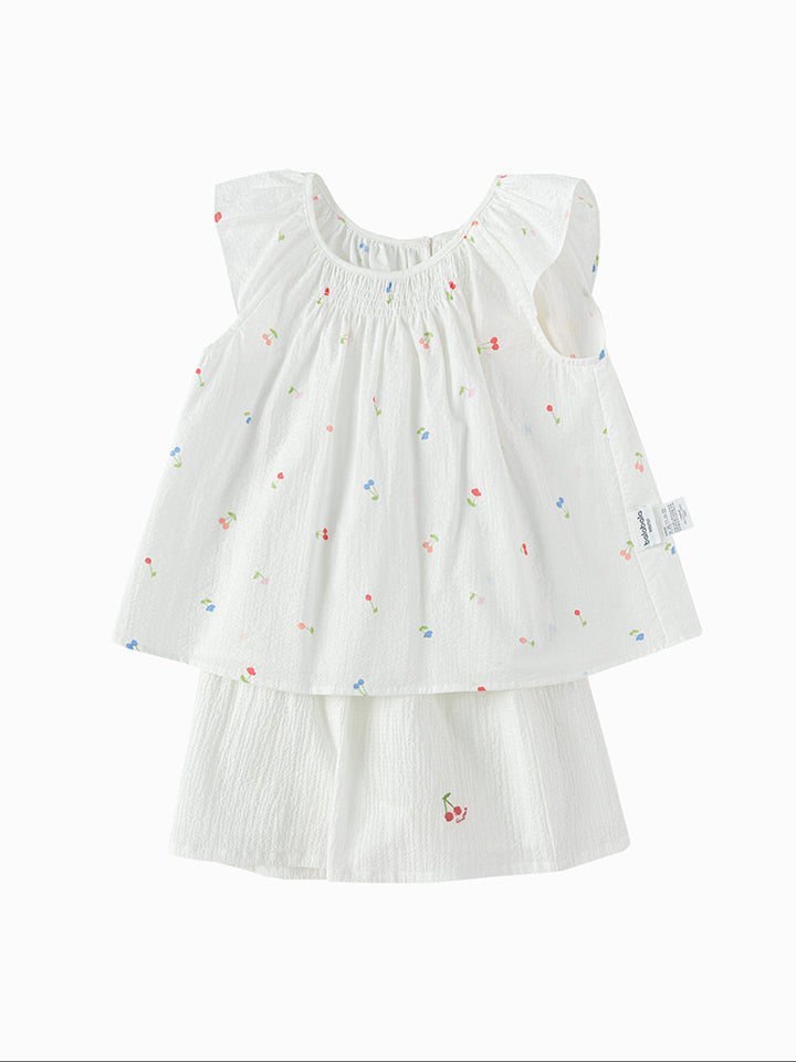 طقم مميز للأطفال الصغار يتكوّن من توب بدون أكمام بنقشة مطبوعة وياقة دائرية مع زر إغلاق خلفي، وتنورة مزينة بتطريز ناعم مع خصر مطاطي لراحة مثالية