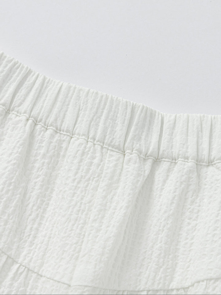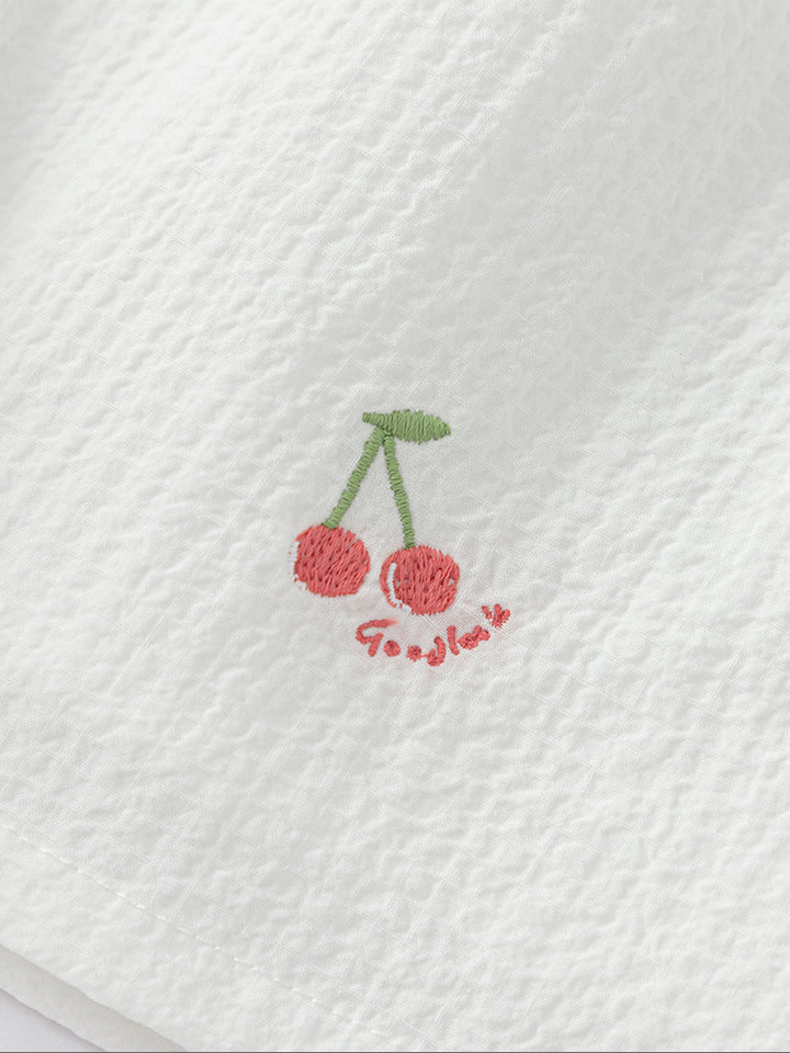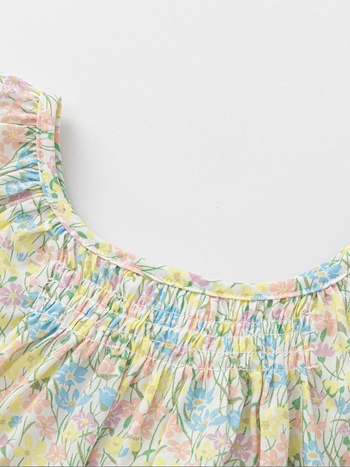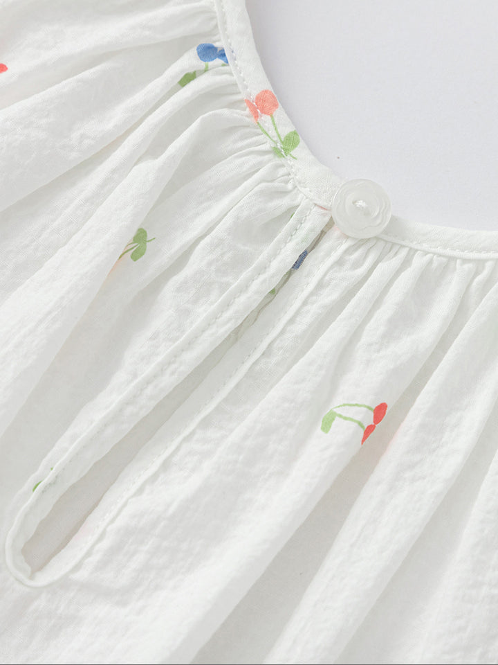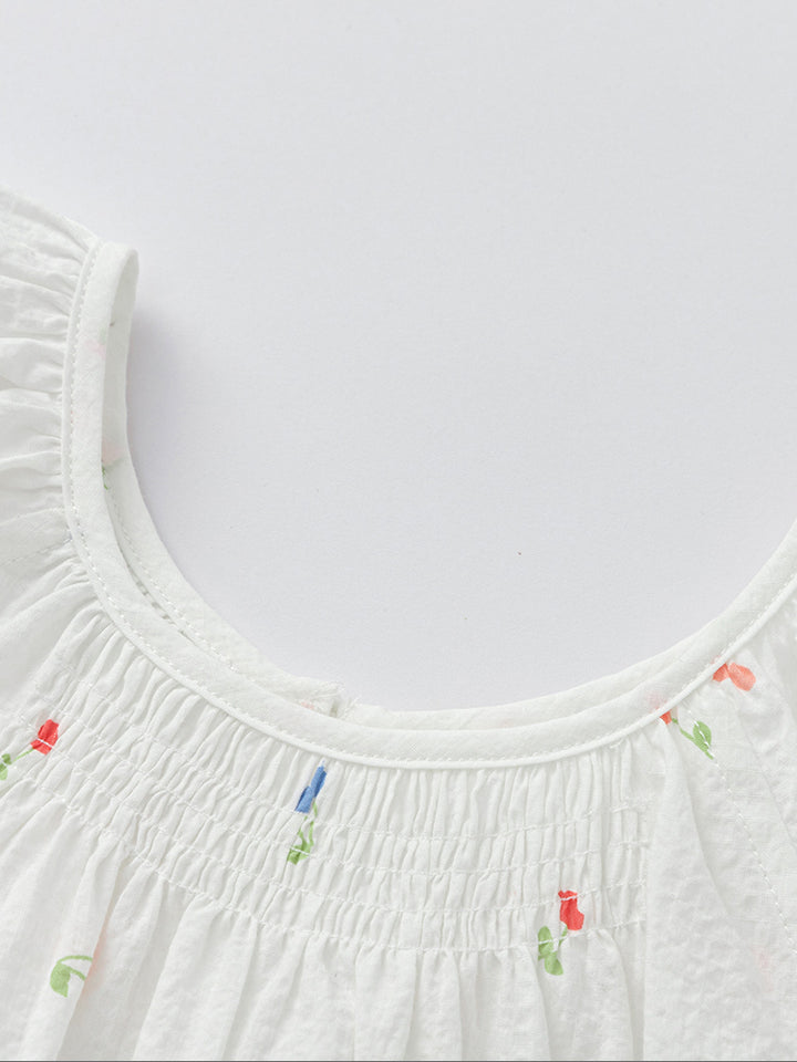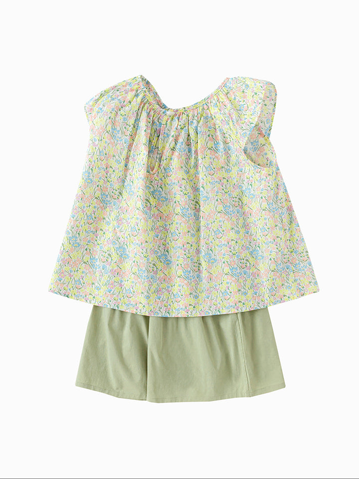 طقم مميز للأطفال الصغار يتكوّن من توب بدون أكمام بنقشة مطبوعة وياقة دائرية مع زر إغلاق خلفي، وتنورة مزينة بتطريز ناعم مع خصر مطاطي لراحة مثالية