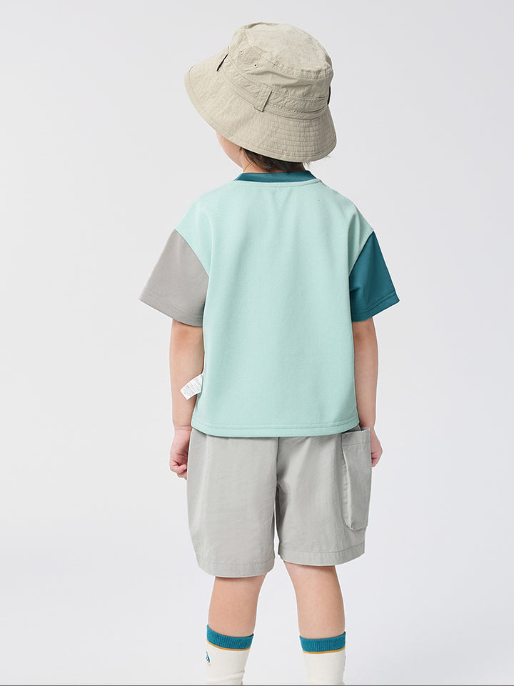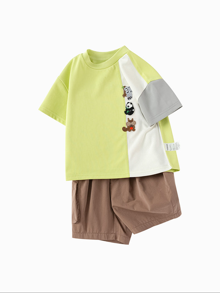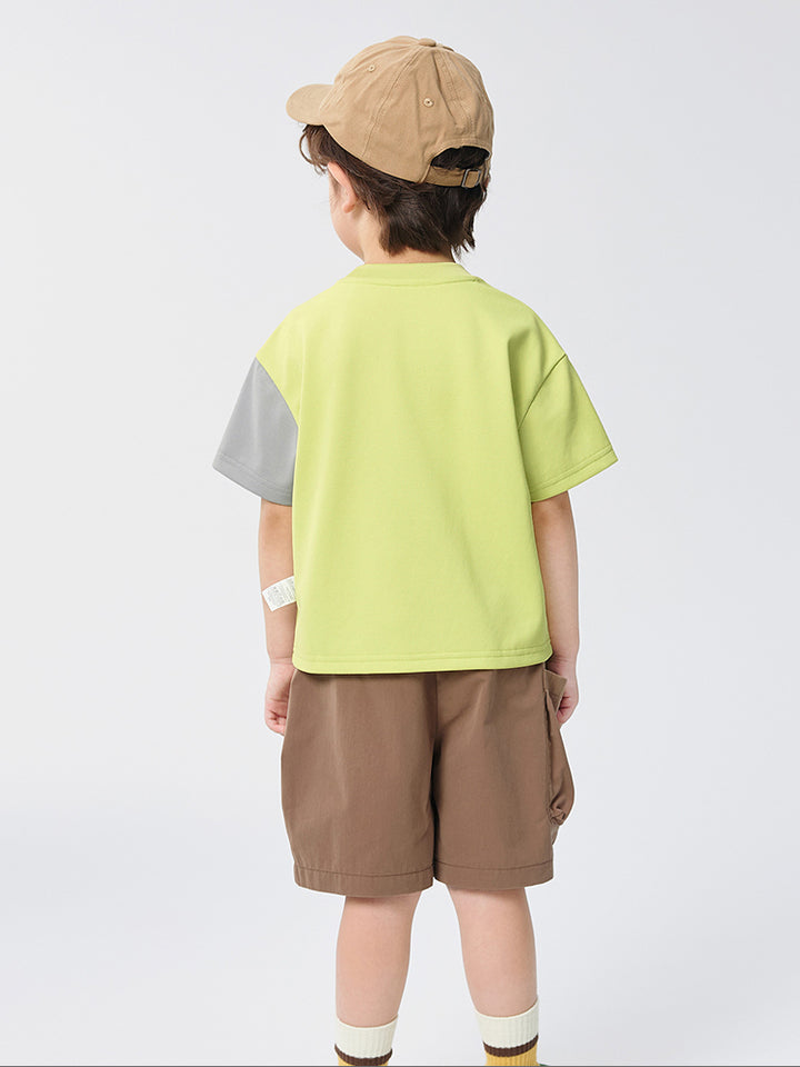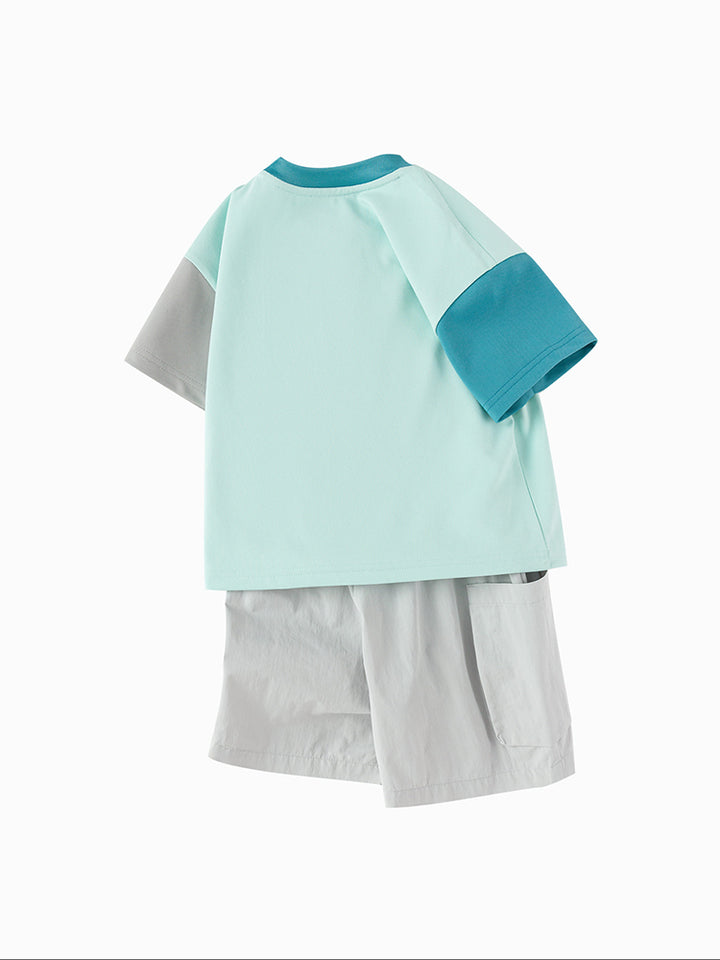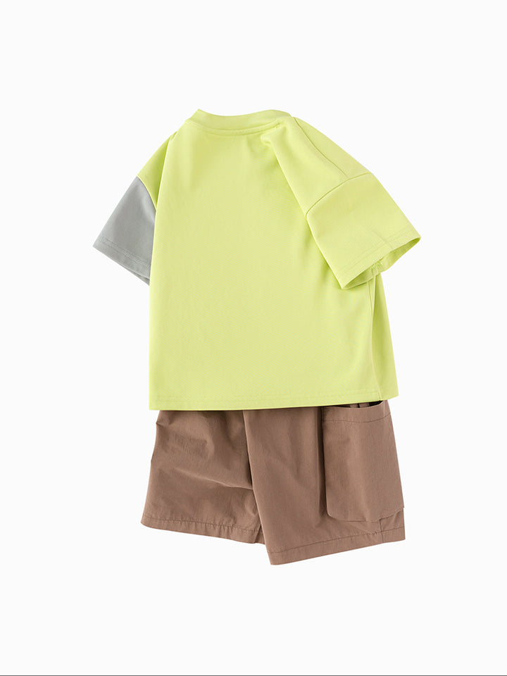 طقم عصري للأطفال الصغار يتكوّن من توب بأكمام قصيرة مع تفاصيل ملونة ورقع صغيرة، بالإضافة إلى شورت بلون ثابت مع جيوب وخصر مطاطي لراحة وأناقة مثالية