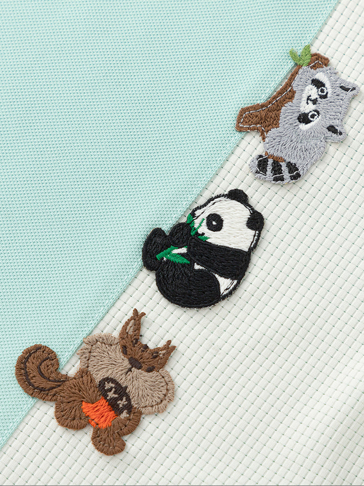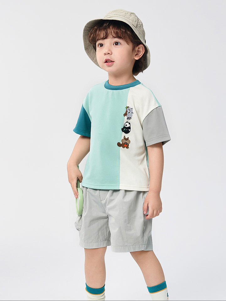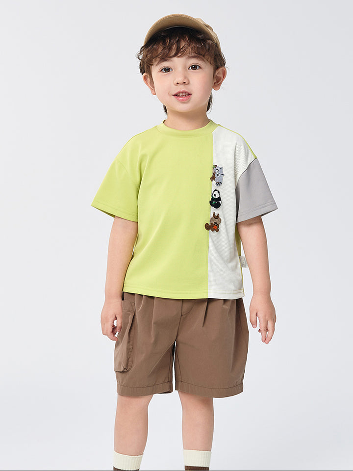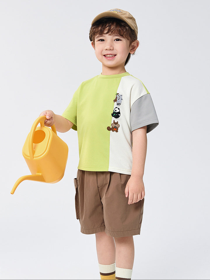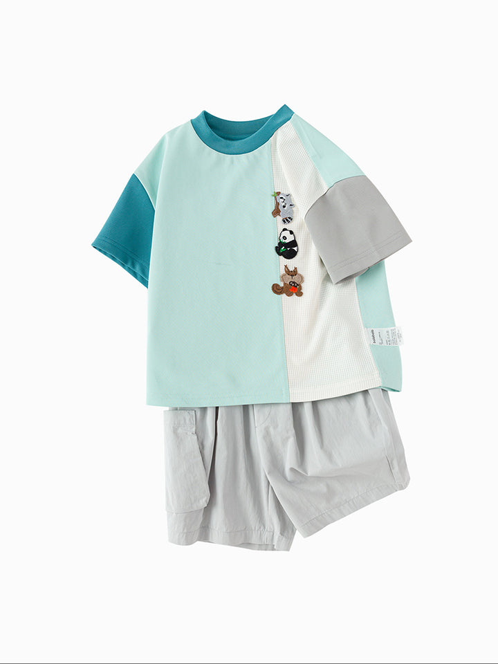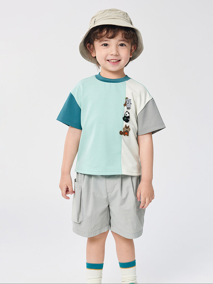 طقم عصري للأطفال الصغار يتكوّن من توب بأكمام قصيرة مع تفاصيل ملونة ورقع صغيرة، بالإضافة إلى شورت بلون ثابت مع جيوب وخصر مطاطي لراحة وأناقة مثالية