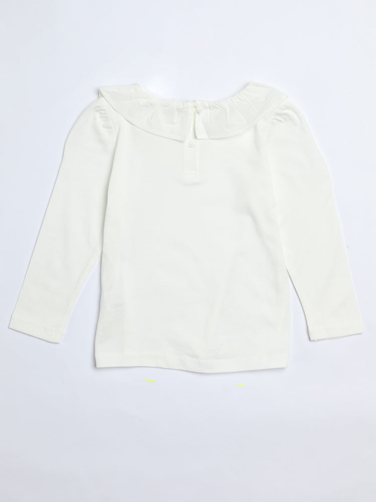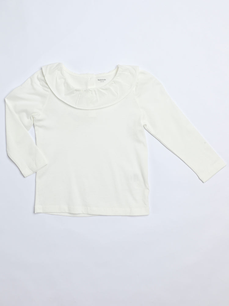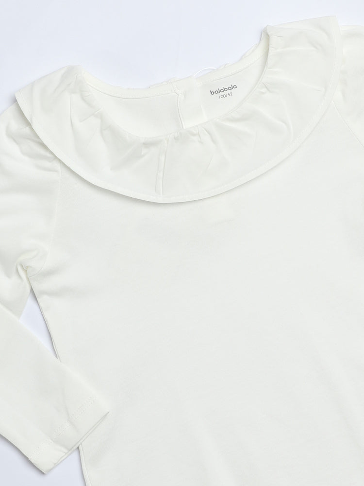 بلوزة أنيقة للأطفال بأكمام طويلة وتصميم بسيط يزينه كشكش ناعم على الياقة. مصنوعة من خامة مريحة وناعمة على البشرة، مثالية للإطلالات اليومية أو التنسيقات الرسمية البسيطة.