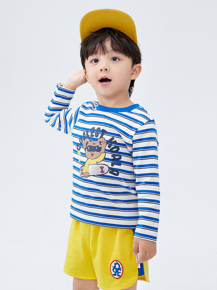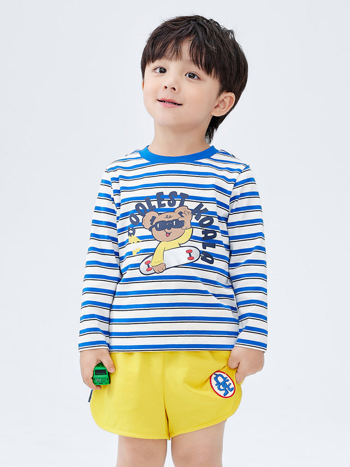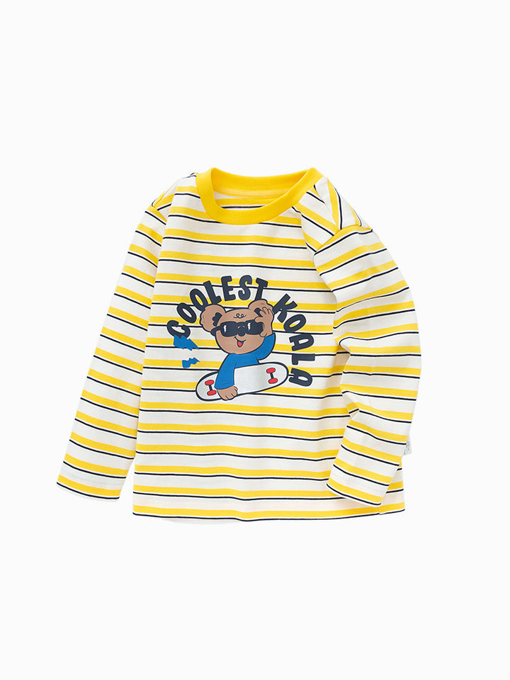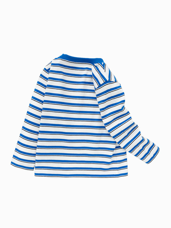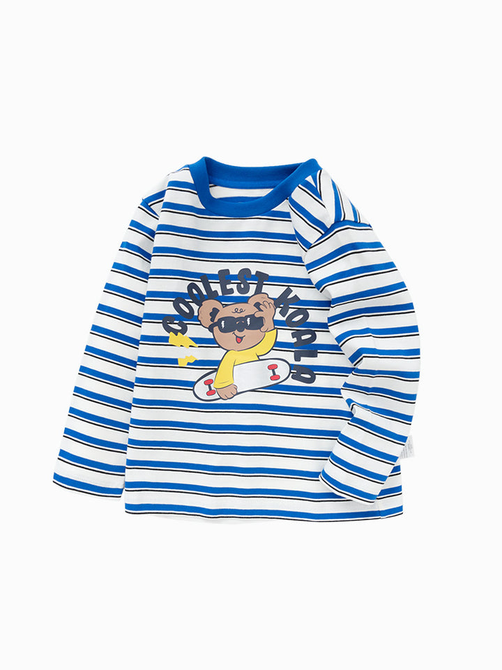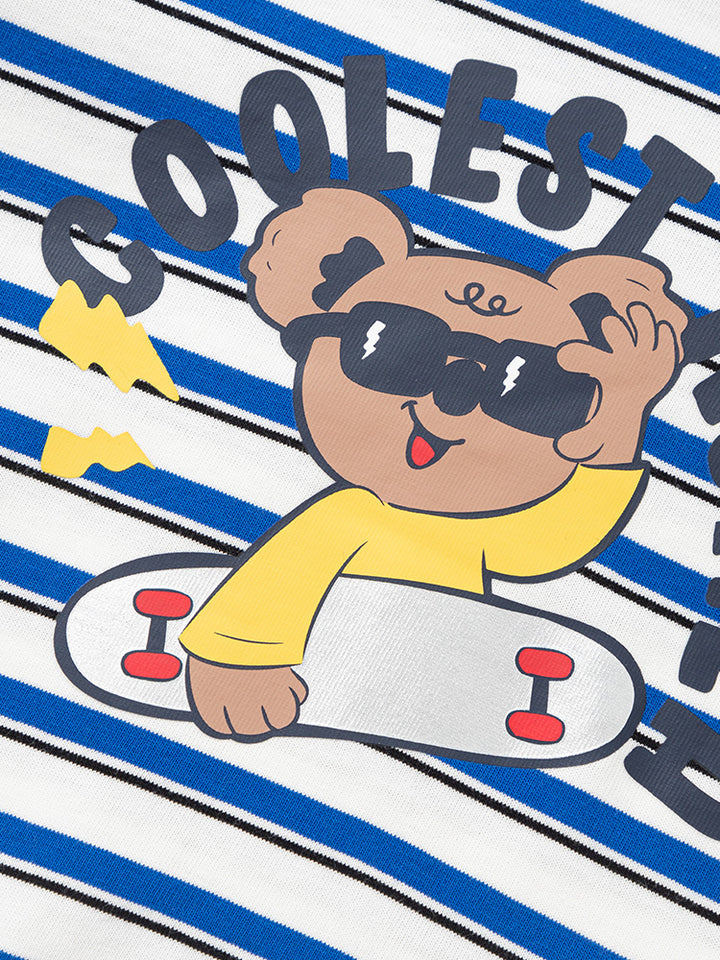 تيشيرت ولادي بأكمام طويلة، مزين بنمط مخطط على كامل التصميم وطبعة من الجهة الأمامية، ويأتي بياقة مدورة الشكل