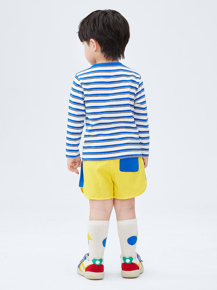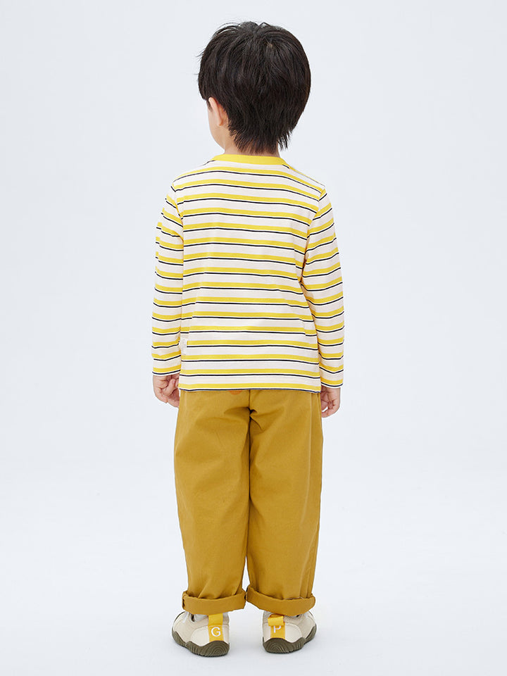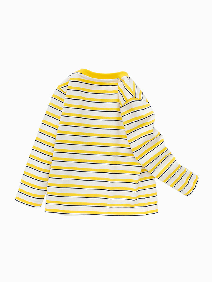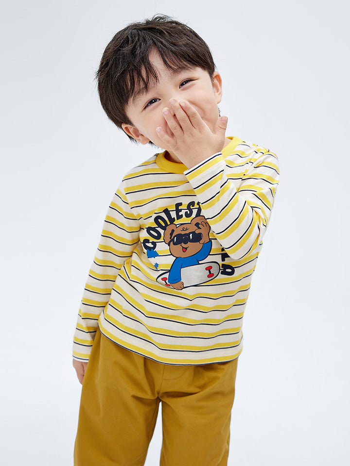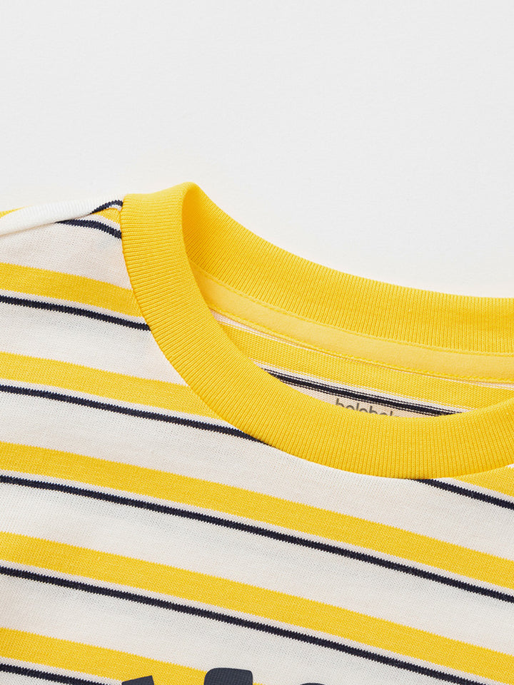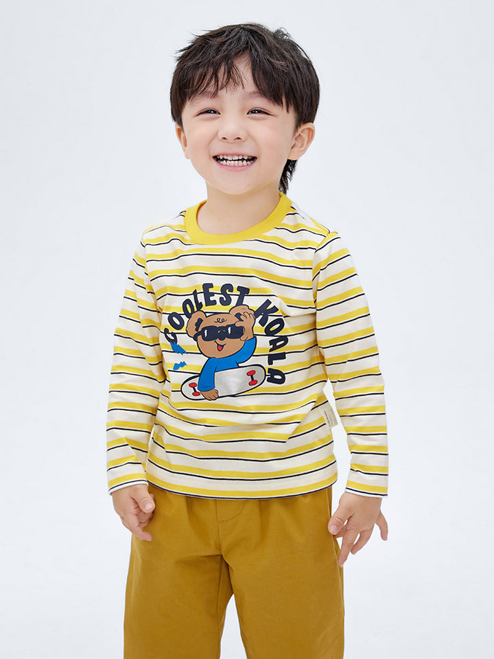 تيشيرت ولادي بأكمام طويلة، مزين بنمط مخطط على كامل التصميم وطبعة من الجهة الأمامية، ويأتي بياقة مدورة الشكل