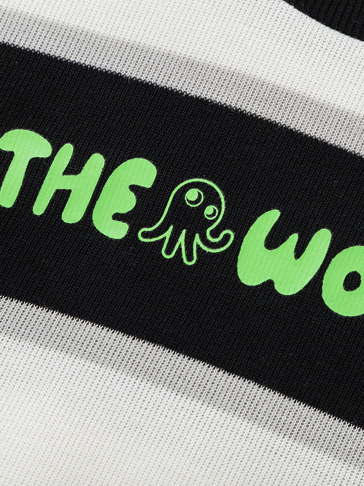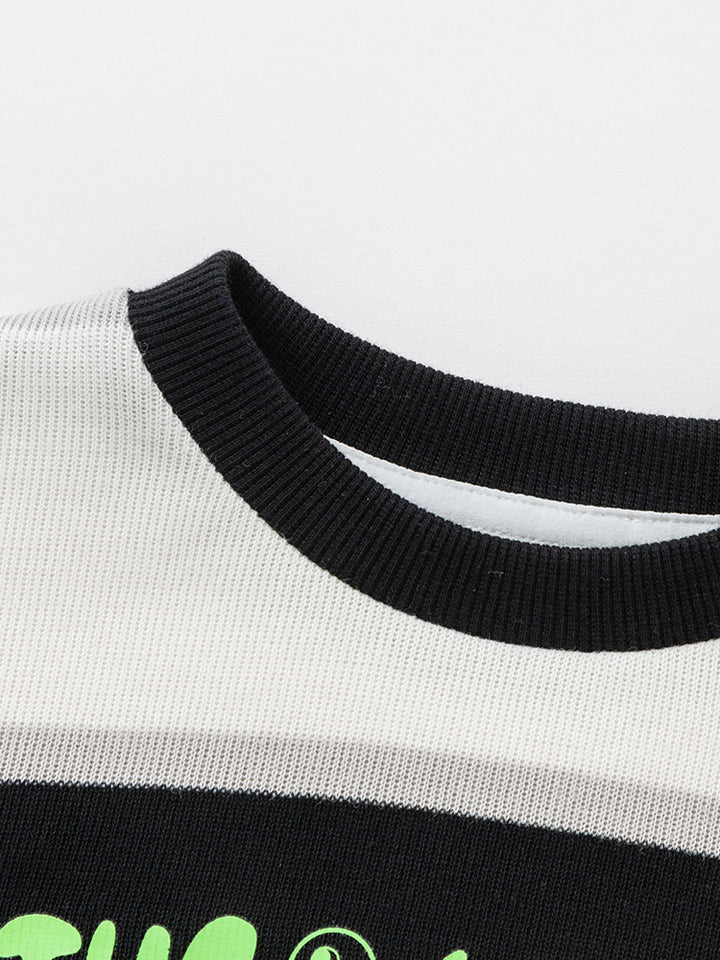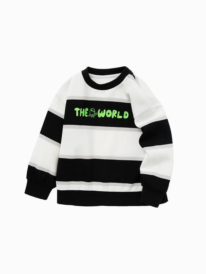 بلوزة سويت شيرت ولادي كاجوال بأكمام طويلة، مزين بنمط مخطط على كامل التصميم وطبعة من الجهة الأمامية، تأتي بياقة مدورة الشكل