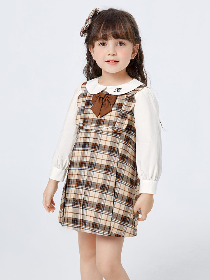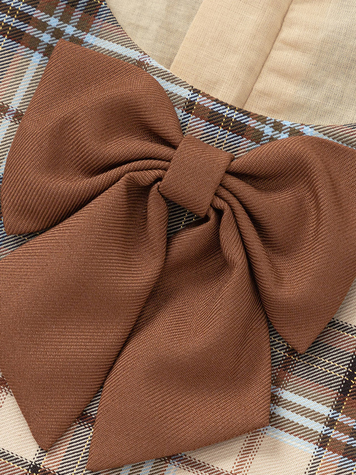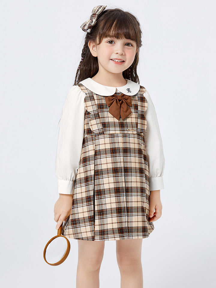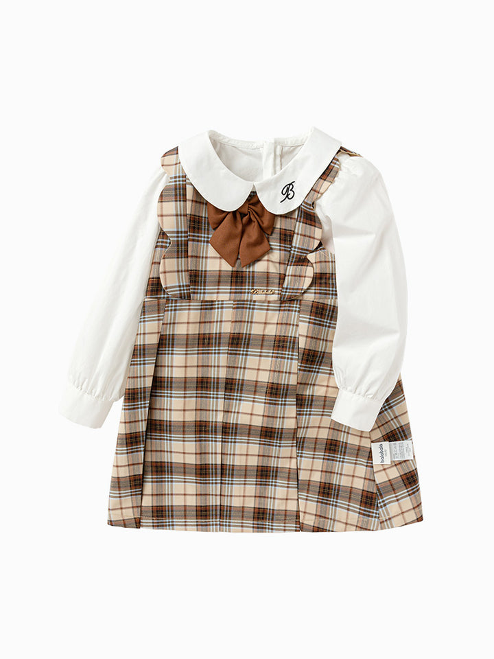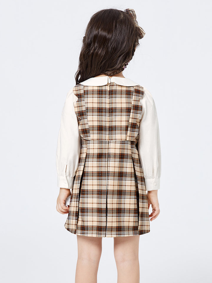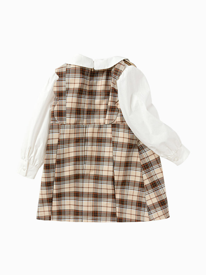 فستان بأكمام طويلة مزين بنمط مطبع بطبعة مربعات، تفاصيل من الجهة الأمامية، يأتي بسحاب للإغلاق من الجهة الخلفية وبياقة كلاسيكية