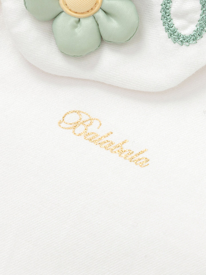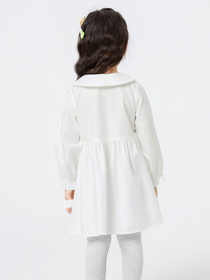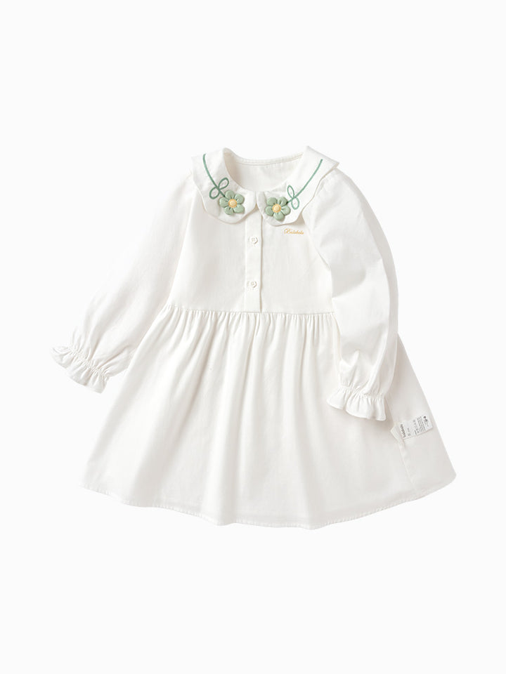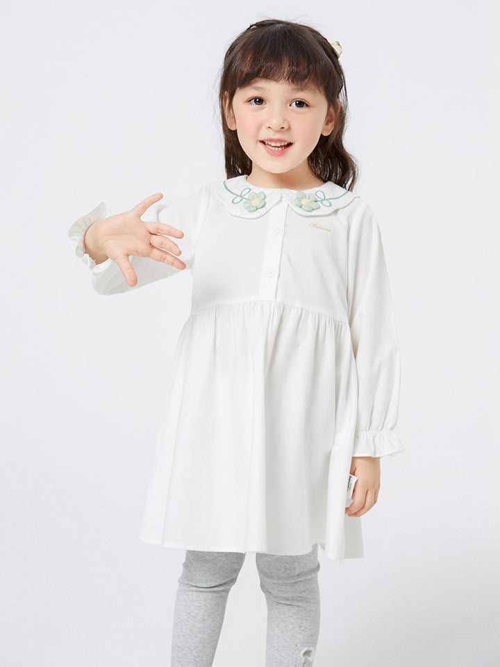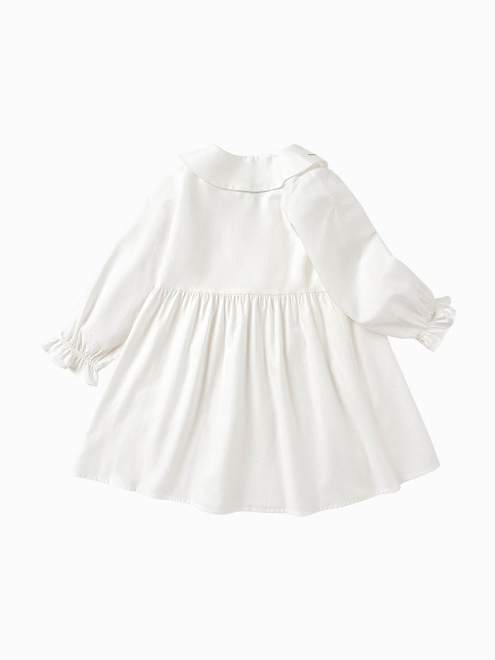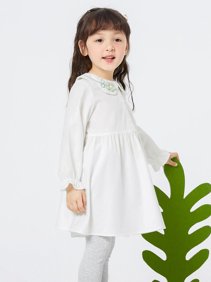 فستان بأكمام طويلة بلون موحد، مزين بتفاصيل على شكل ورود مطرزة على الياقة، يأتي بأزرار للإغلاق من الجهة الأمامية وبياقة كلاسيكية