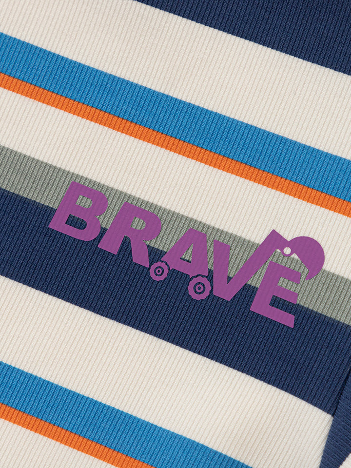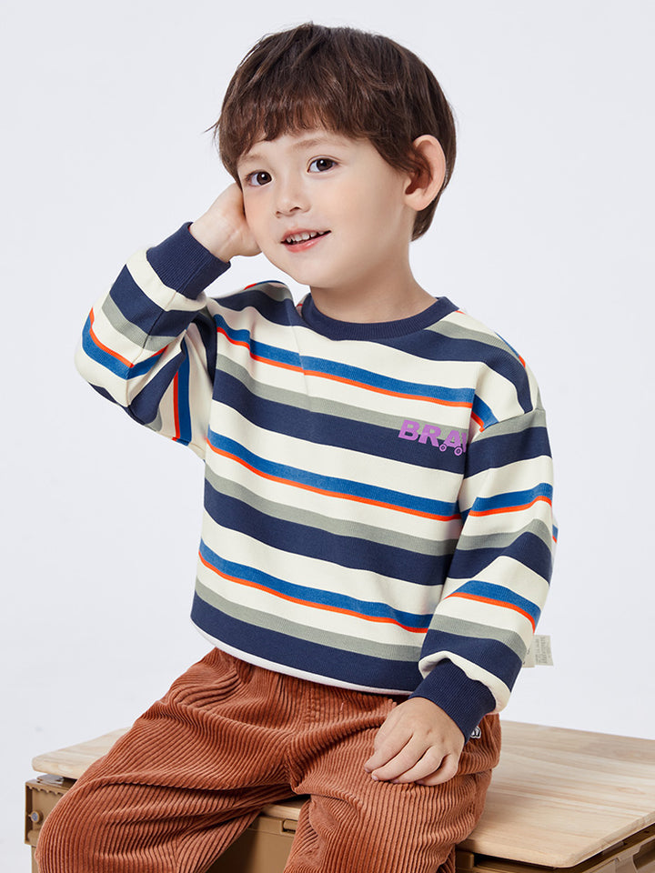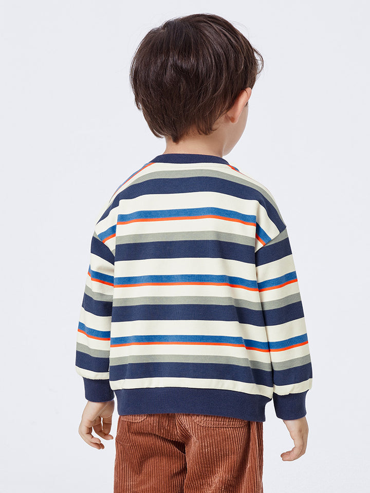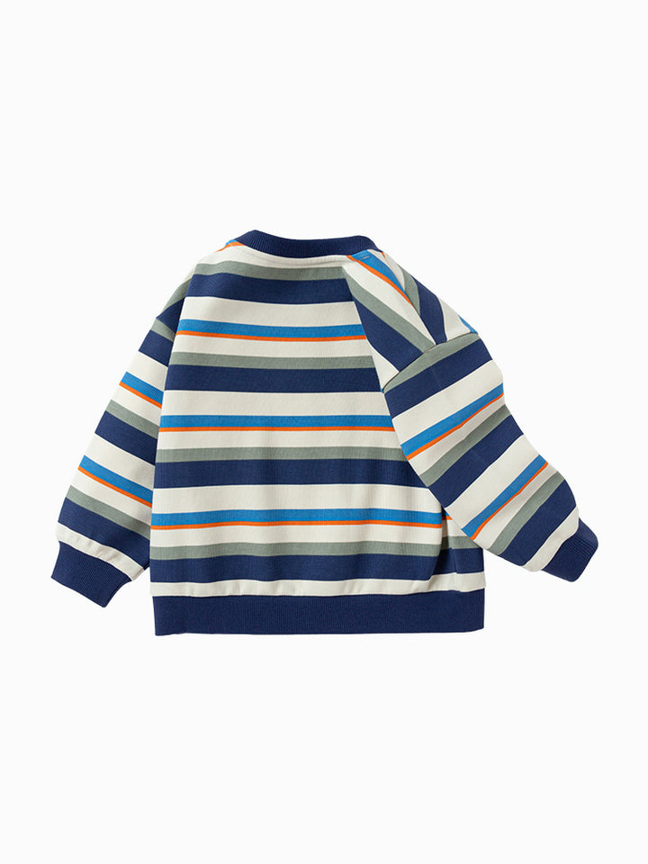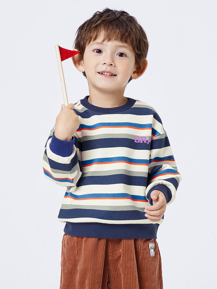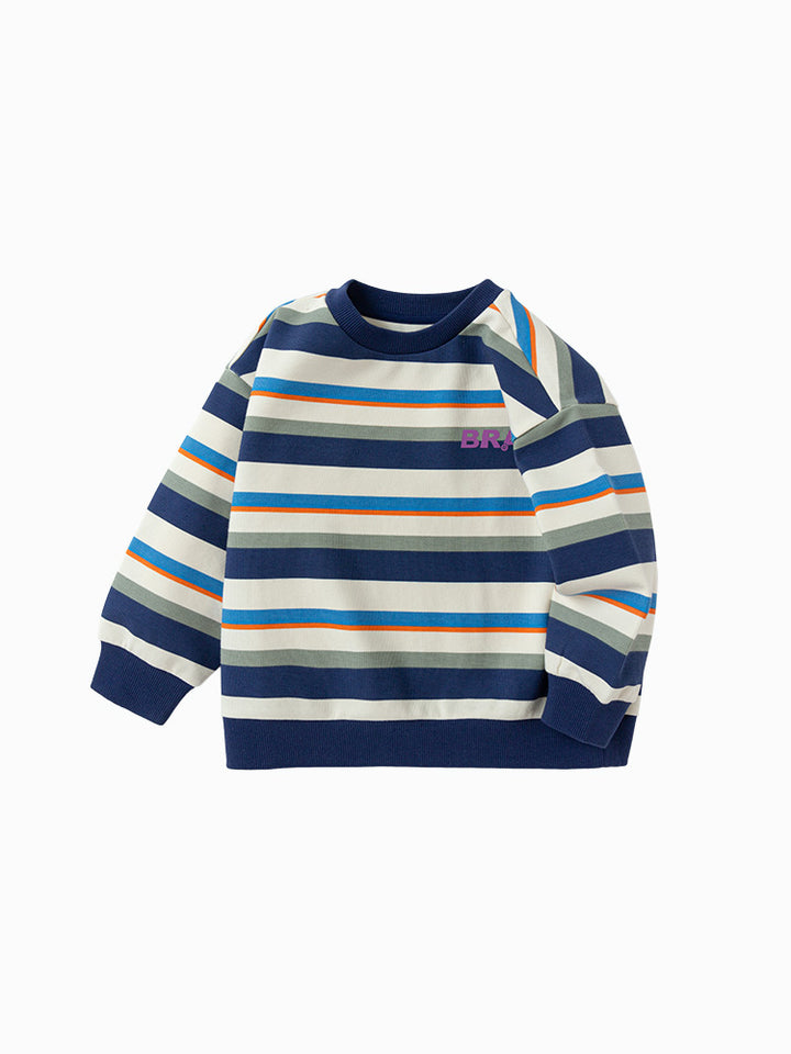 بلوزة سويت شيرت كاجوال بأكمام طويلة، مزينة بنمط مخطط ملون وطبعة من الجهة الأمامية، تأتي بياقة مدورة الشكل