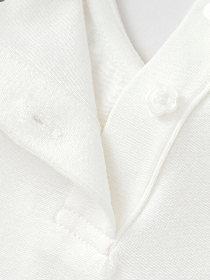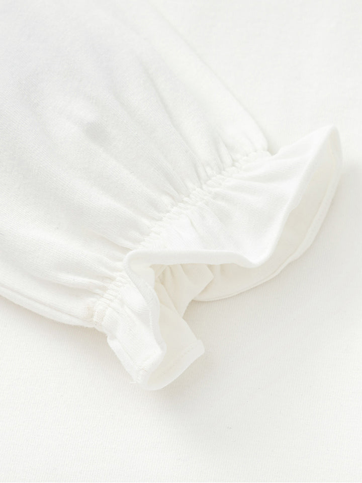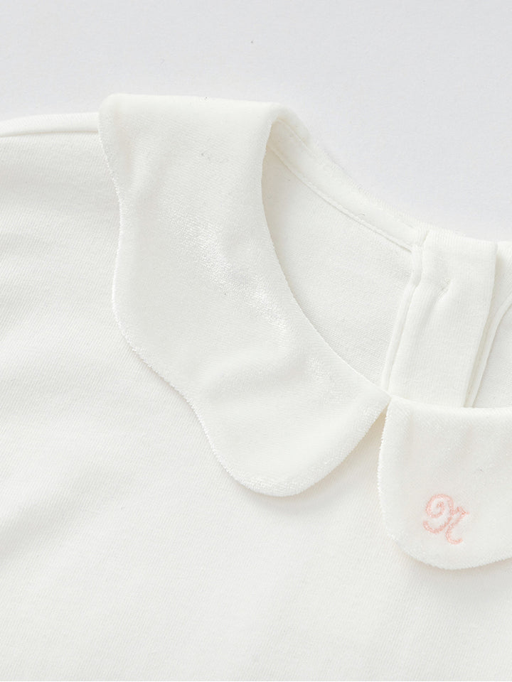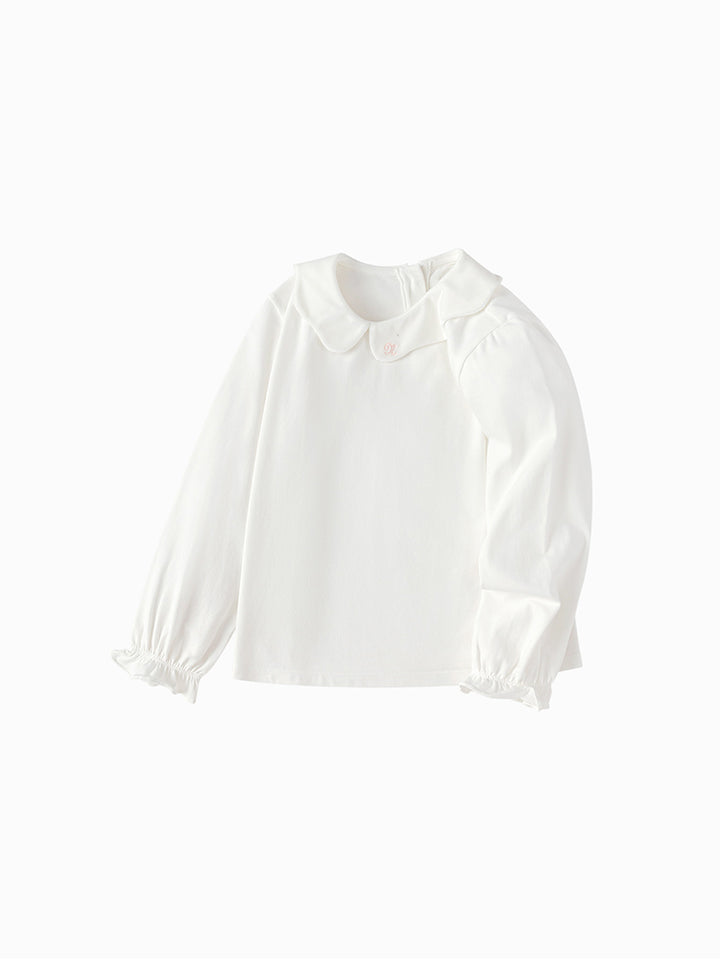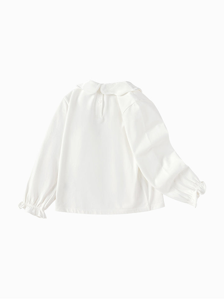 بلوزة بناتي بأكمام طويلة وبنمط ذو لون موحد، مزينة بتفاصيل تطريز صغيرة على الياقة وكشكش على أطراف الأكمام، تأتي بأزرار للإغلاق من الجهة الخلفية وبياقة مدورة الشكل مع تفاصيل ياقة مطوية