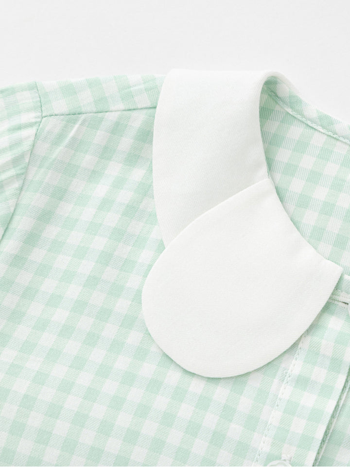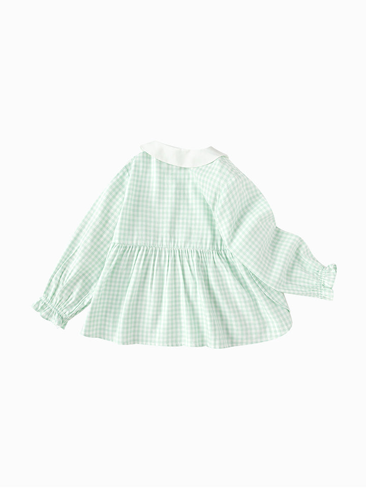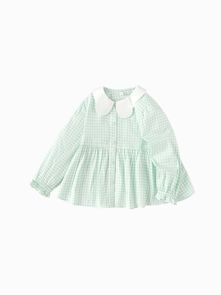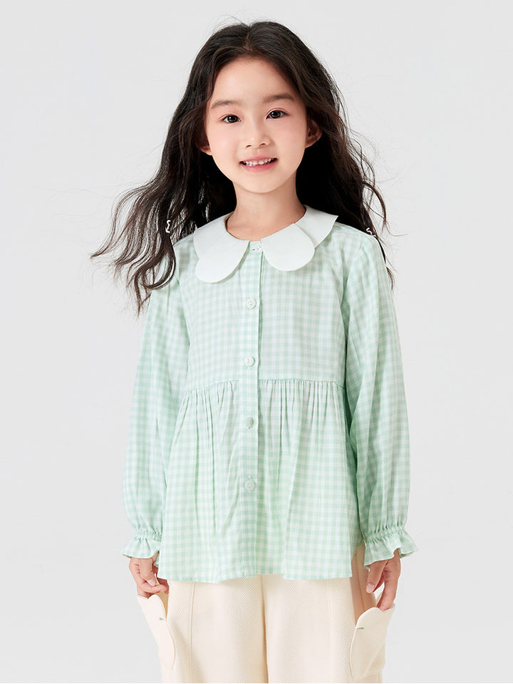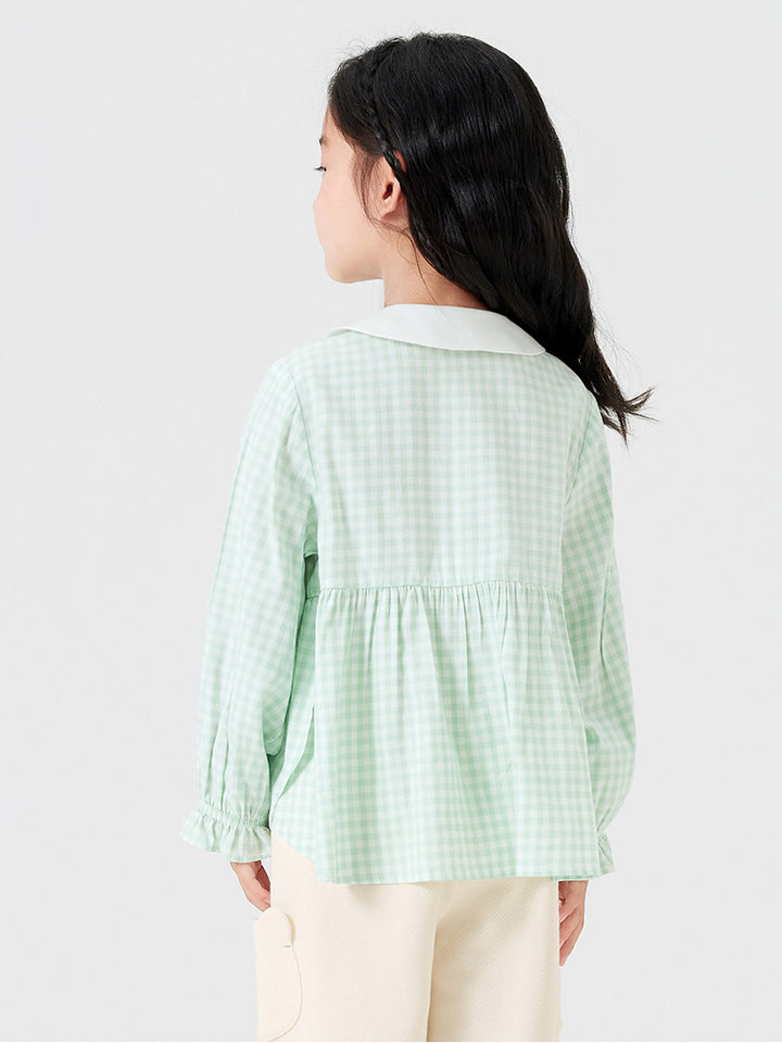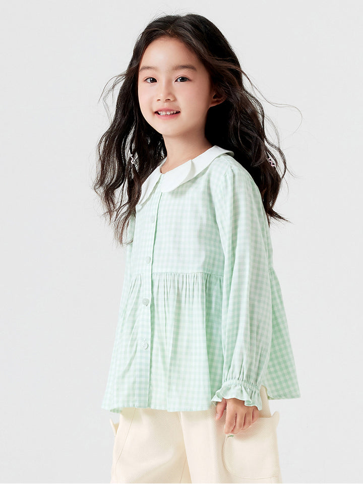 قميص بناتي بأكمام طويلة مزين بنمط طبعة مربعات، ياتي بأزرار للإغلاق وبياقة عادية
