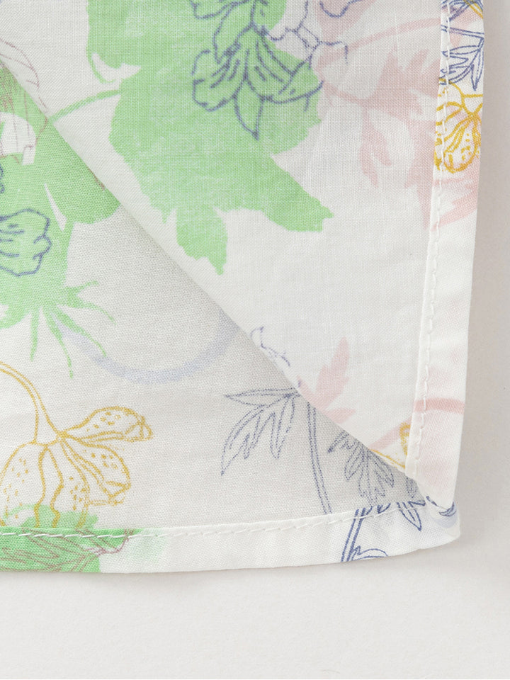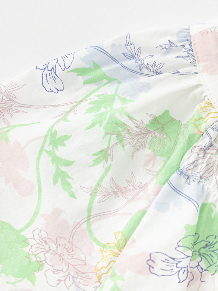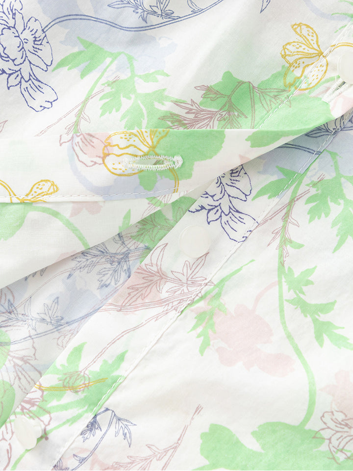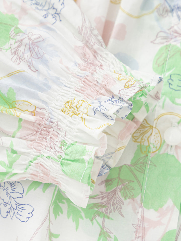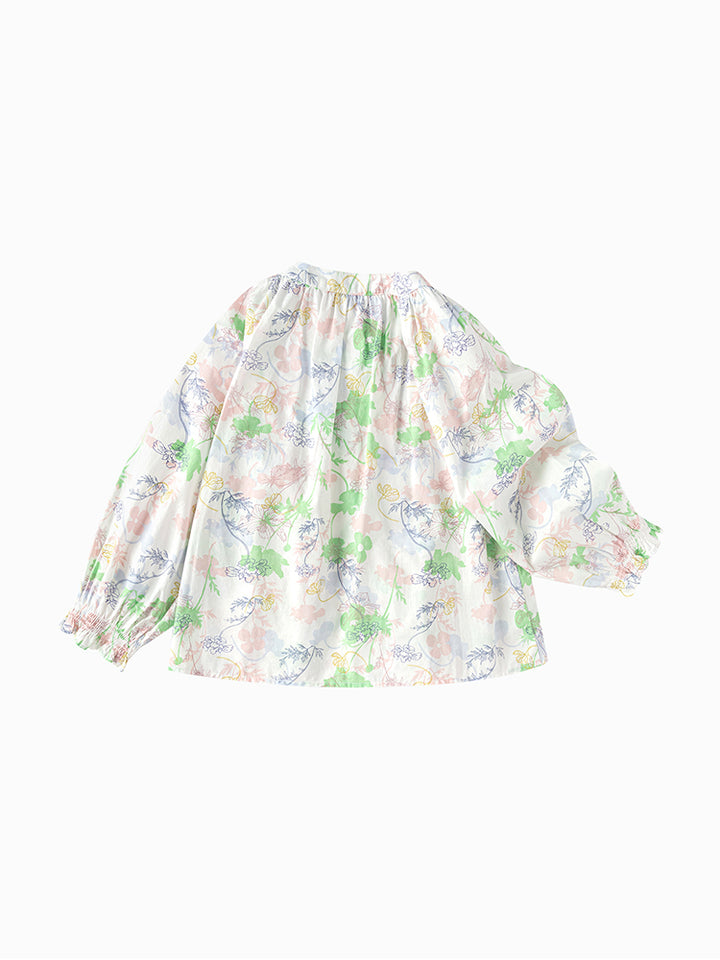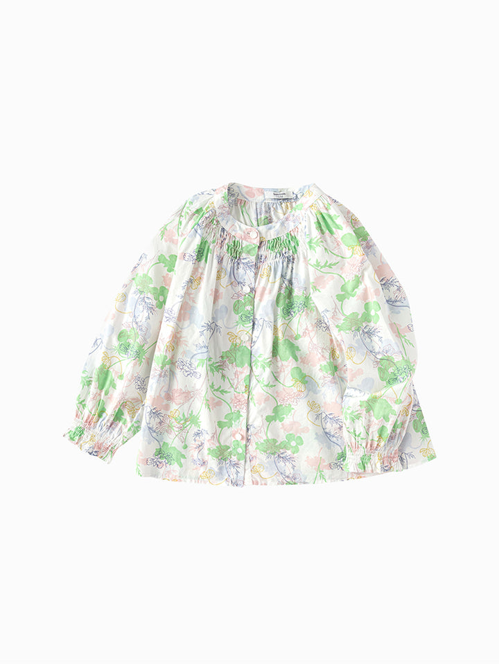 قميص بناتي بأكمام طويلة مزين بنمط طبعات، ياتي بأزرار للإغلاق وبياقة مدورة