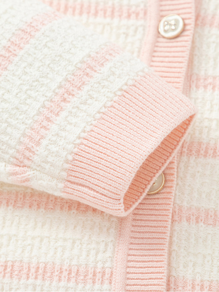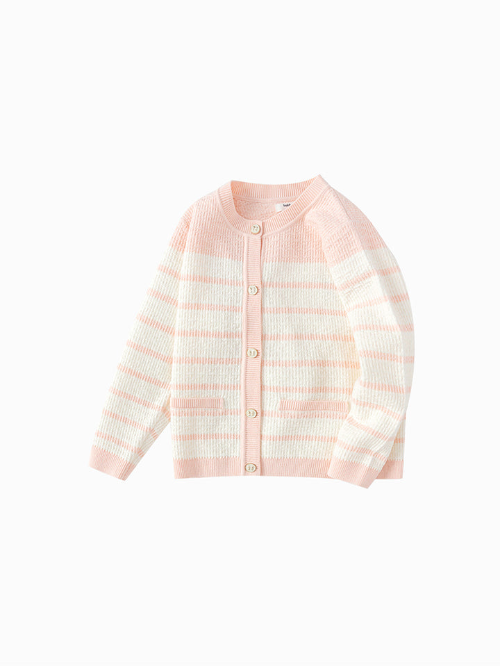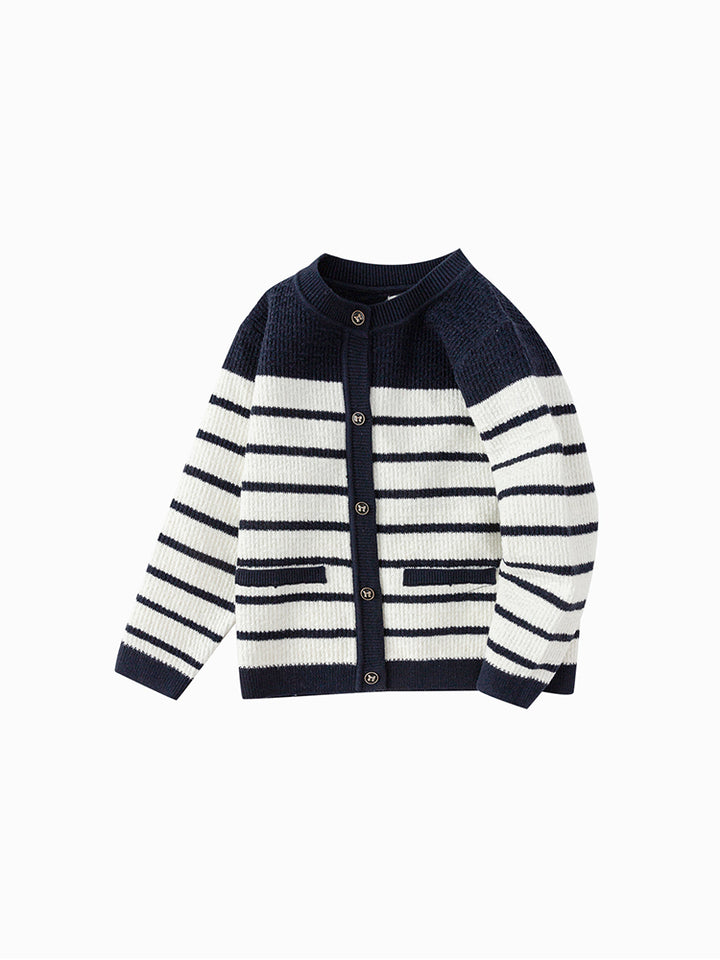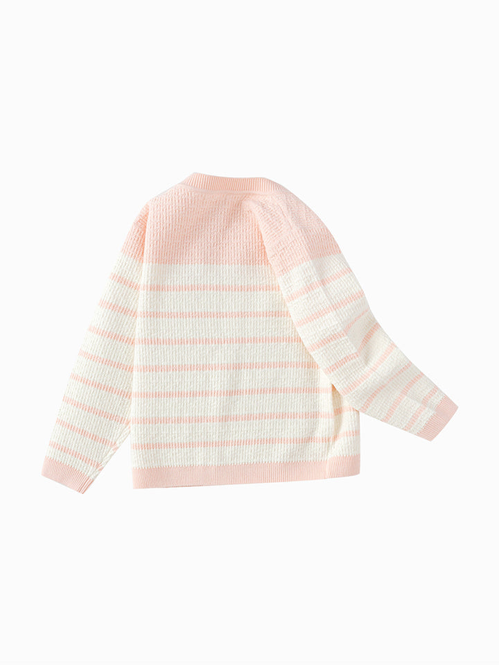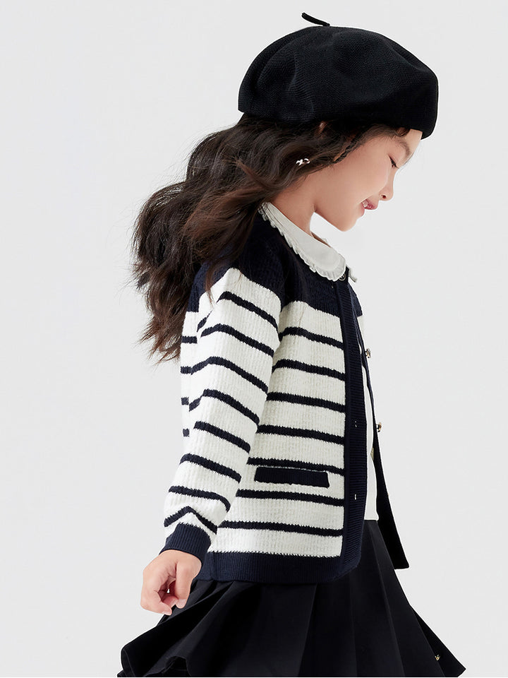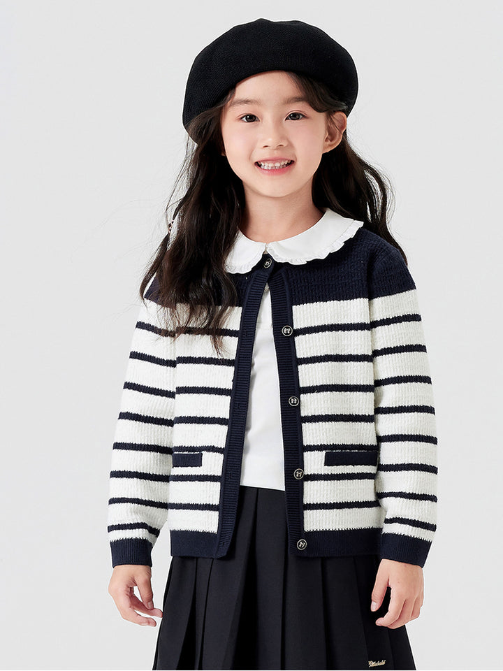 جاكيت كارديغان بناتي بأكمام طويلة وبنسيج صوف محبوك، مزين بنمط مخطط متباين اللون، ياتي بجيوب من الجهة الأمامية، أزرار للإغلاق من الجهة الأمامية وبياقة مدورة الشكل