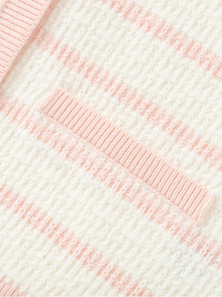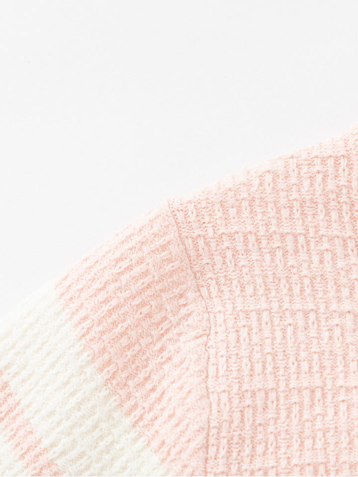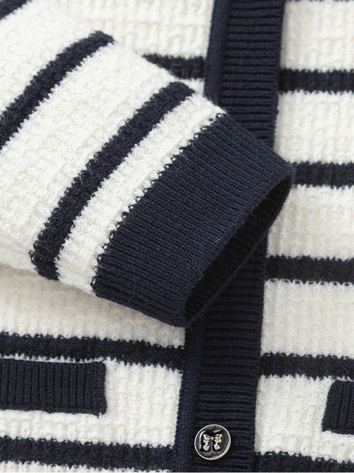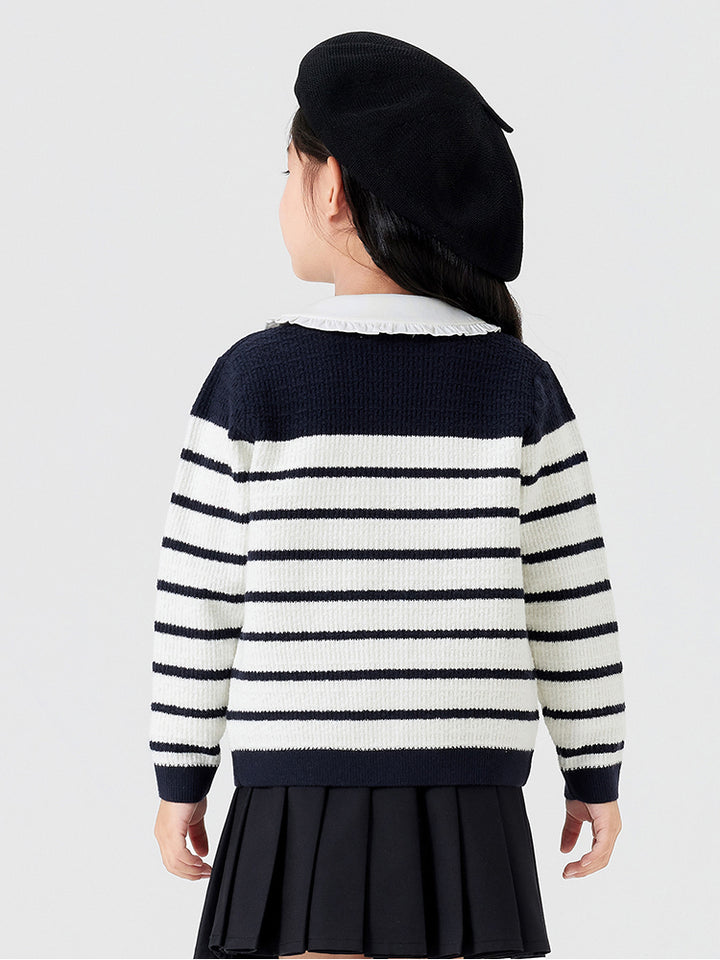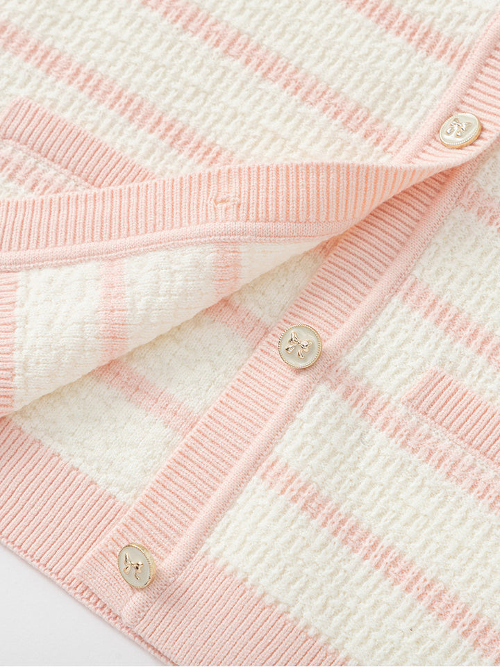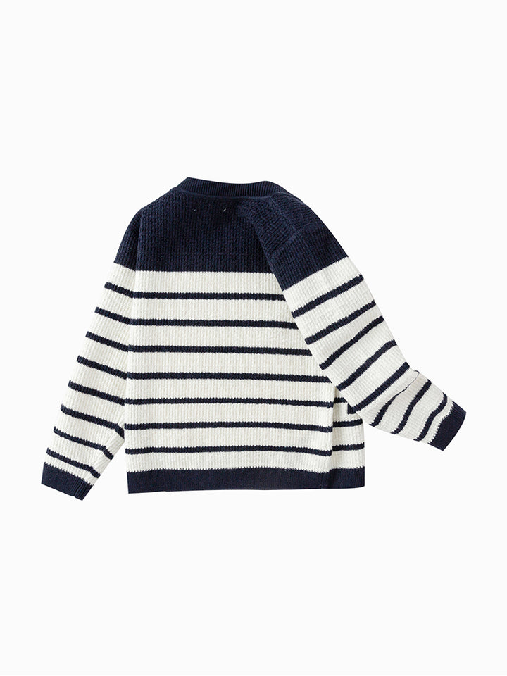 جاكيت كارديغان بناتي بأكمام طويلة وبنسيج صوف محبوك، مزين بنمط مخطط متباين اللون، ياتي بجيوب من الجهة الأمامية، أزرار للإغلاق من الجهة الأمامية وبياقة مدورة الشكل