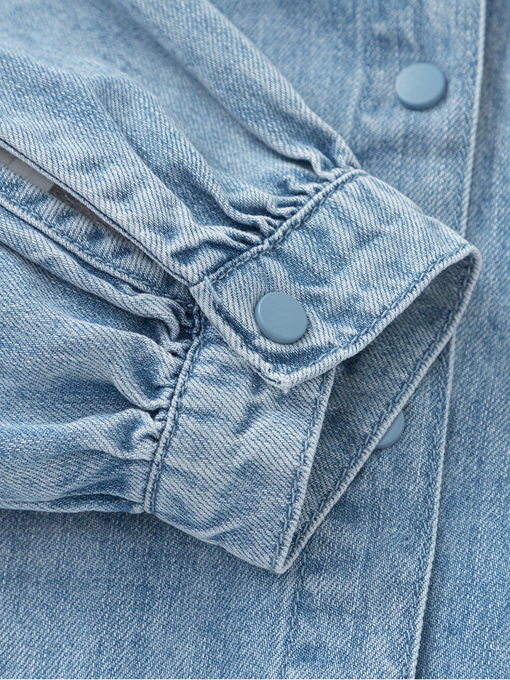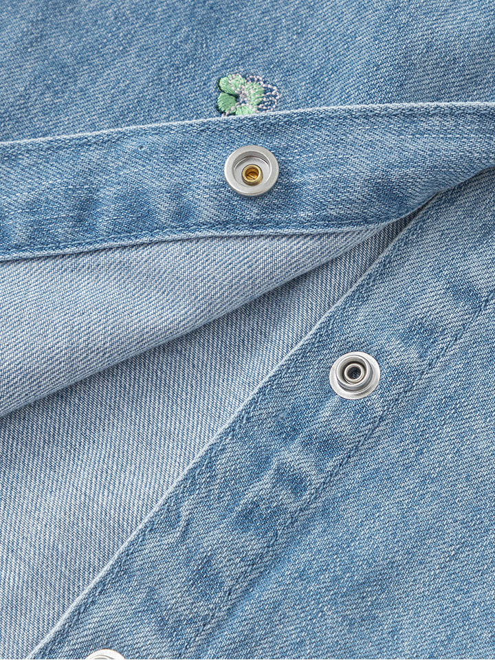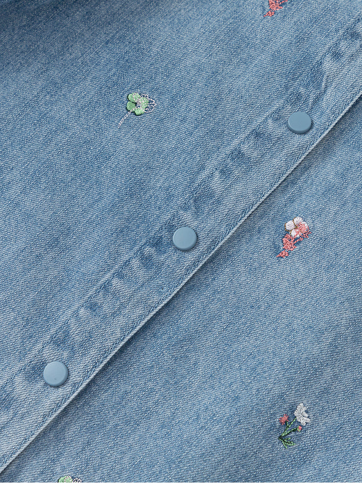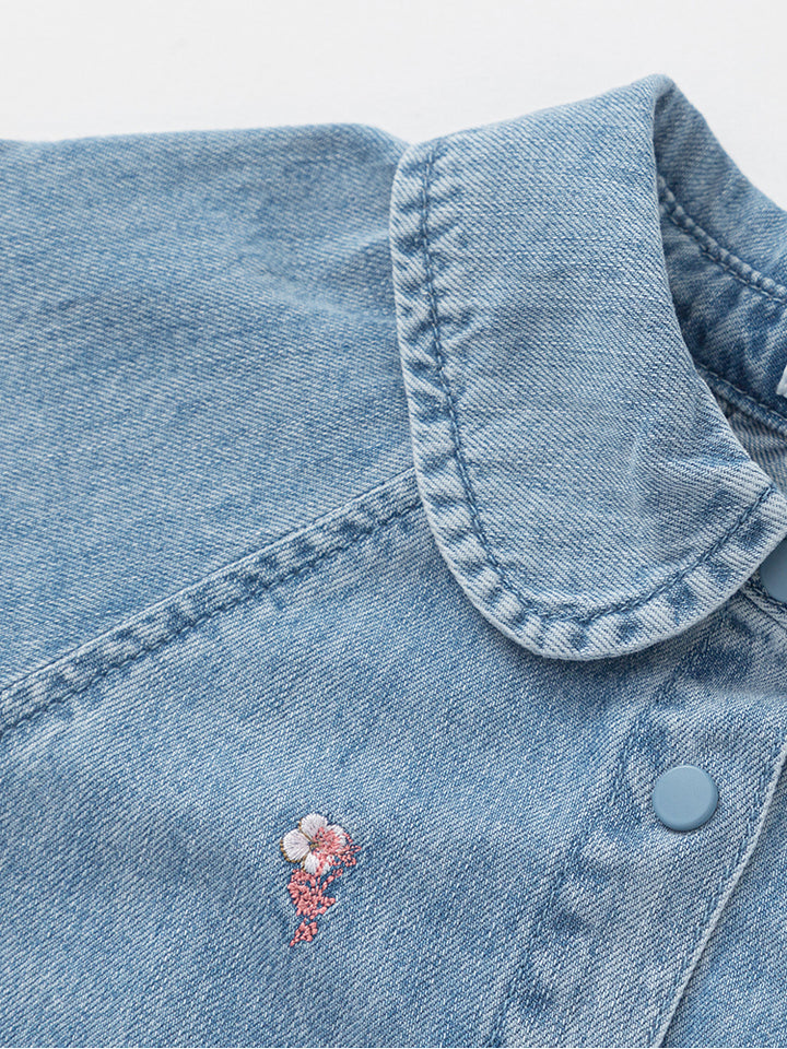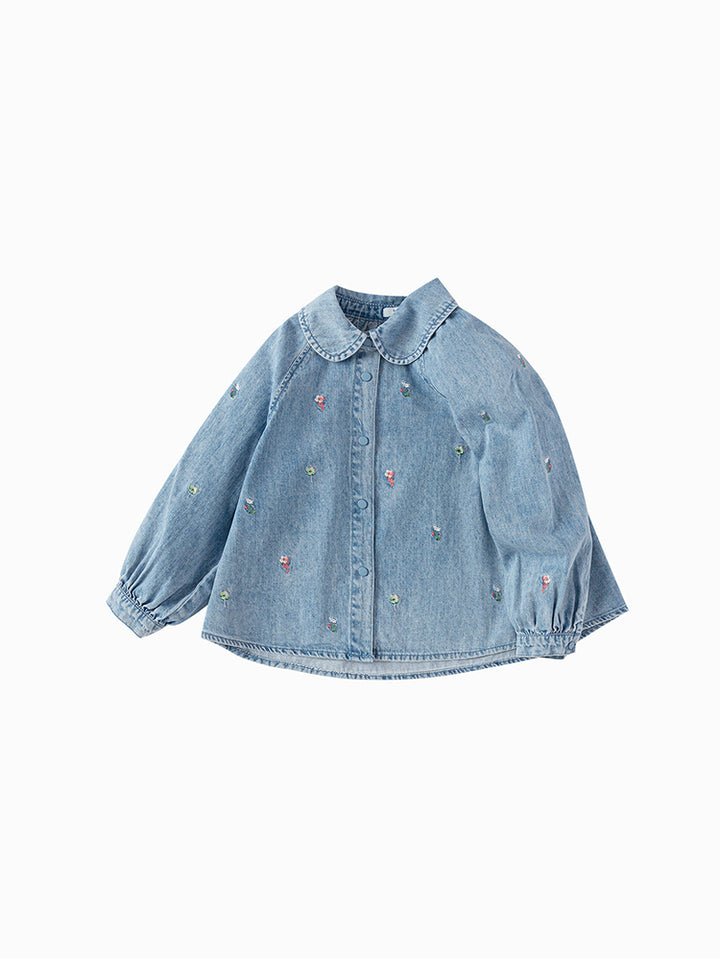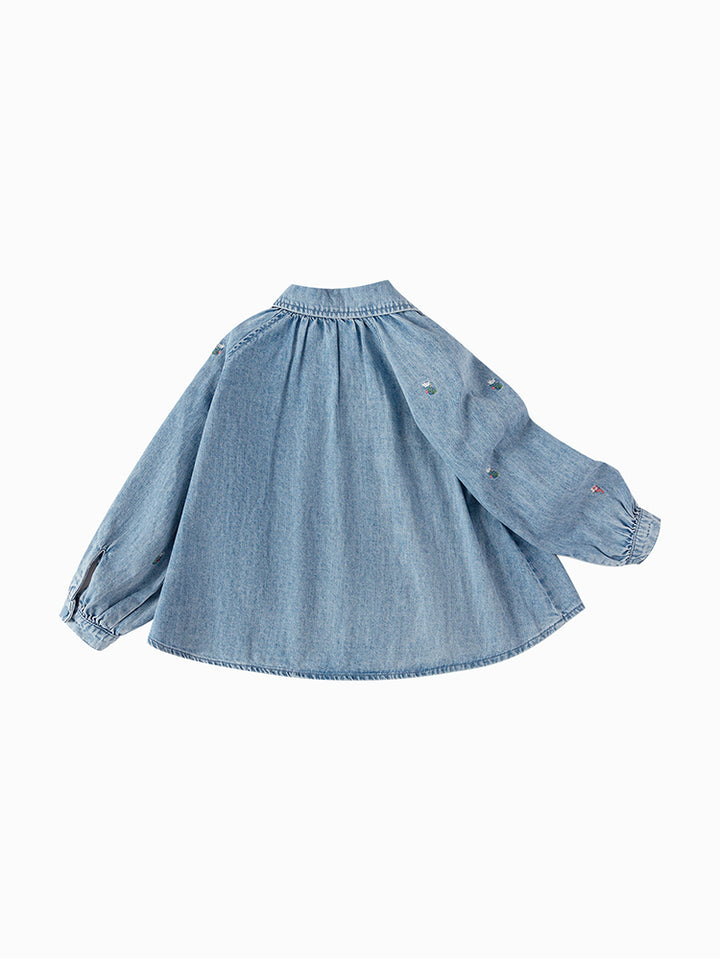قميص جينز بناتي بأكمام طويلة، مزين بتفاصيل مطرزة، ياتي بازرار للإغلاق من الجهة الأمامية وياقة عادية