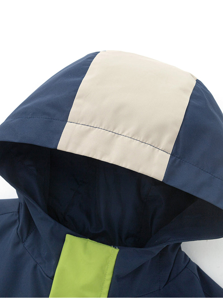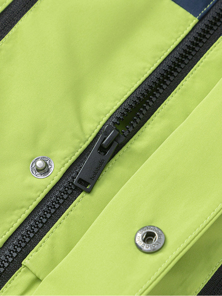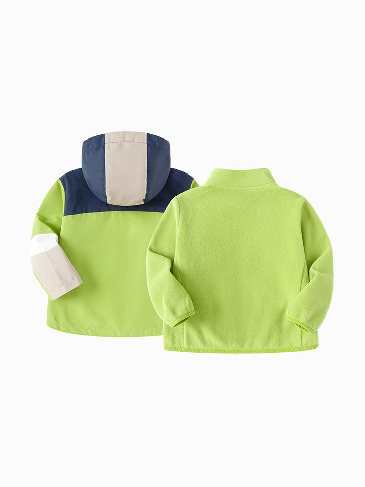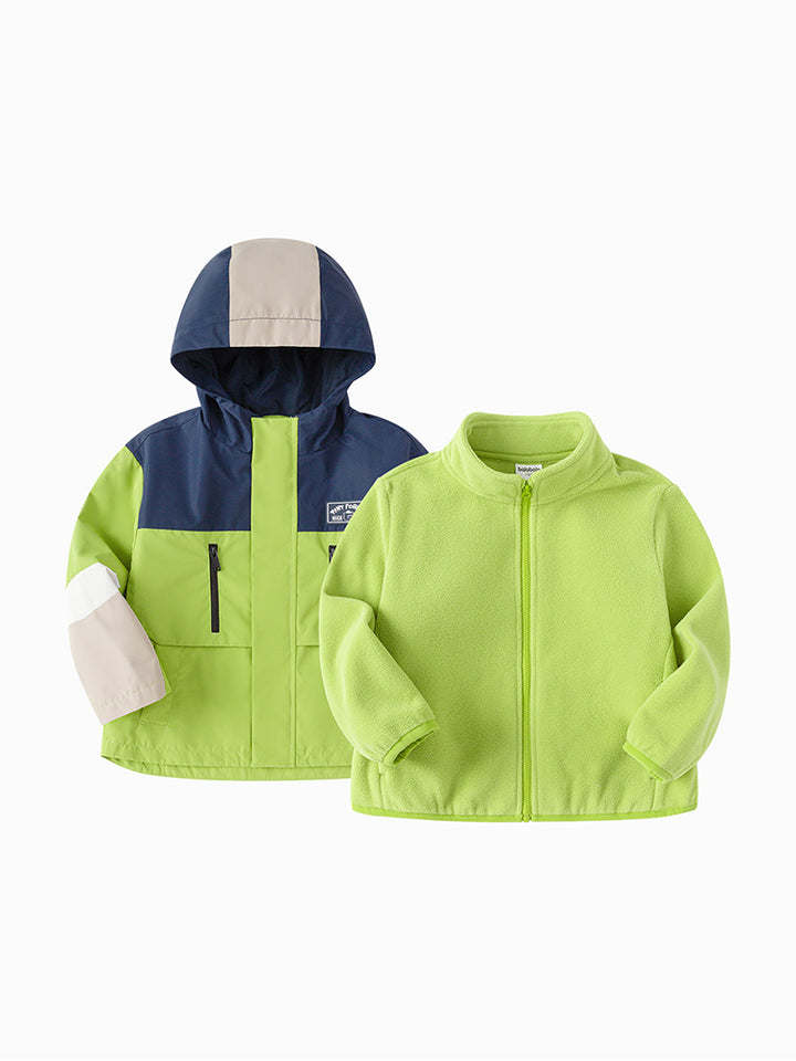طقم جاكيت شتوي مكون من قطعتين، جاكيت داخلي بأكمام طويلة وخامة دافئة بلون موحد سادة، يأتي بجيوب أمامية، سحاب للإغلاق من الجهة الأمامية وبياقة مدورة مرتفعة، وجاكيت شتوي خارجي بأكمام طويلة مزين بتفاصيل ملونة، يأتي بسحاب أمامي للإغلاق، جيوب من الجهة الأمامية وبياقة هودي متصلة