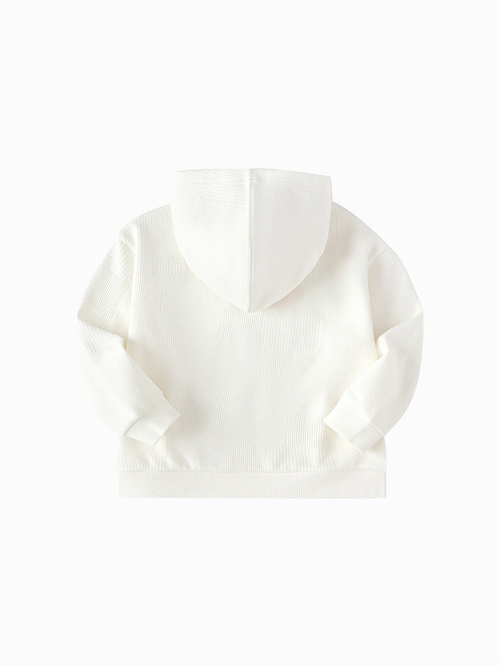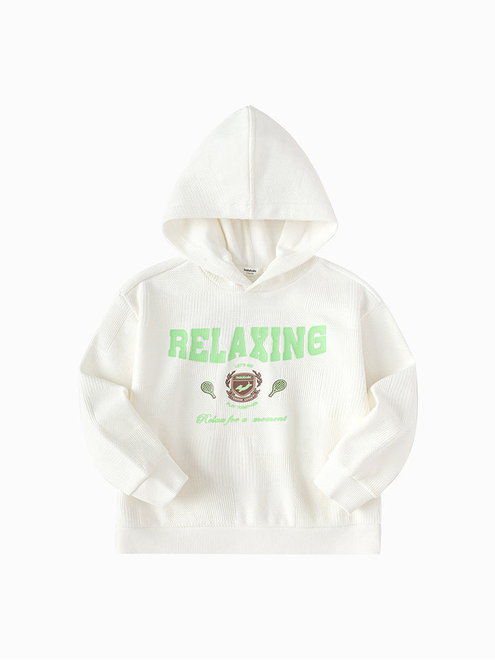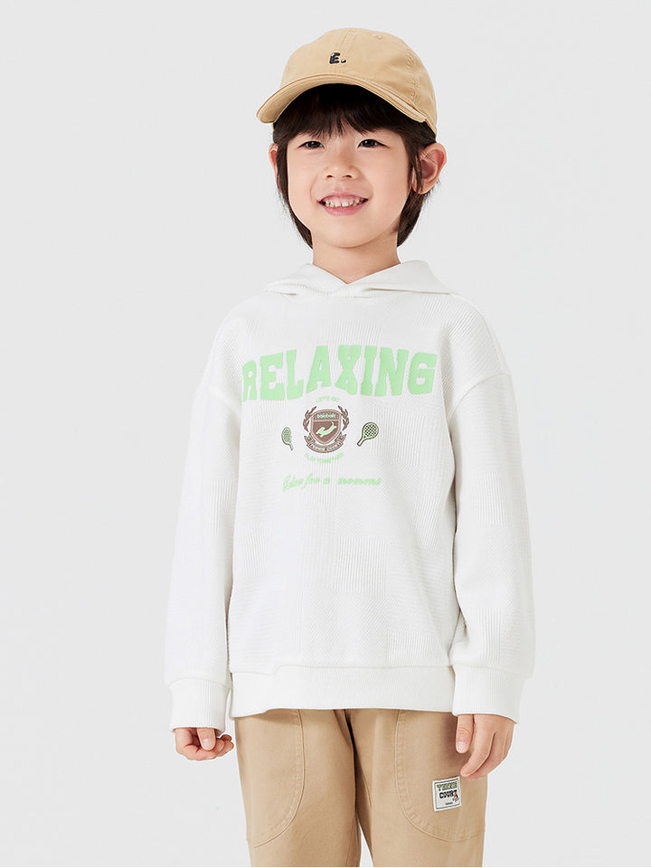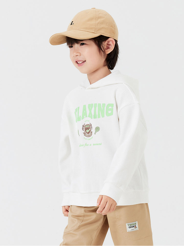 بلوزة هودي ولادي بأكمام طويلة، مزينة بطبعة وتأتي بياقة هودي متصلة