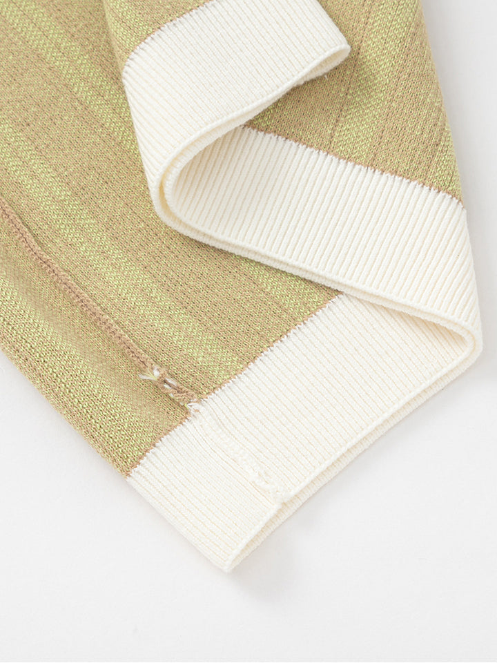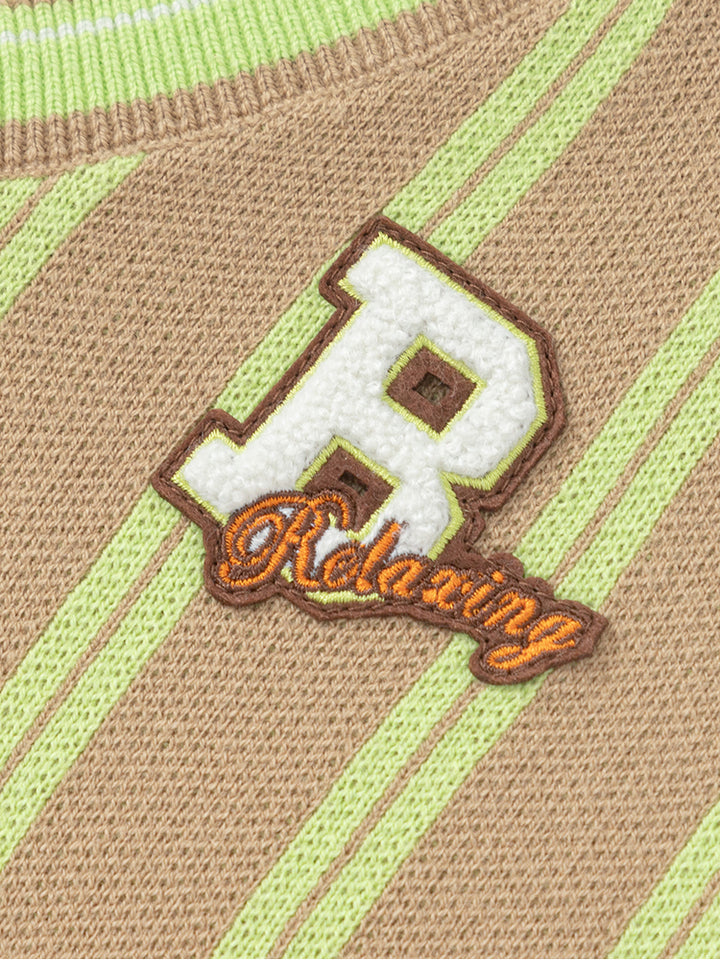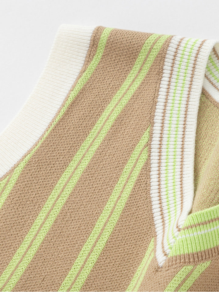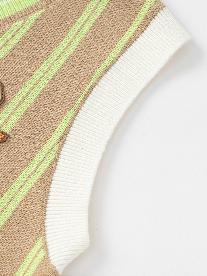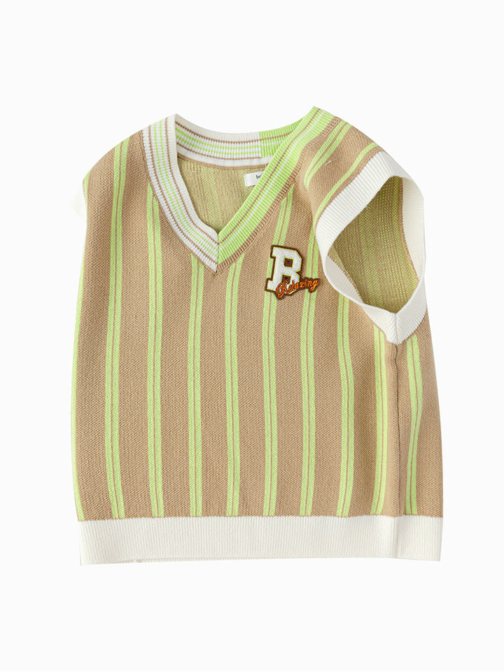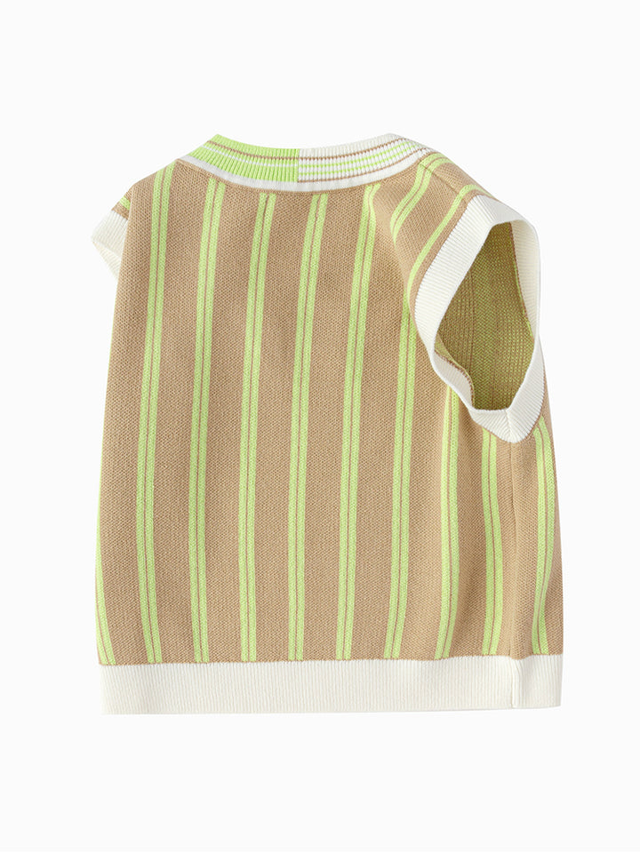فيست صوف بدون أكمام، مزين بنمط مخطط وطبعة صغيرة على الصدر من الجهة الأمامية، يأتي بياقة على شكل V