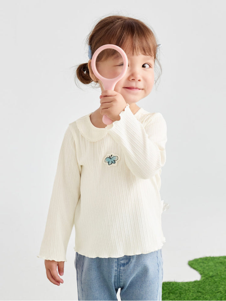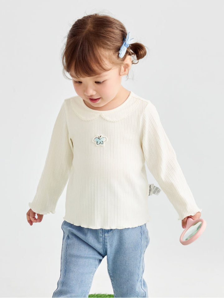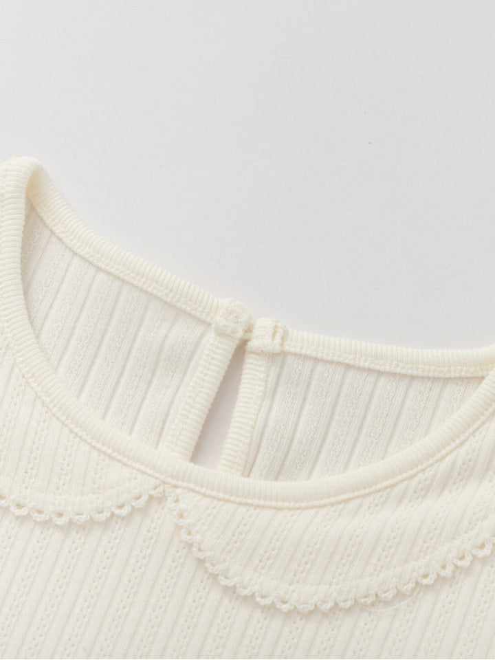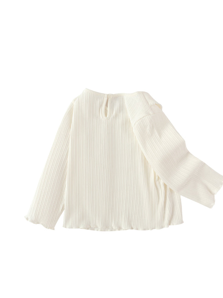 بلوزة بأكمام طويلة بتصميم محاك ومزودة بياقة مموجة ناعمة، مزينة بتفصيلة مطرزة على الصدر. خفيفة ومريحة، مناسبة للاستخدام اليومي.
