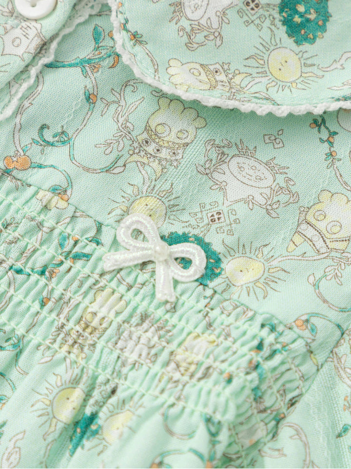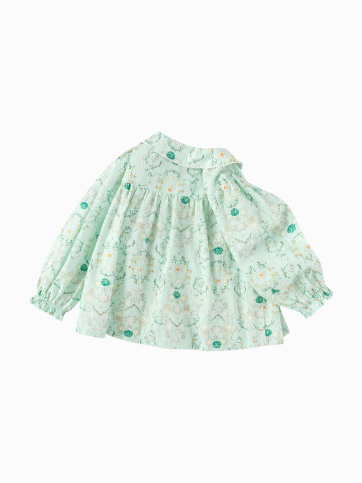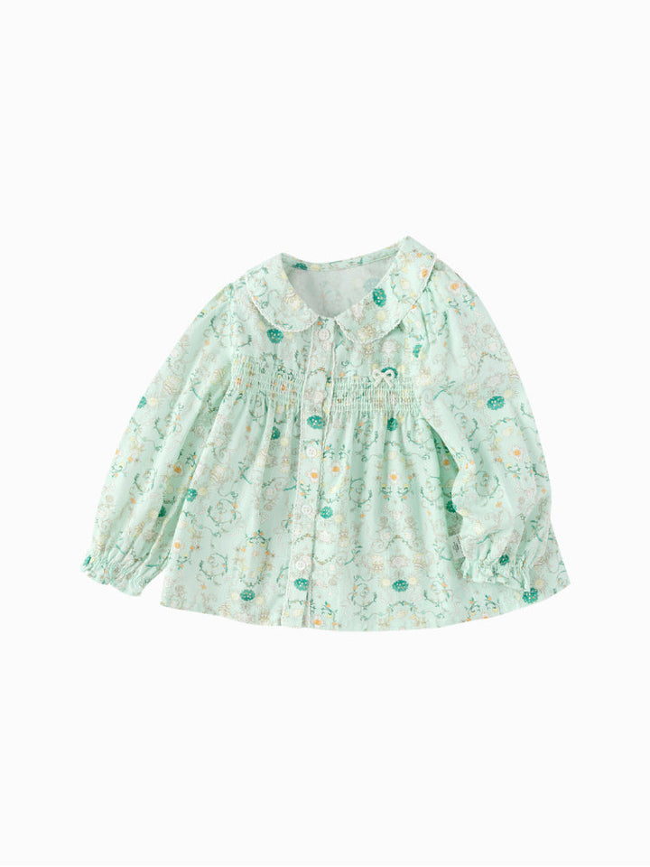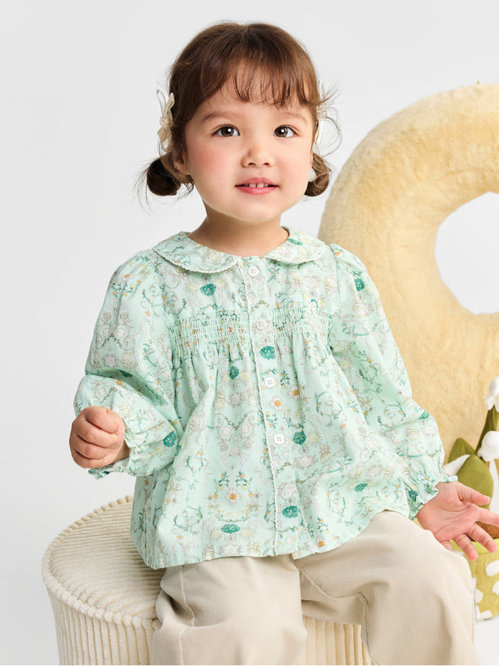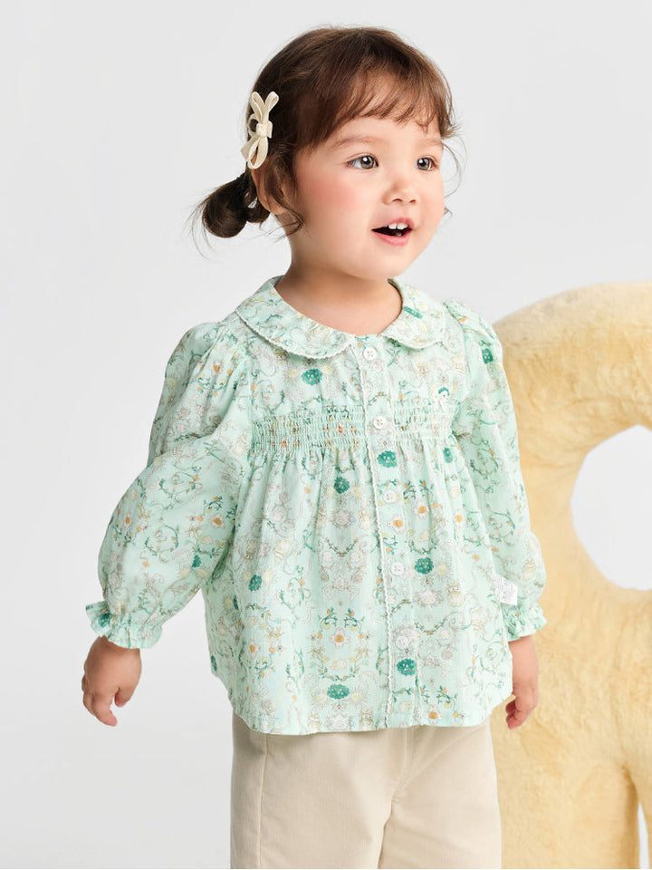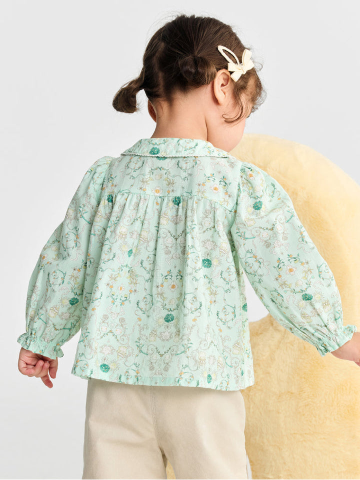 قميص خفيف مزين بطبعات زهرية ناعمة، يتميز بياقة مستديرة وكشكشة أمامية وأكمام مطاطية بلمسة كلاسيكية أنيقة.